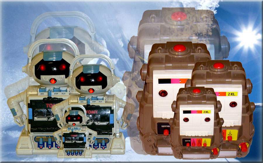 | 2-XL Talking Robot TM by Tomy TM and Tiger Electronics TM and by Mego: TM Best Learning Toy! The eyes lit up and they flash in a steady pattern, and the mouth light blinkes in time with what he was saying and runs on standard audio cassettes. Push that question button without being told to and he really let you have it! - This is a Talking Robot with a mind of its own. For a more Detailed History and Comprehensive Overview of 2-XL Robot go to :The World of 2-XL Web Site |