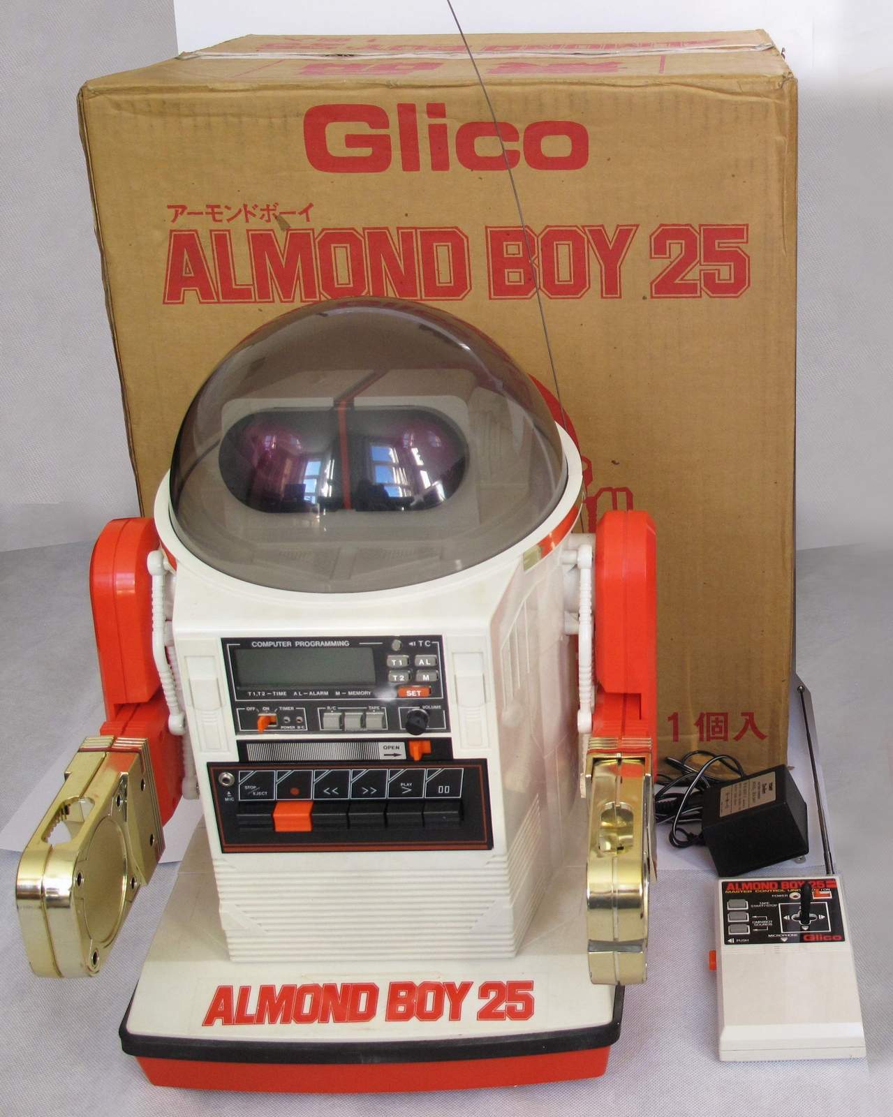 Tomy Omnibot Almond Boy 25 for Glico - The Almond Boy had a cassette tape player built into the chest area of the robot, which slid out like a drawer to reveal the cassette and could record and playback sequences of commands, as well as regular audio recordings.