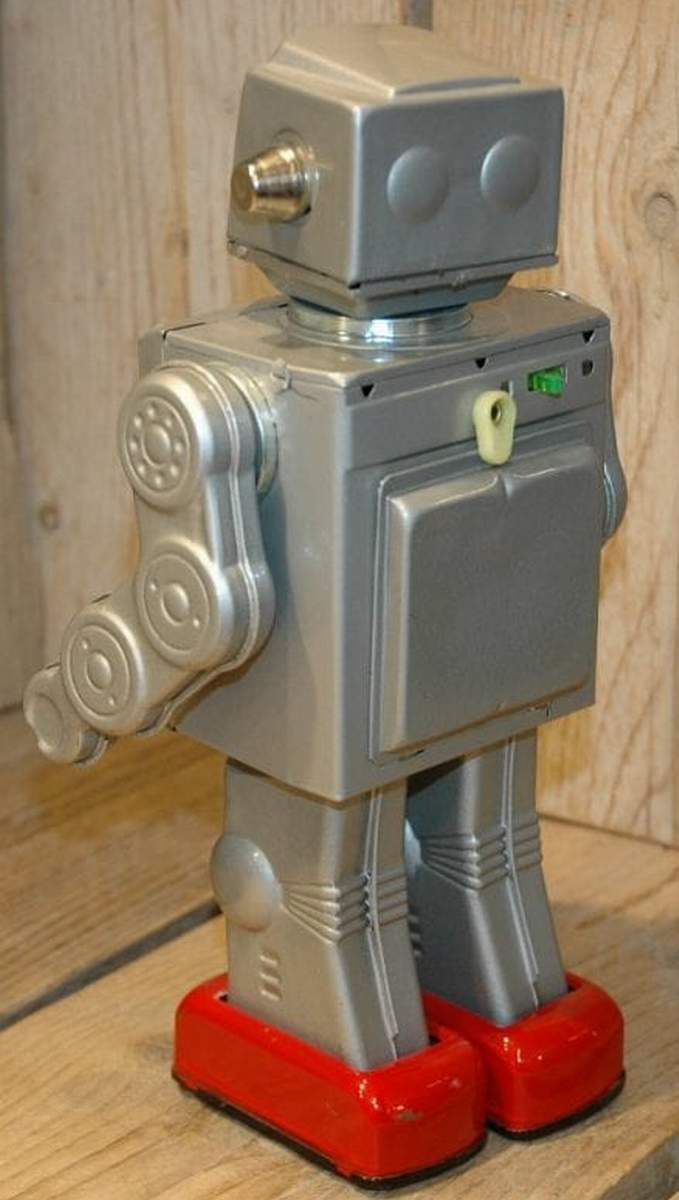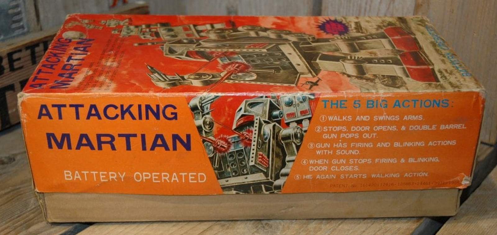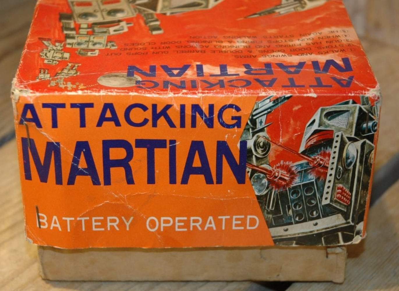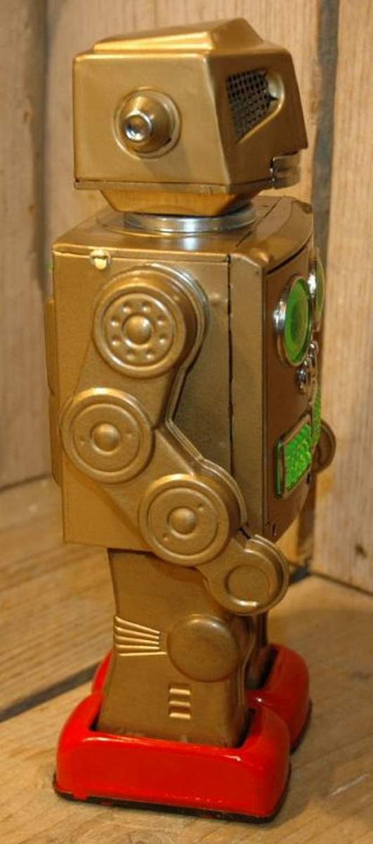 Attacking Martian robot, battery operated, stop'n go, blinking and pop out, shooting gun, realistic shooting noise, positioning arms. Earliest versions have large tin arms and and the white tin battery box and silver metal chest pane. - Through the Courtesy of : : Vintage Spacetoys by Bunte, HallmanMueller (Netherlands) : a l p h a d r o m e - The Home of Vintage Tin Robots (U.S.A.) |