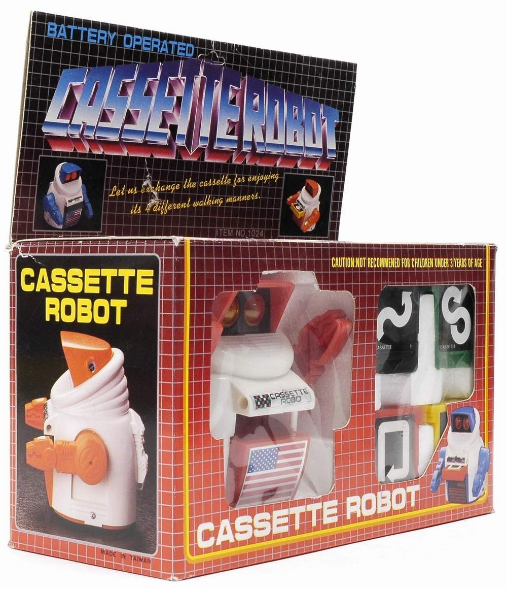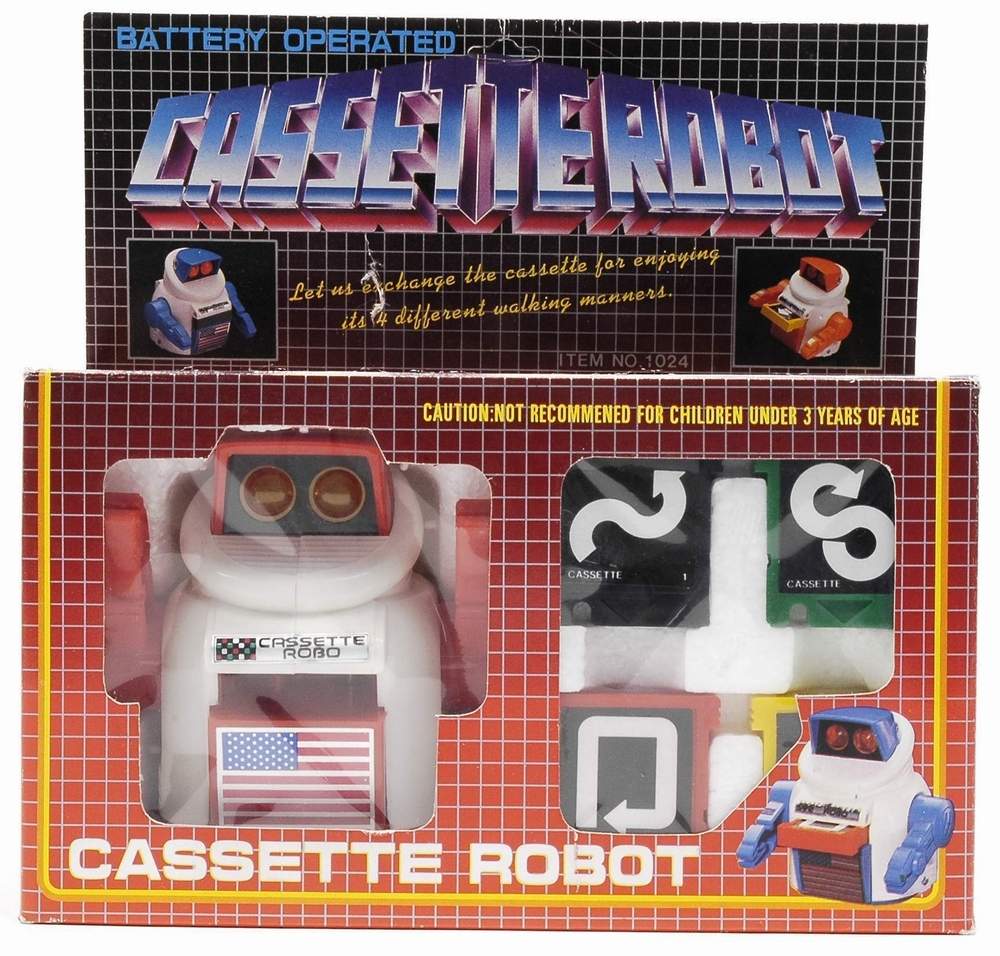 SmartBot / Cassette Robot / Disc Bot - Battery operated robot with four interchangeable cassettes to program his direction ; Cassette robot stands 4" tall, plastic construction with USA flag ; Early computer-era robot lets you "program" its actions by selecting a cassette