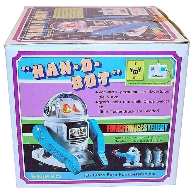 HAN-D-BOT Robot RDC-70110 - Made in Singapore by Nikko 1985. - Radio controlled, Arm picks up, lifts, puts down and carries objects by transmitter control. Foward (straight) and reverse (left turn) traveling. Eye-lights go on when turning.
