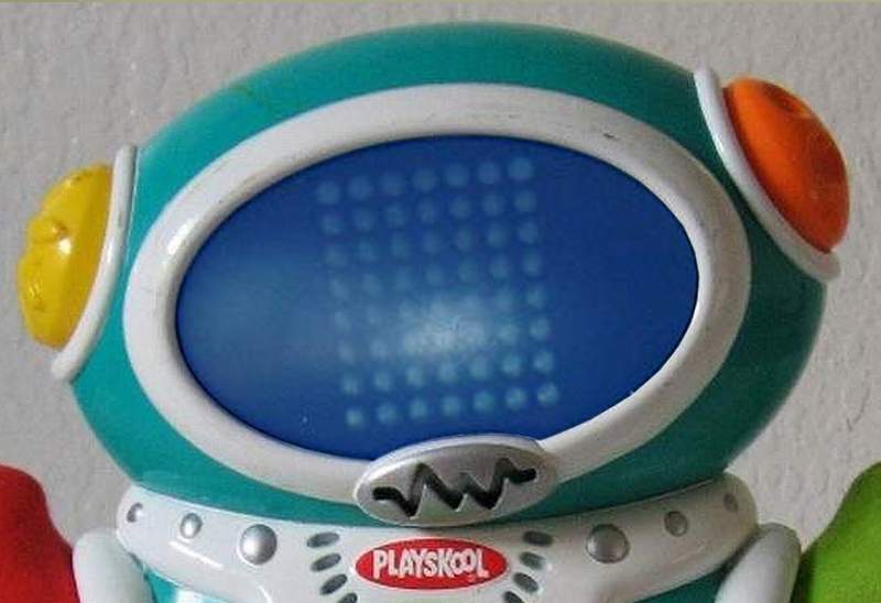 The Magic Screen Learning Pal Robot is approximately 12in. tall, and resembles a child robot – very friendly and non-intimidating. His outer casing is composed mainly of teal-colored molded plastic, with firmly-stuffed plush hands. The face of the robot is much like an LED screen, with an outer translucent blue plastic screen and rows of small green lights. It’s ears are large buttons, one yellow, and the other orange. These buttons activate a variety of activity. The hands also activate activity by pressing them. They are color-coded as well, with one red and one green. |