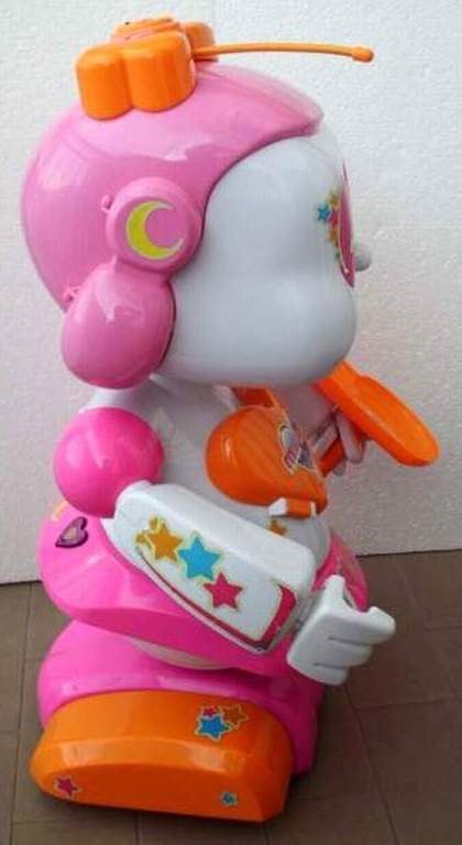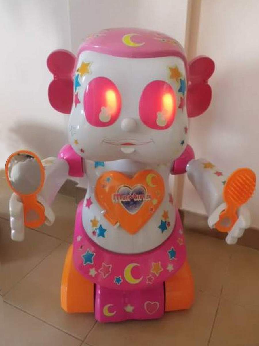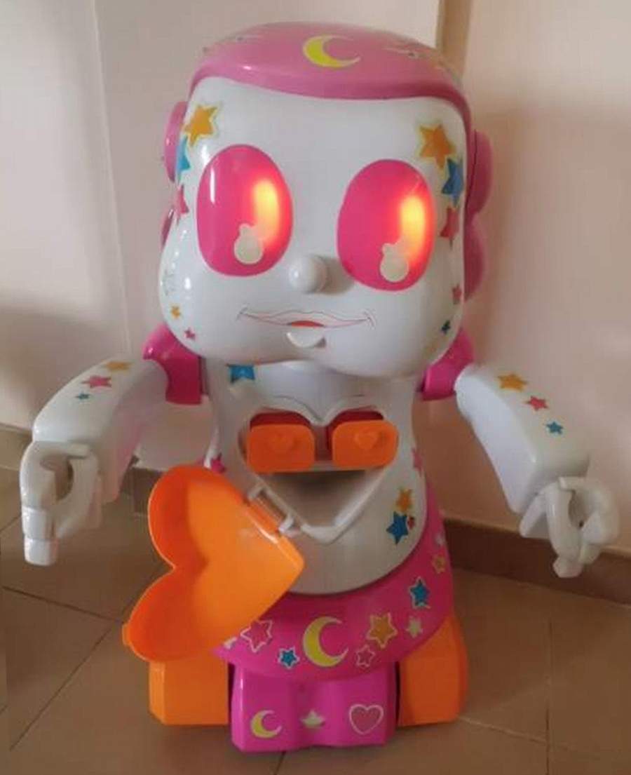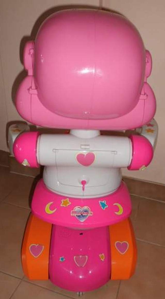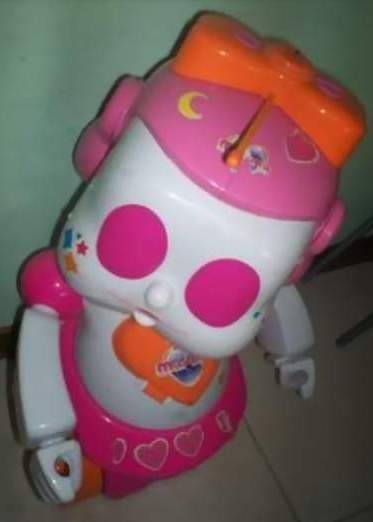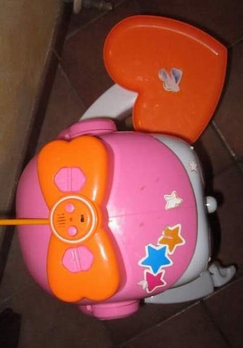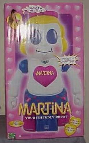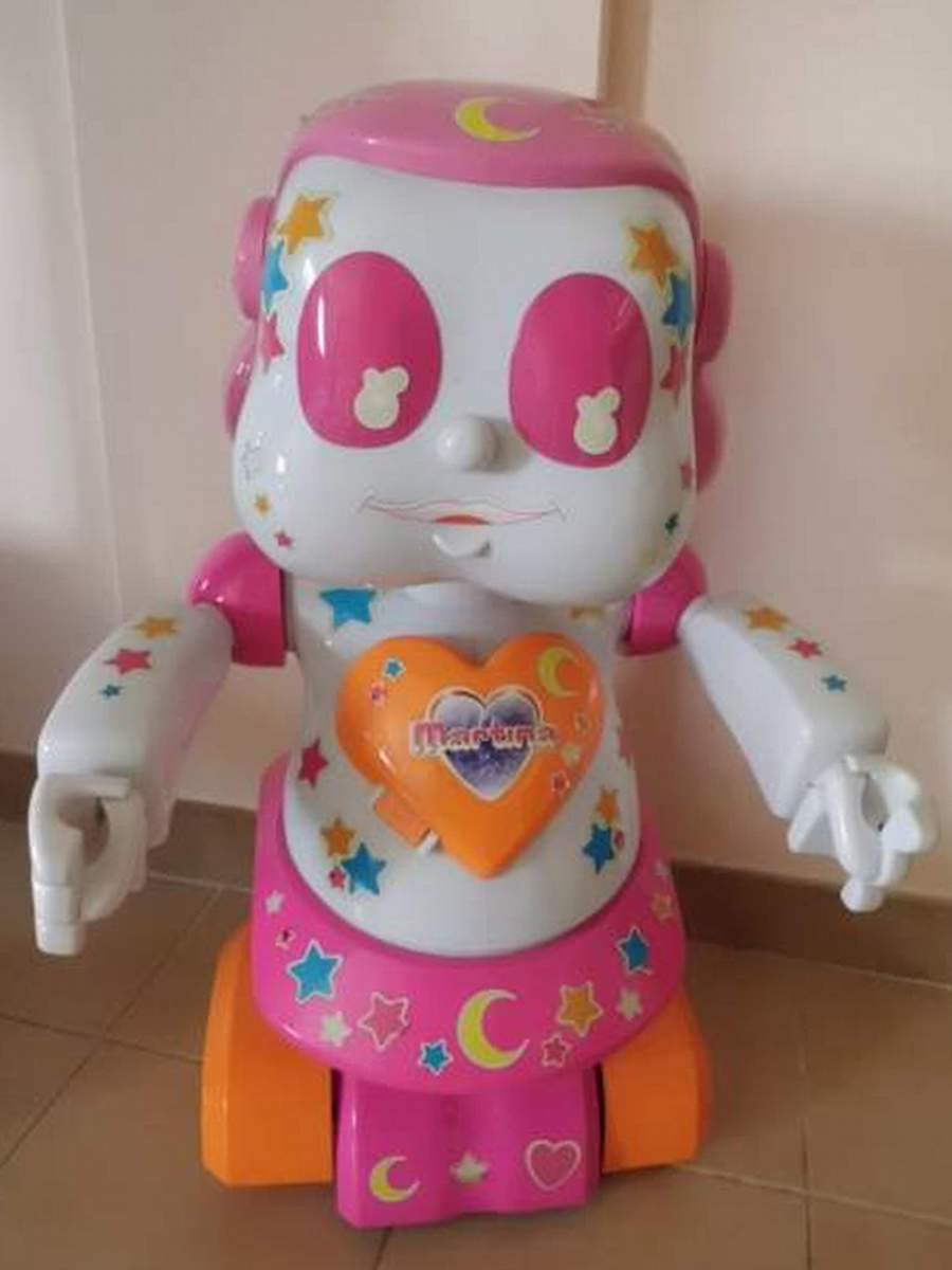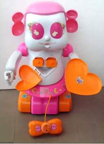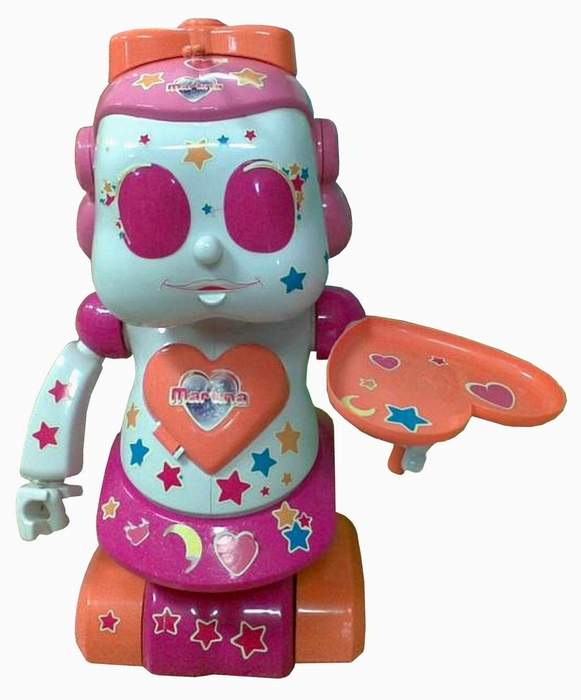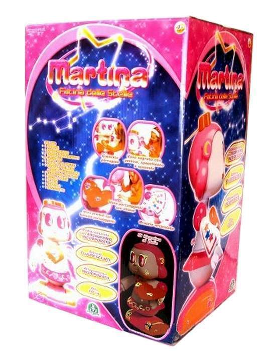 | ROBOT MARTINA CUORICINO hits for a variety of functions that gives the child has a remote control. Infatti more powered by a 9 volt battery in the form of BOW placed on the hair, which also operated from a distance, allows it forward, backward, steer and parlare. Has articulated arms and hands grasping, and can hold small objects, and a heart-shaped tray, inserted between the fingers of one hand; In Supplied with a secret in a Notebook compartment on the back with closed lock; But the most surprising thing is that you can talk to Martin with three different tones of voice (normal, digitized, robotic), while the voice is actually that of the girl who is transformed! So you will discover other tasty surprises MARTINA. Prodotto in the 90s by Giochi Preziosi. |
