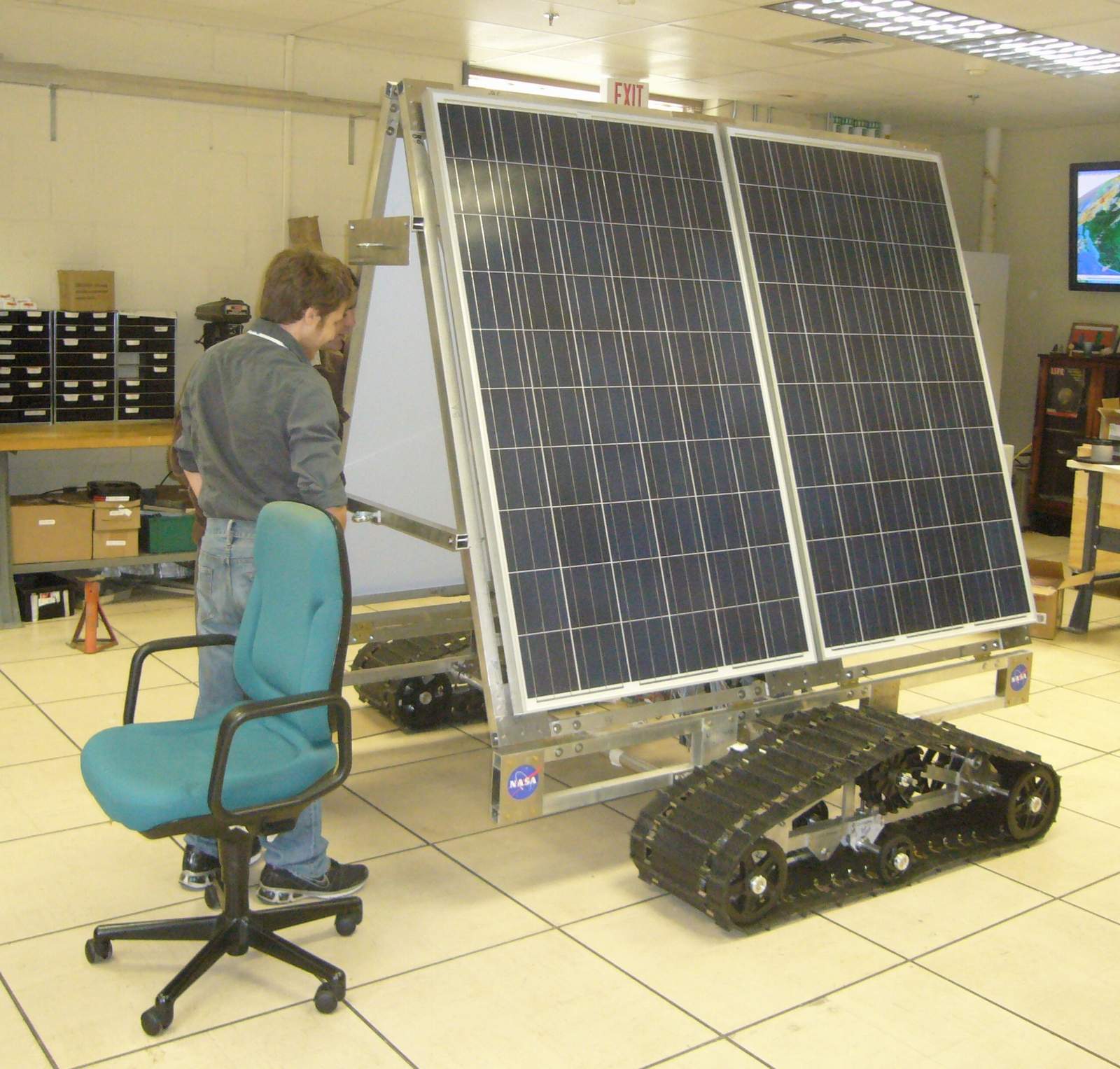 Grover prototype at Goddard Space Flight Center. Solar panels on each side. Tracked base. - Click to Enlarge |