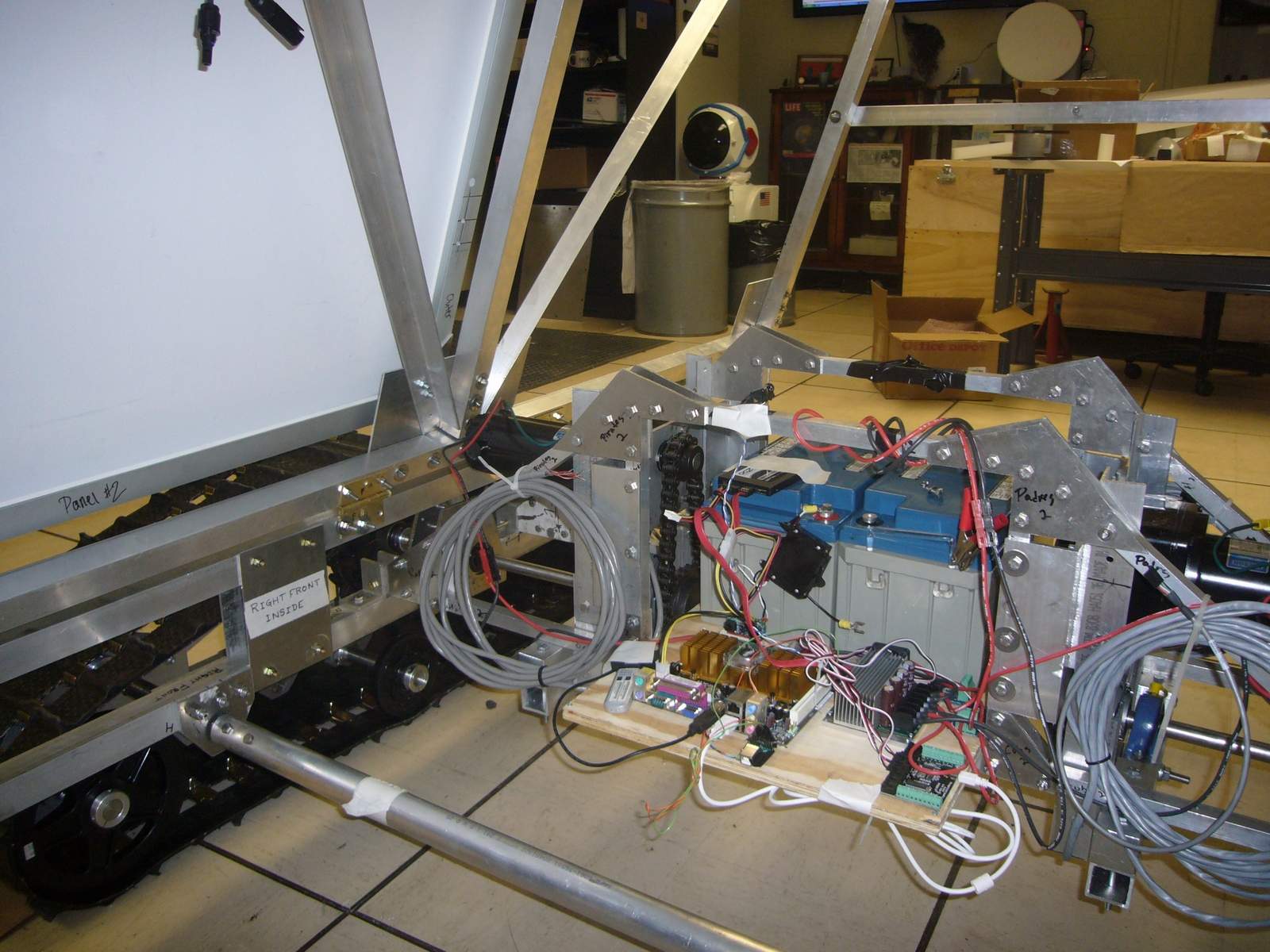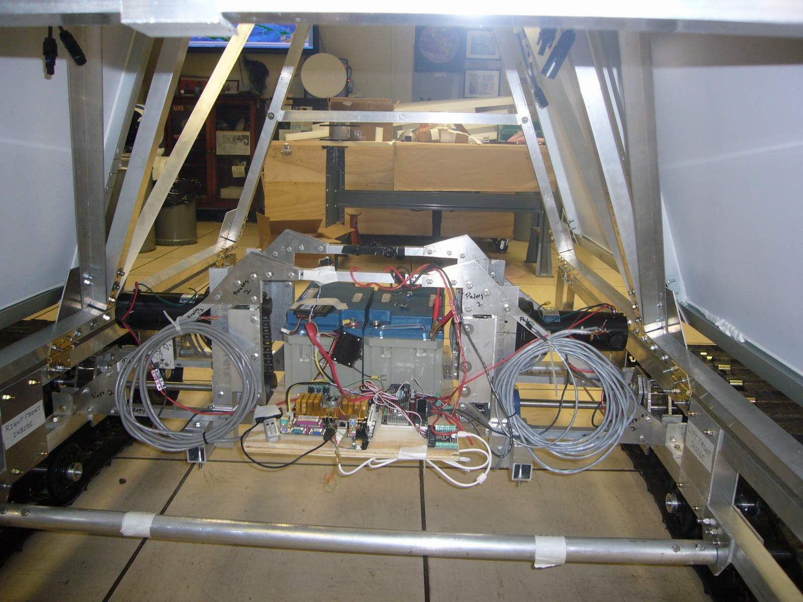 In the lab, here is the prototype electronics. Note the dual batteries, and the bare pc. The drive motors are the black cylinders at either side. Encoders were used on each side to track travel. - Click to Enlarge |
