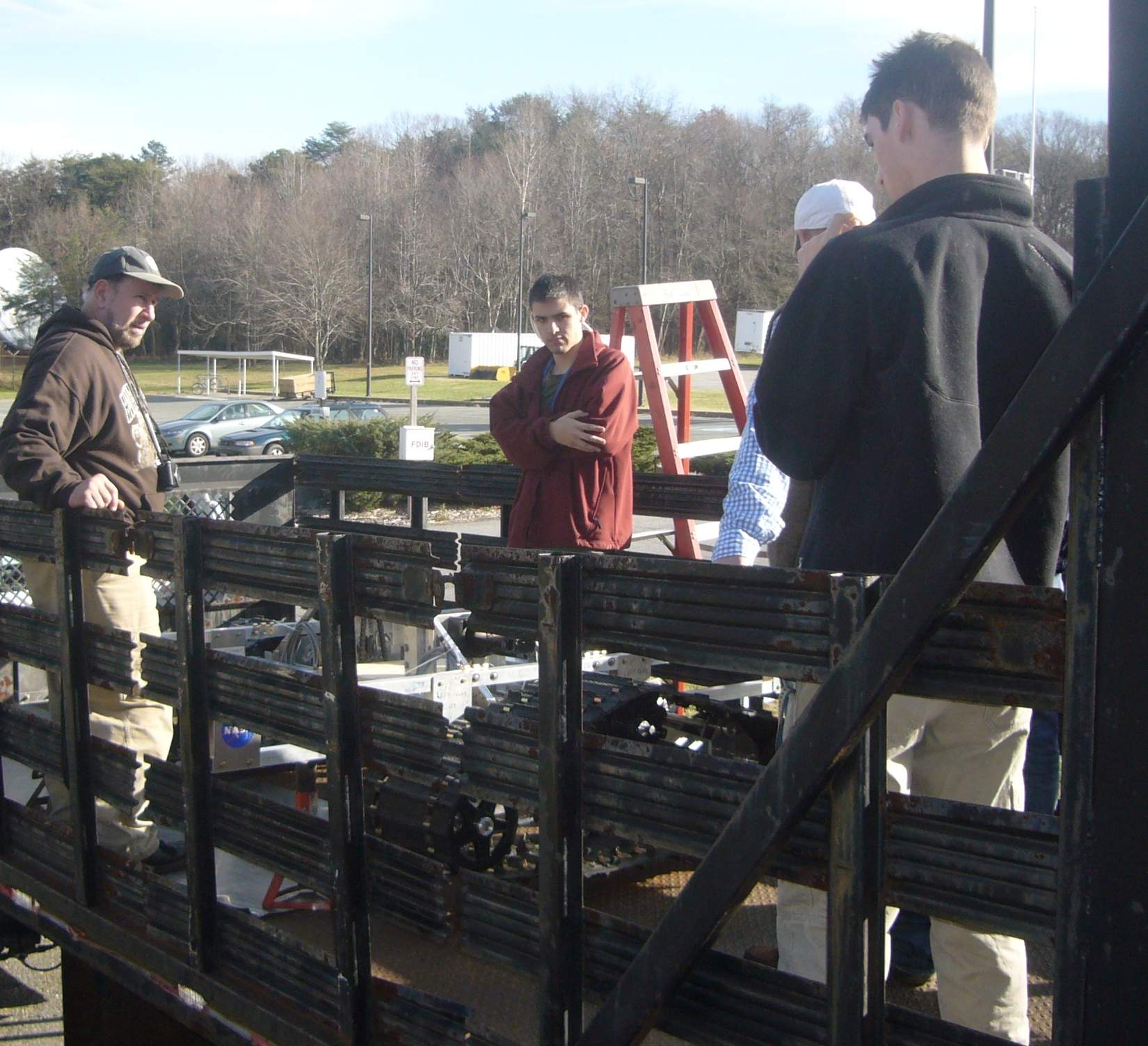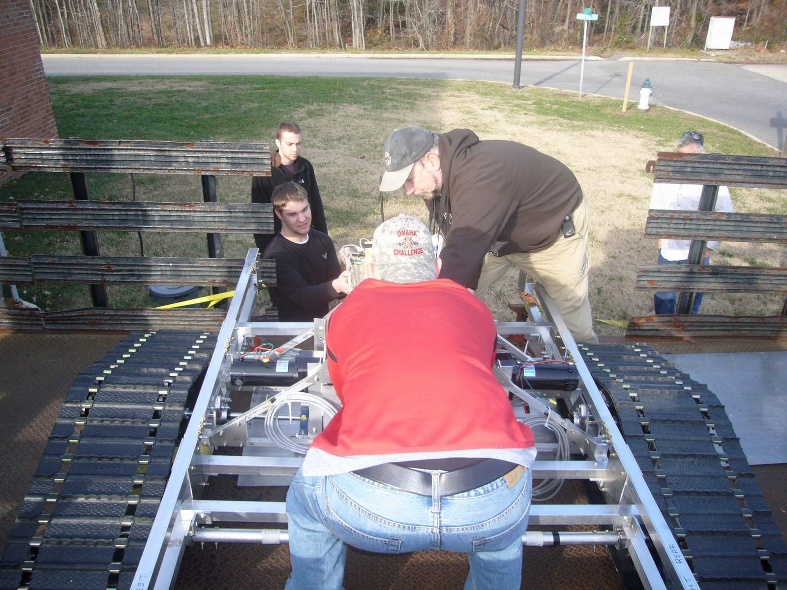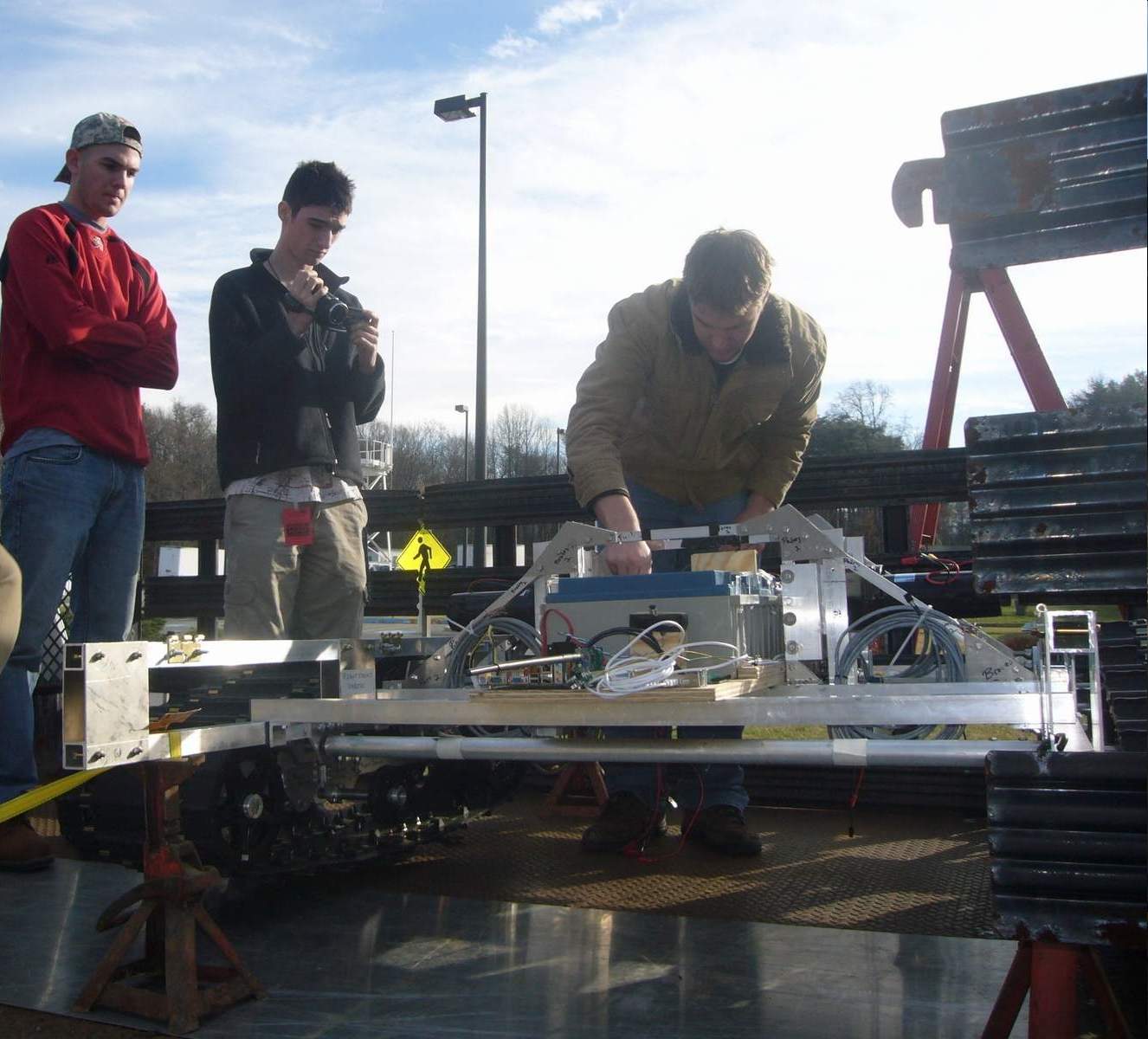 Students working on the mechanicals. In use, waste heat from the computer was used to keep the batteries warm. Click to Enlarge |