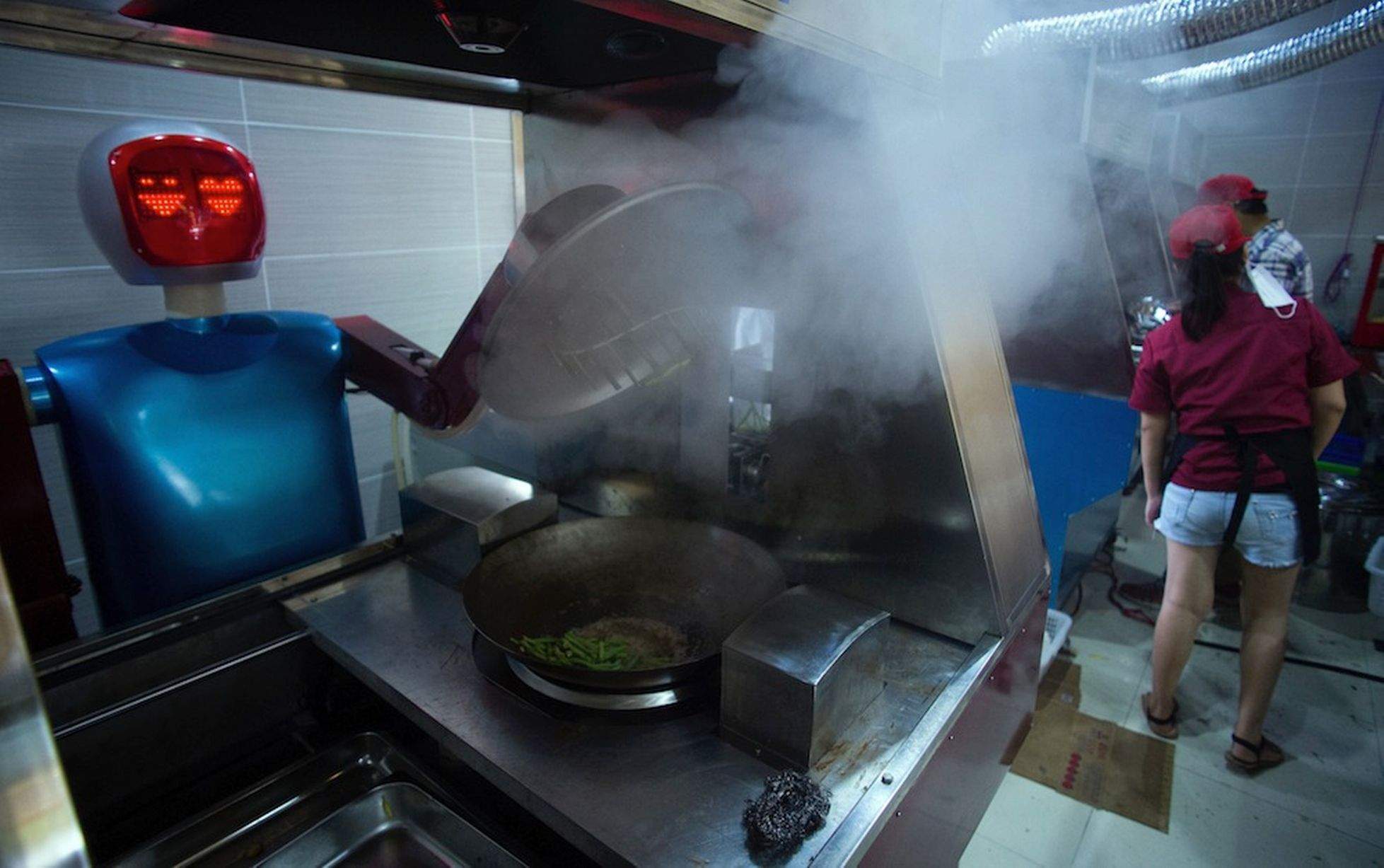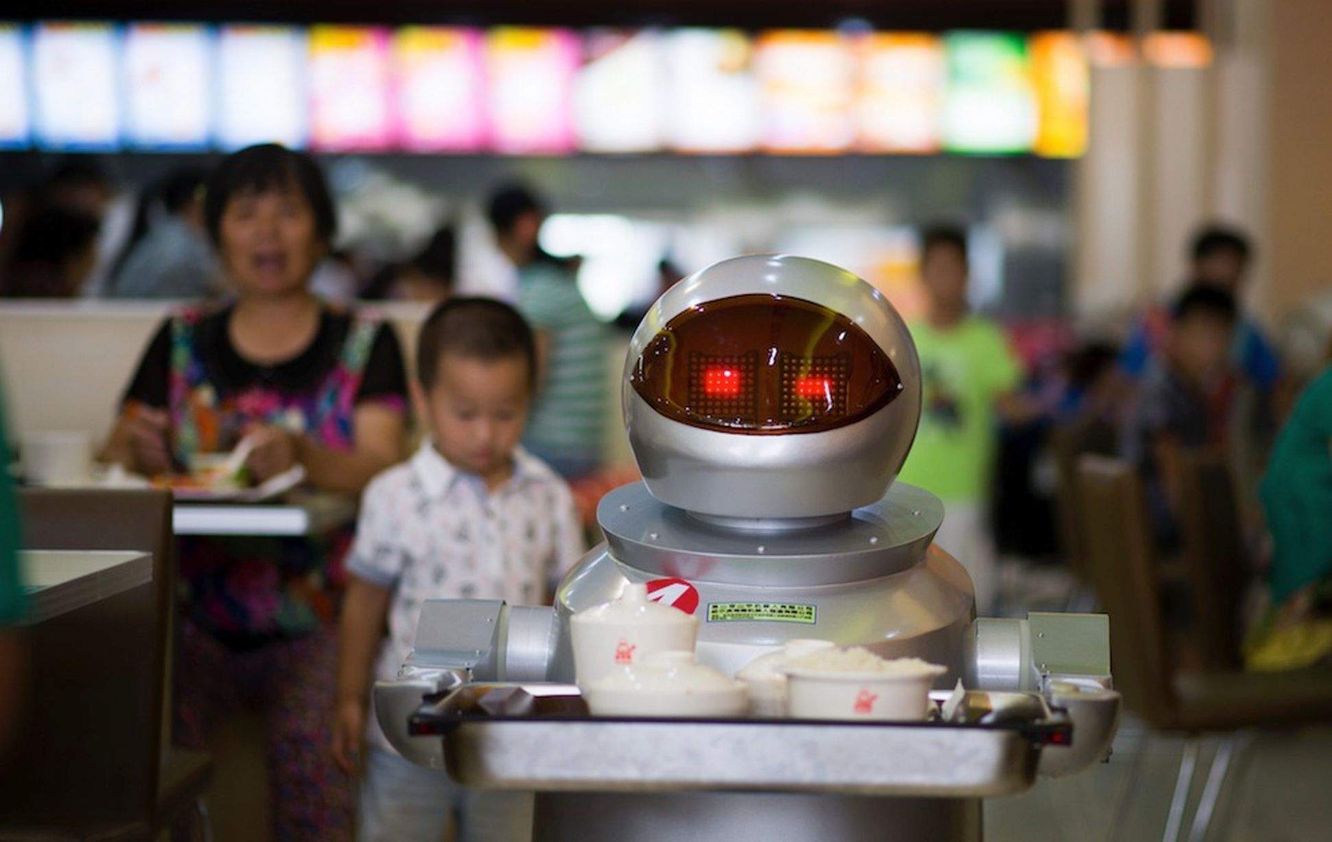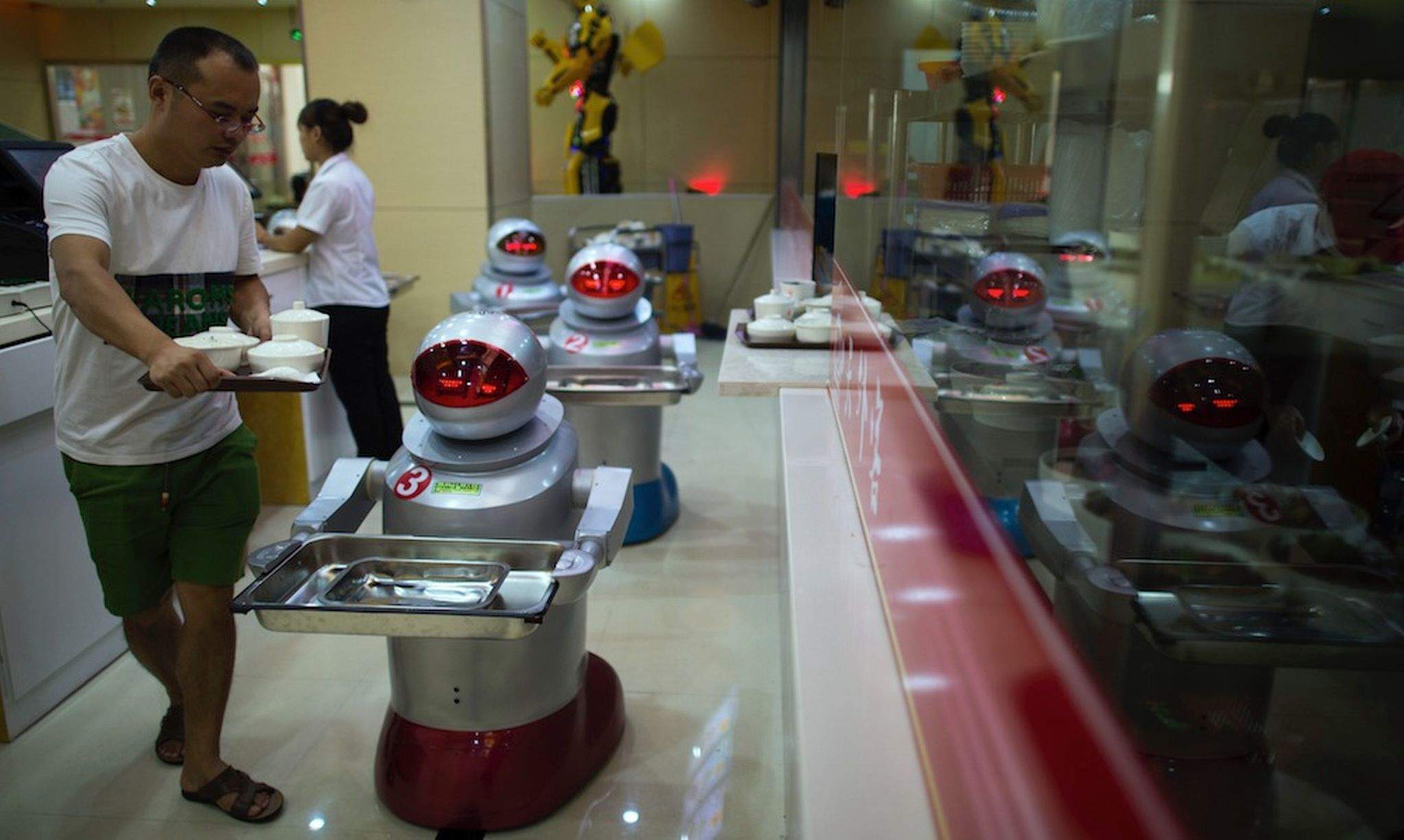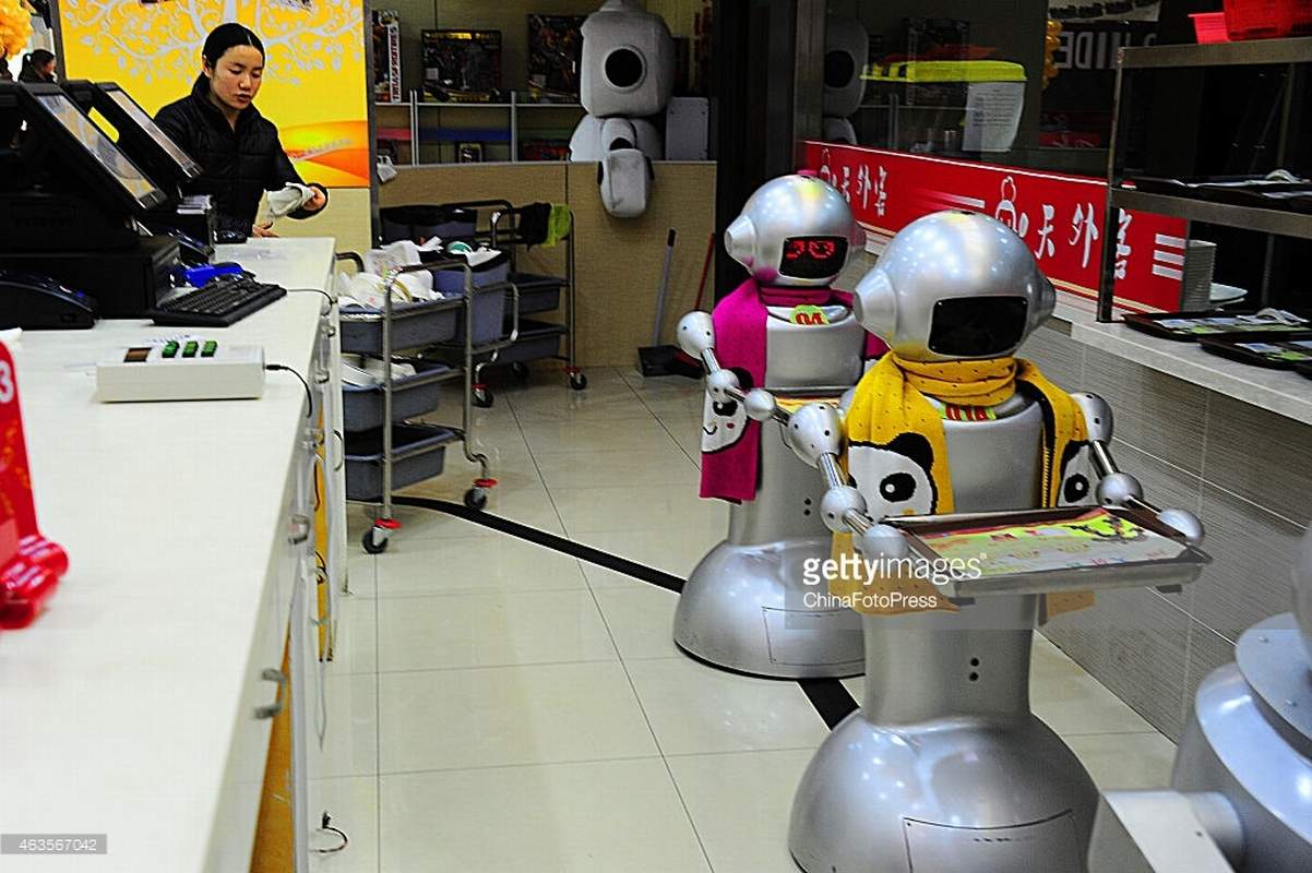 | Futuristic cafe owner Song Jugang shows that the future is here by hiring robots workers to cook and serve customers. A robot carrying food to customers in a restaurant in Kunshan. It may sound like a scene from a sci-fi movie but a new café in China is running its restaurant using robots. Located in Kunshan, eastern China, the restaurant relies on over a dozen machines for tasks such as greeting customers, waiting on tables and cooking basic meals. The eatery becomes the third café in the world to rely on the use of robot employees, potentially giving a glimpse into how future businesses could operate. Speaking to a local newspaper, owner Song Jugang explained that the robots cost around £4000 - The same as the yearly pay for a human employee. There are drawbacks to using the robots which is why Mr Jugang still relies on humans, hiring a handful to work in the kitchen and cook dishes too complex for their mechanical countrparts.