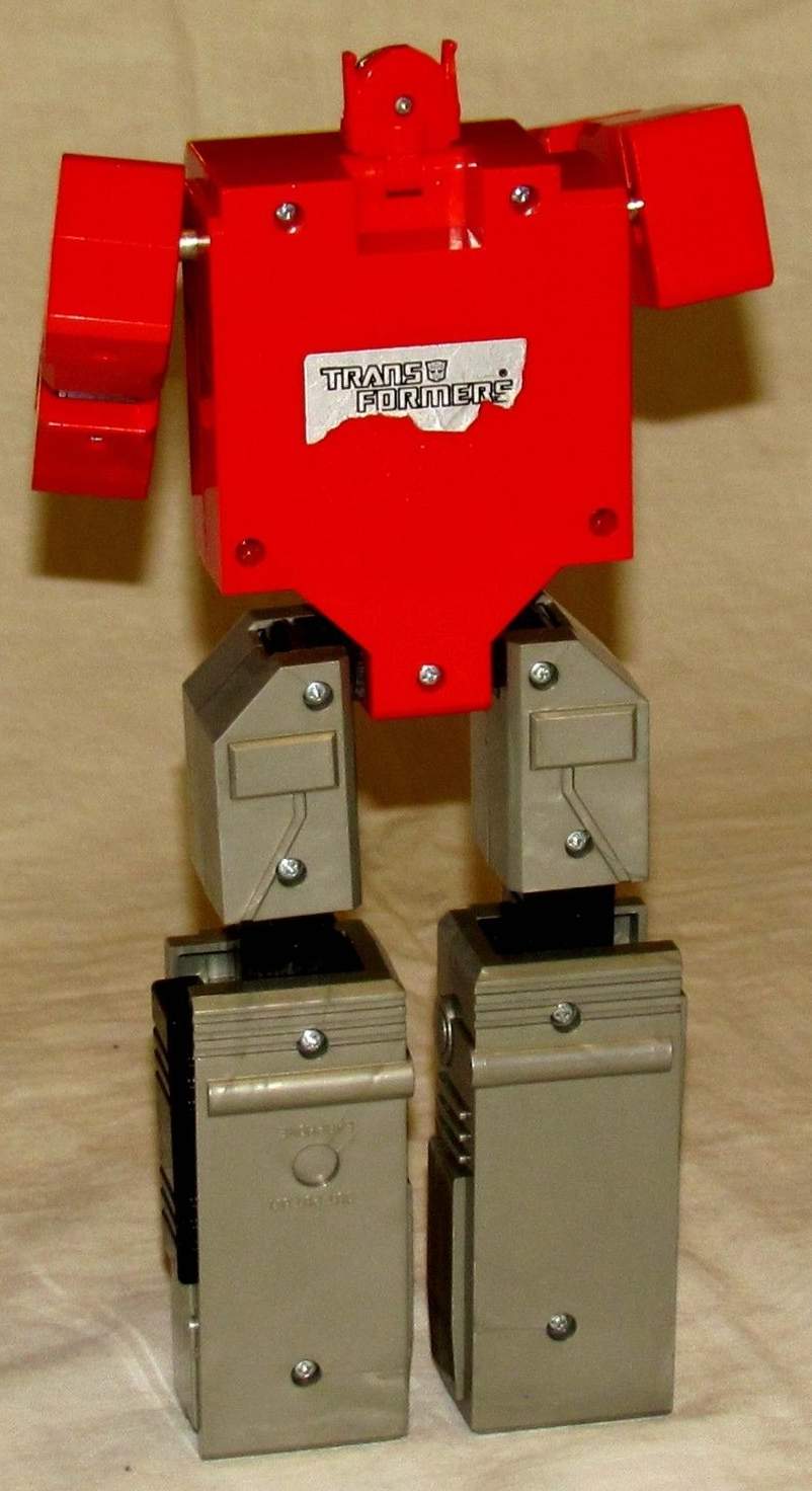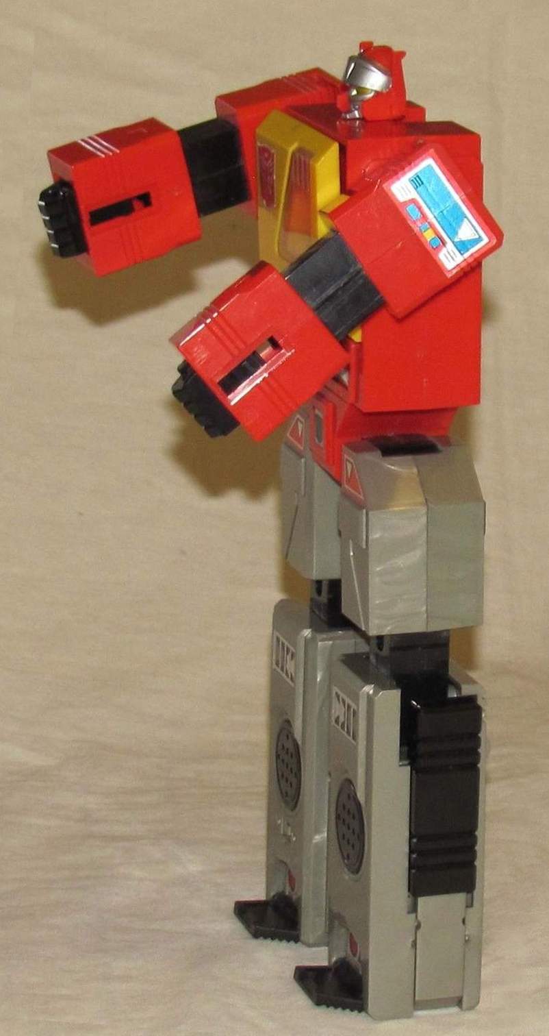 Robotic Radio by Tai Fong TS-558, Taiwan 1984 - The Robot transforms from a boombox figure measuring 6.7 x 4.3 x 1.8 inch, to an upright robot! This AM robot radio is a plastic collectable that takes 2 AA batteries in the plastic compartment that slides open underneath the head and which transforms into the handles. The loudspeaker is underneath the tape deck in the front side.