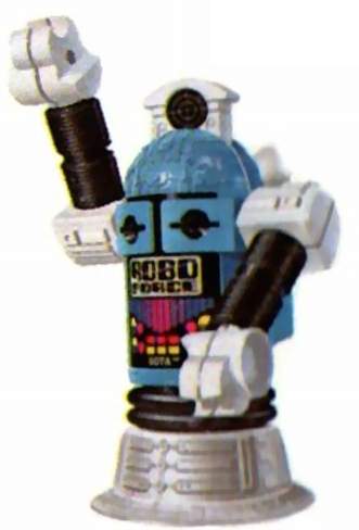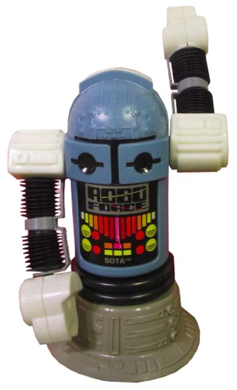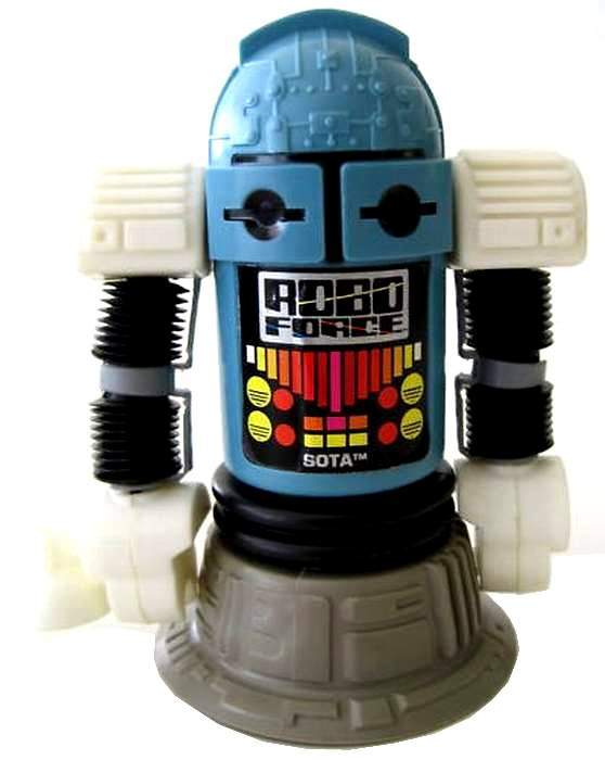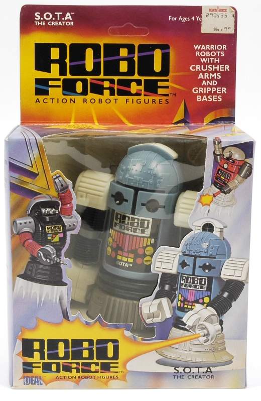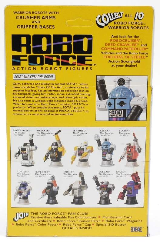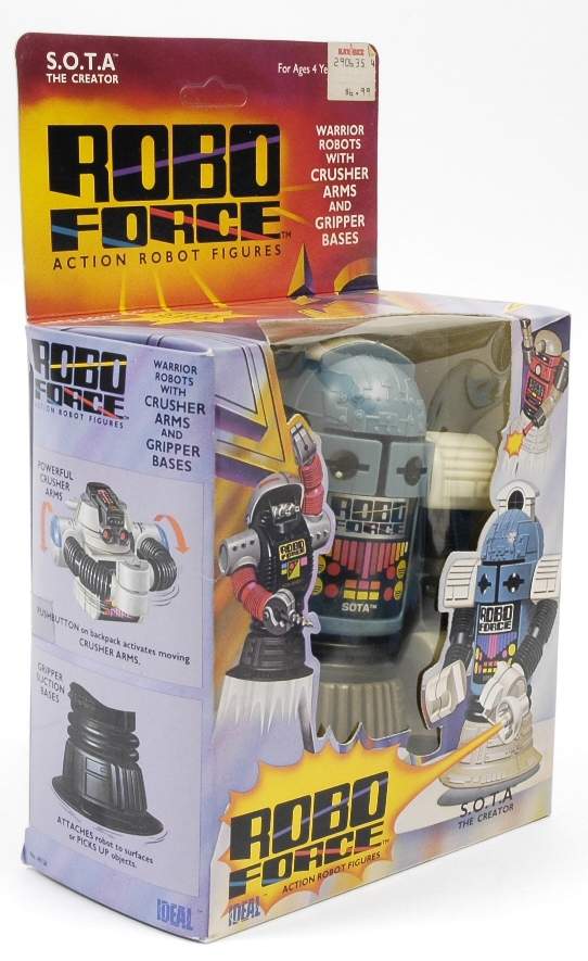 | S.O.T.A The Creator by CBS Toys. Calm, collected and always in control, SOTA™, whose name stands for "State Of The Art", a reference to his superior intellect, has an information-collection dish on his backpack, giving him radar, sonar, extended hearing, infra-red vision, and microscopic and telescopic vision. He also touts a weapon sight mounted inside his head. When he's not on a Robo Force mission, SOTA™ is a professor. When trouble threatens, SOTA™ puts his mental powers at the disposal of MAXX STEELE, to whom he is a most trusted senior councilor. Made by Ideal. |