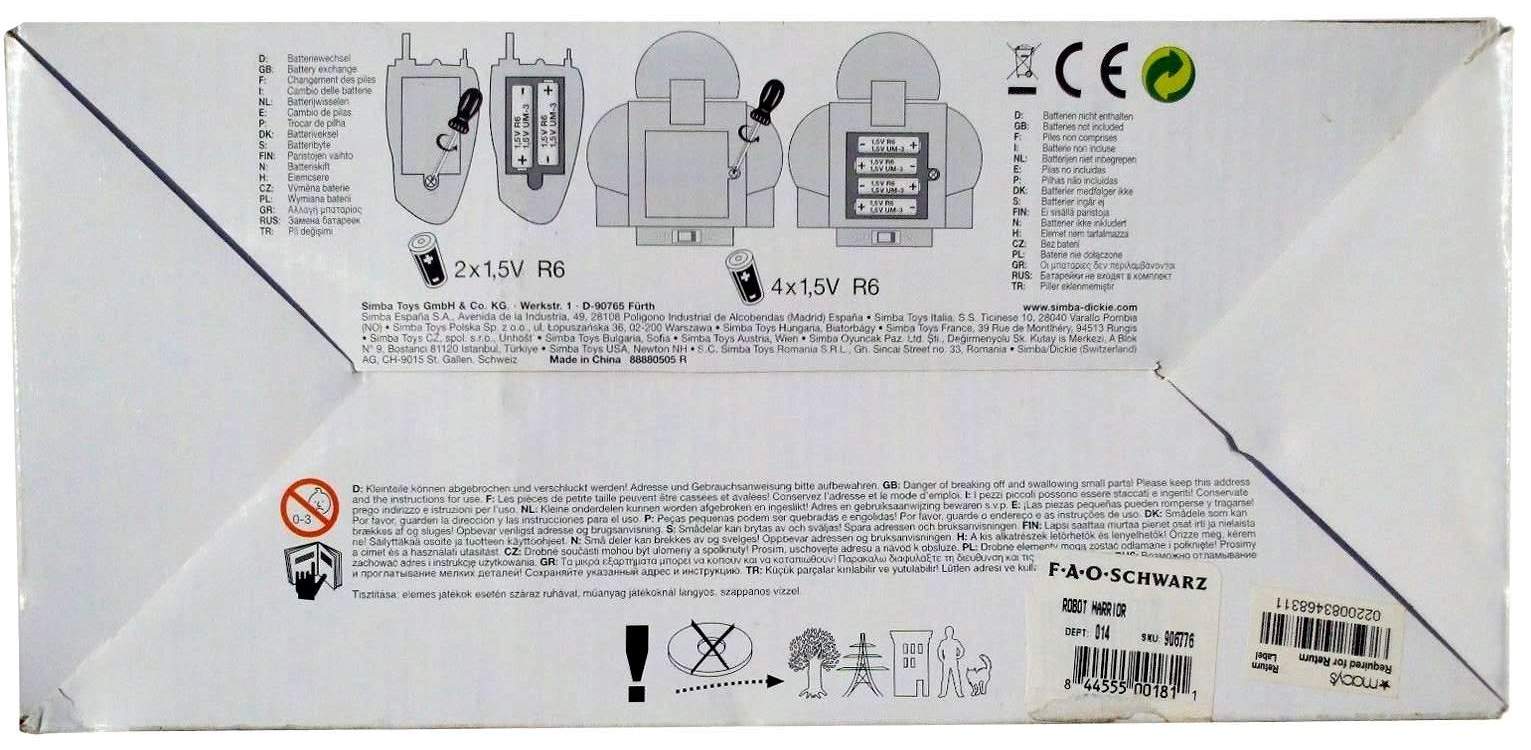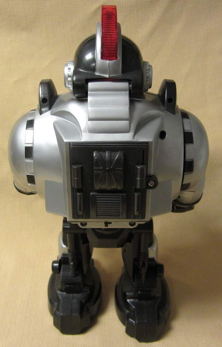 Planet Fighter Robot by Simba - This fully functioning robot performs a host of life-like duties that you won't believe! Using the remote control, you can make it walk and slide in all directions, talk, and even fire green discs from its chest. Lights and sounds accompany its movements. Includes easy-to-use remote and 24 soft foam discs. Requires 6 "AA" batteries, included. Measures 12.5"H x 7"W.