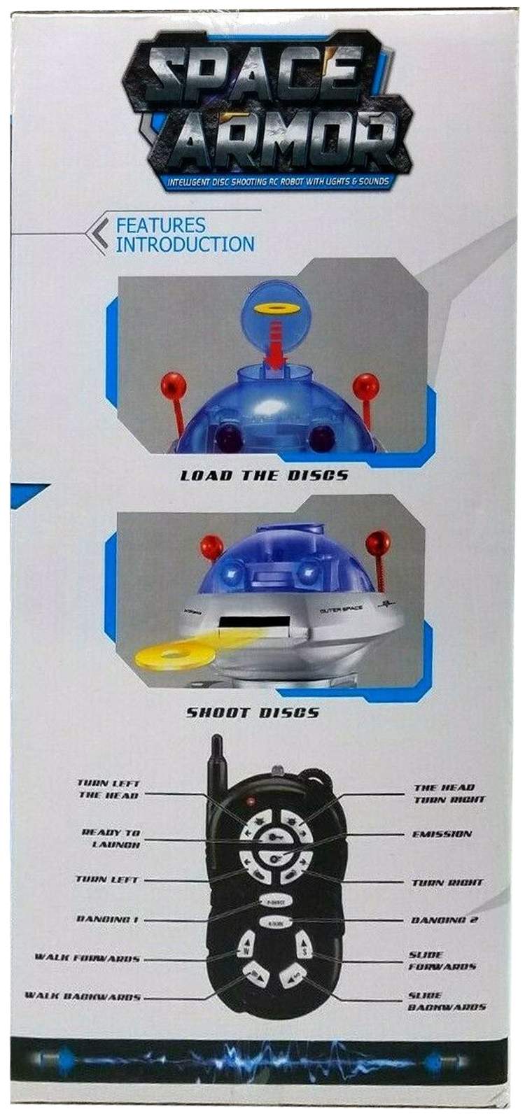 | Space Armor Robot No. 27107 - Infrared remote control robot with walking, talking and shooting functions. Controlled via the intuitive remote control, the robot can walk back and forth, turn left and right, and rotate his head to take aim with the head mounted disc launcher. Lights up when in operation and makes a series of typical robot noises. To top it all off he even dances on command, accompanied by his own backing music. |