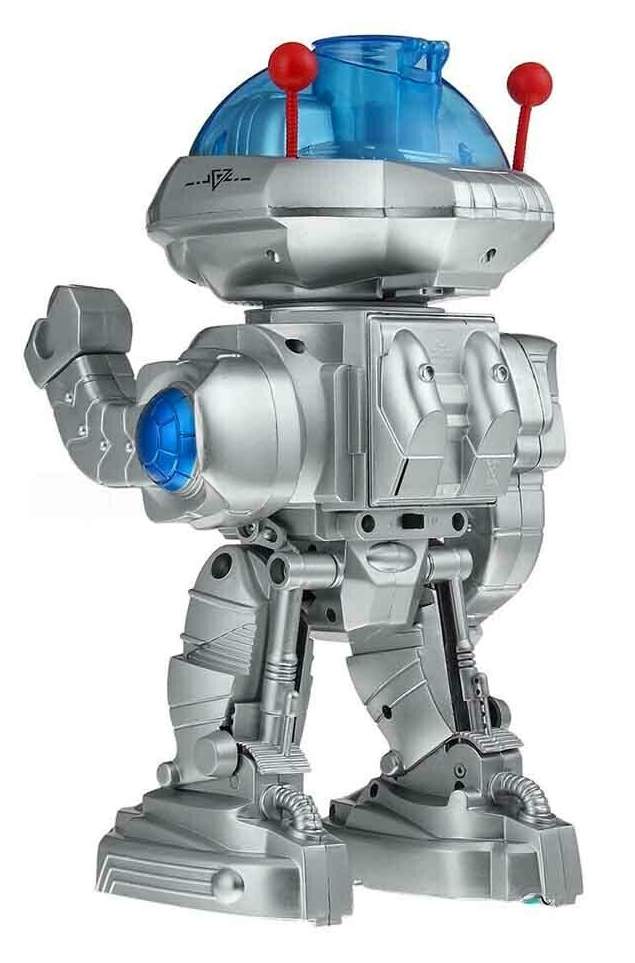 | Mighty Mike Robot No. 6018409 - Vintage Magic Mike Toy Robot Sector 7 Walking Talking Dancing Singing Shooting, Walks, dances, sings, and shoots soft foam discs, full infrared function remote control. Infrared remote control robot with walking, talking and shooting functions. Controlled via the intuitive remote control, the robot can walk back and forth, turn left and right, and rotate his head to take aim with the head mounted disc launcher. Lights up when in operation and makes a series of typical robot noises. To top it all off he even dances on command, accompanied by his own backing music. |