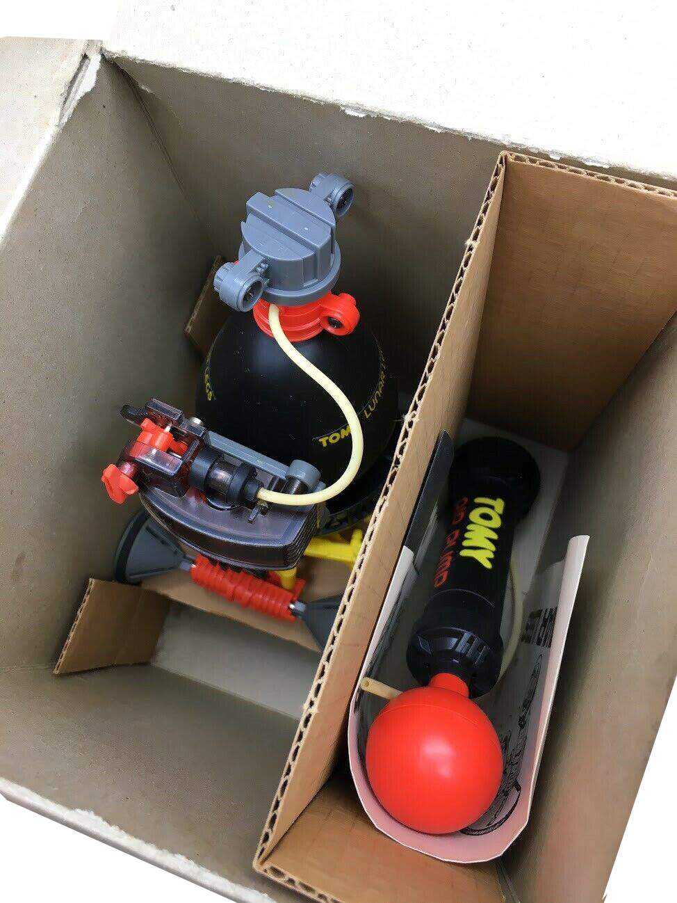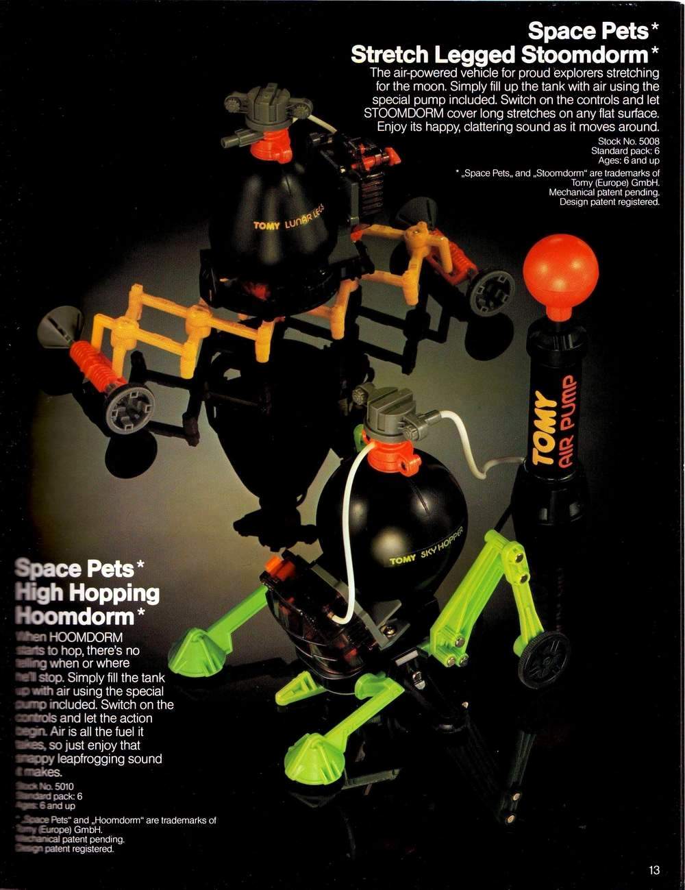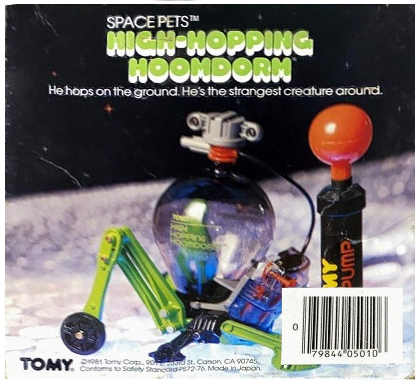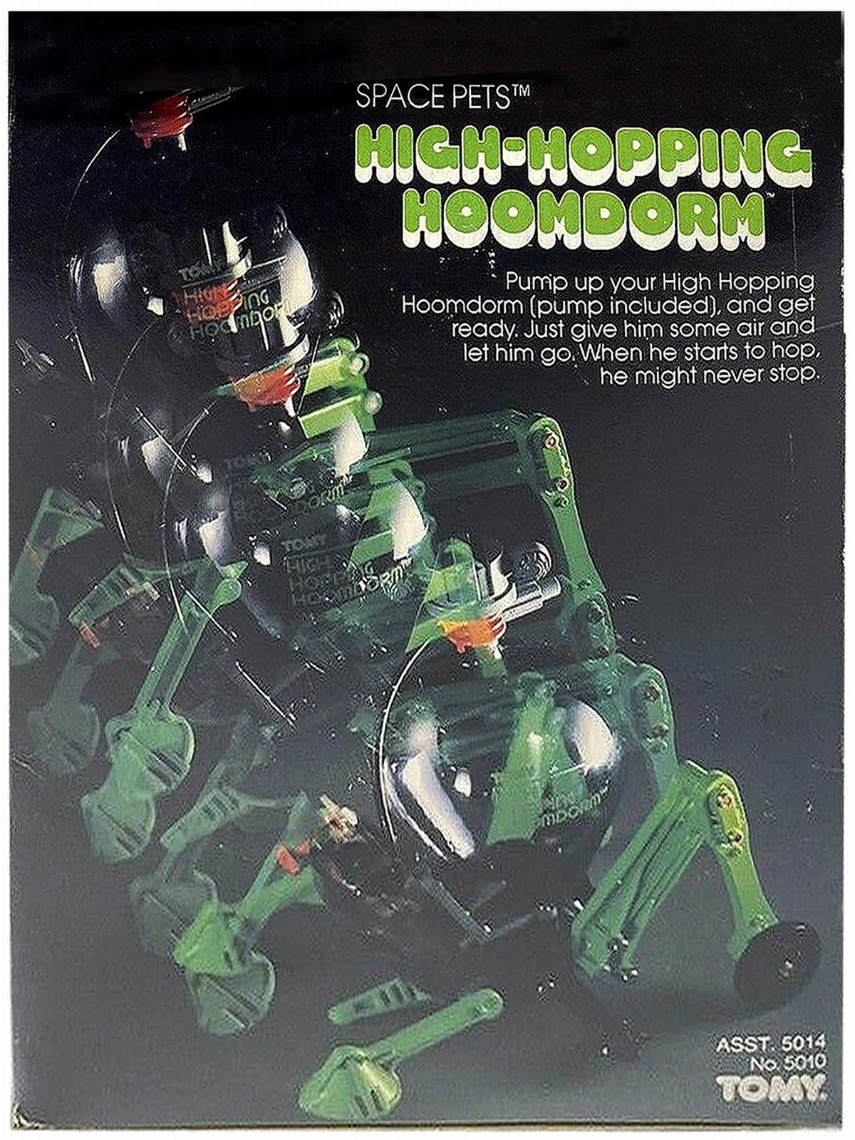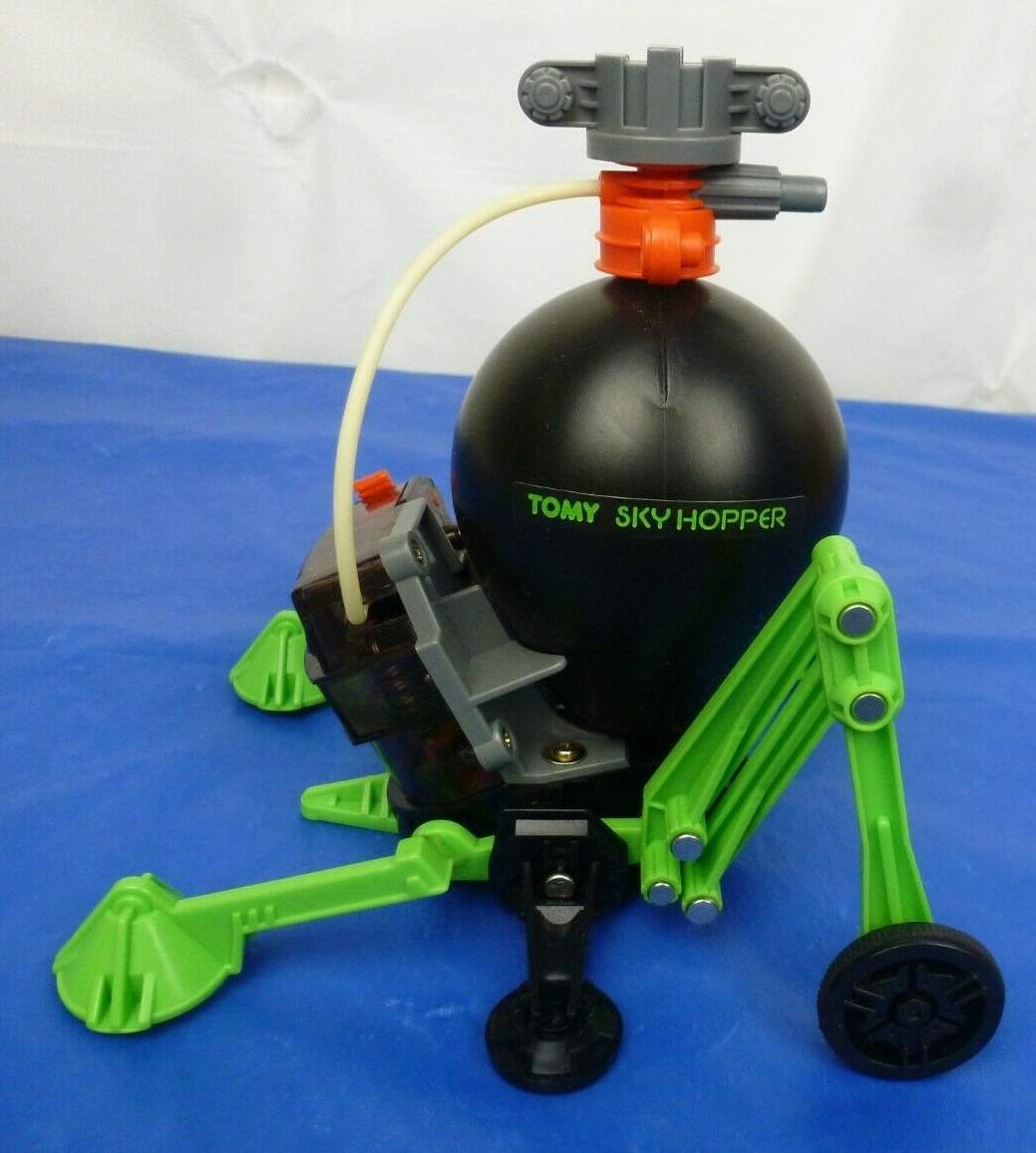Tomy ® High Hoppin' Hoomdorm / Tomy Sky Hopper - air-powered pneumatic gizmos marketed as "Space Pets. ® " This works well when pumped with air, which was something of a mechanical grasshopper that would hop furiously and erratically across the room. Pump him up, and away this creature goes. Hoomdorm Made in Japan dates from the 1980's.