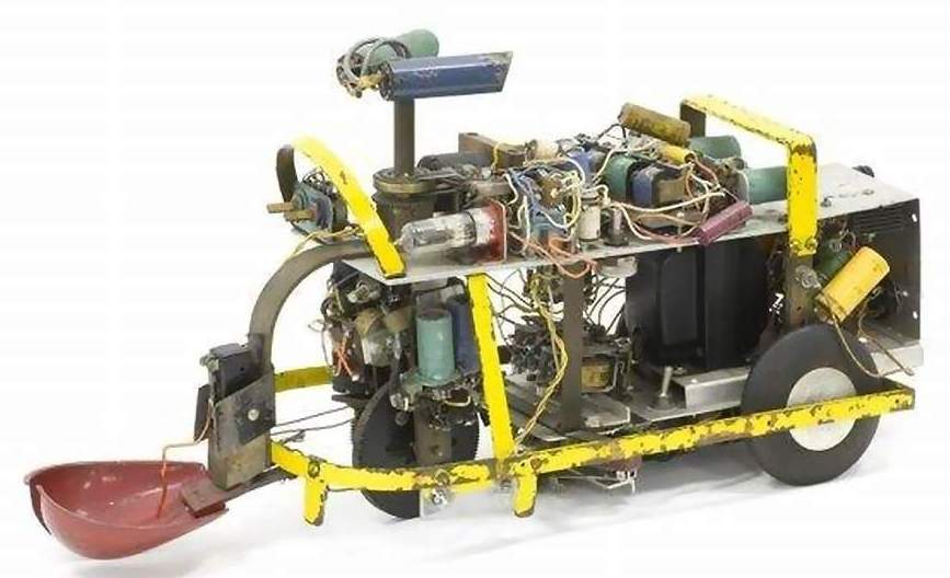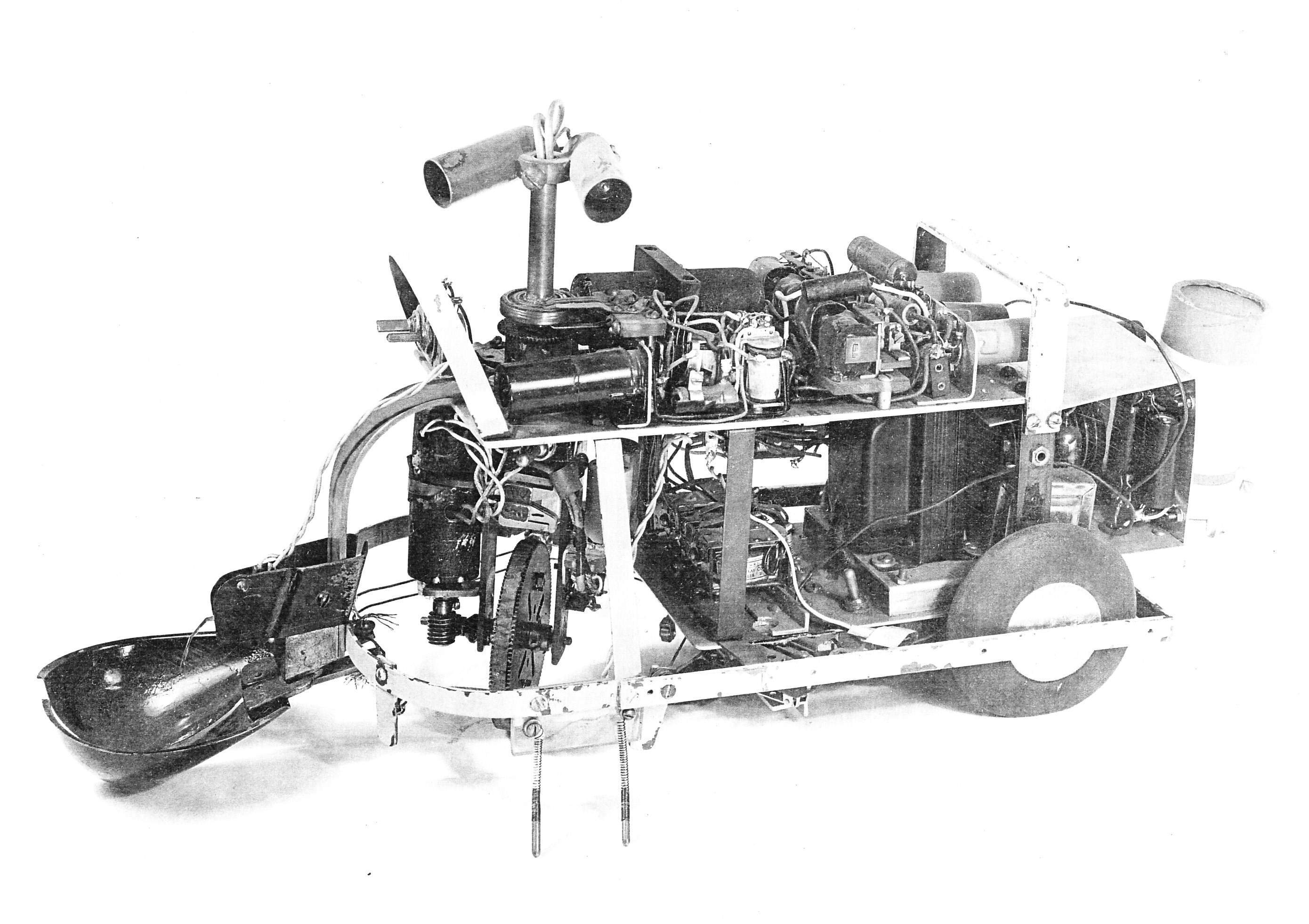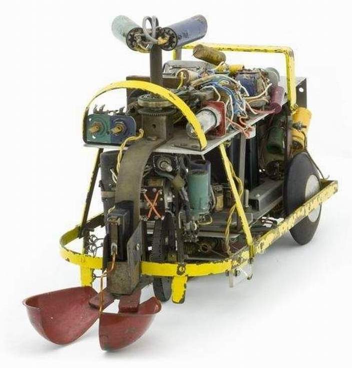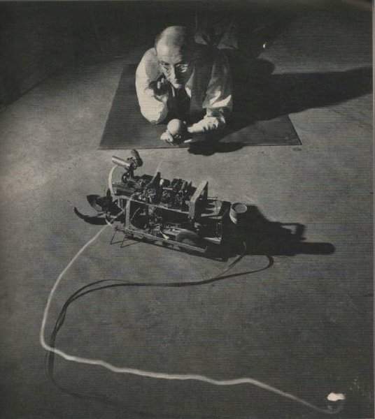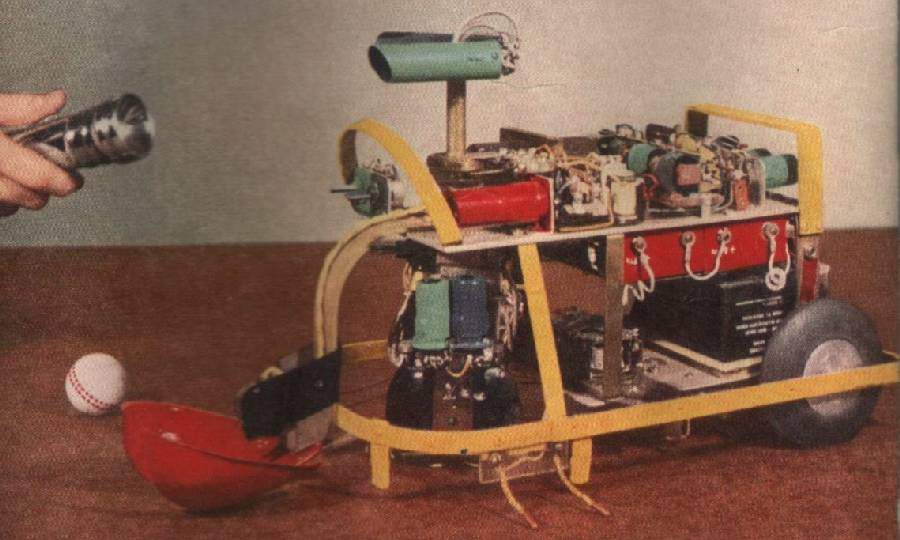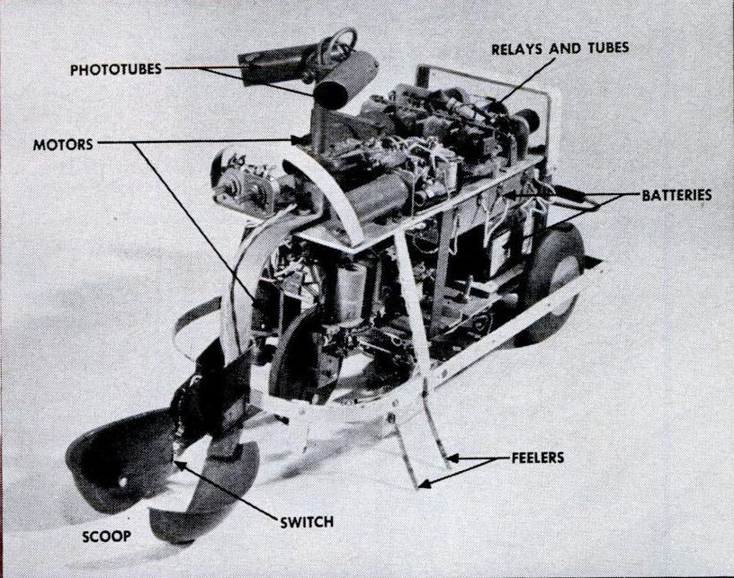 Squee, The Robot Squirrel by Edmund C. Berkeley and Associates – Construction Plans, 1952 - "The squirrel has two photocell "eyes", left and right, which see either steady or oscillating light. While hunting, the squirrel pays no attention to the oscillating (nest) light, only to the steady light illuminating the "nut". When a "nut" is picked up, the squirrel homes towards the nest. The nest is a sheet of metal on the floor. when the squirrel arrives there, two probes on the base of the squirrel (the "foot" switch) close a contact, the scoop opens, the ball rolls out, and the squirrel backs away from the nest. The squirrel then forgets about its nest, and goes back hunting for another nut. Dr. W. Grey Walter called his own tortoises either Machina Speculatrix or M. Docilis as mock biological names.