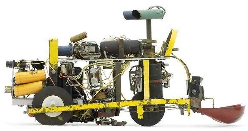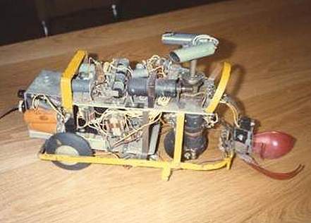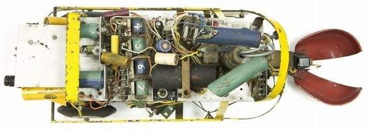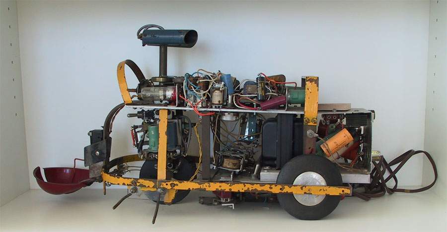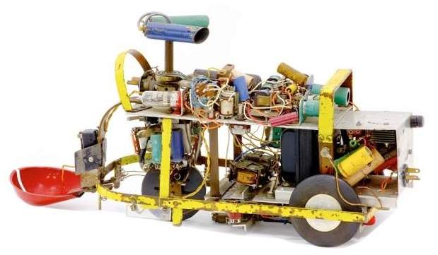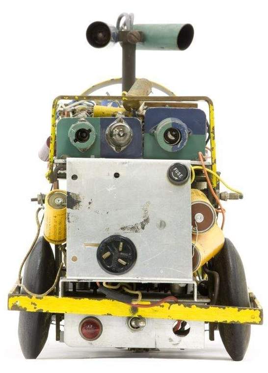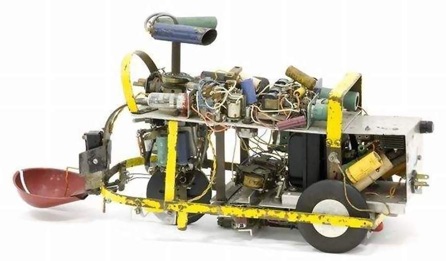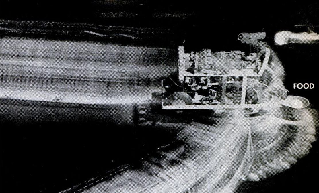 Squee, The Robot Squirrel by Edmund C. Berkeley and Associates – Construction Plans, 1952 - "The squirrel has two photocell "eyes", left and right, which see either steady or oscillating light. While hunting, the squirrel pays no attention to the oscillating (nest) light, only to the steady light illuminating the "nut". When a "nut" is picked up, the squirrel homes towards the nest. The nest is a sheet of metal on the floor. when the squirrel arrives there, two probes on the base of the squirrel (the "foot" switch) close a contact, the scoop opens, the ball rolls out, and the squirrel backs away from the nest. The squirrel then forgets about its nest, and goes back hunting for another nut. Dr. W. Grey Walter called his own tortoises either Machina Speculatrix or M. Docilis as mock biological names.
