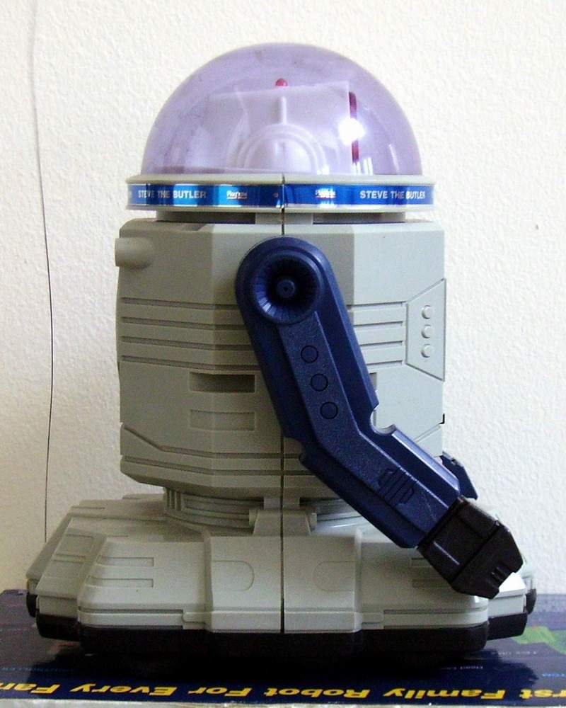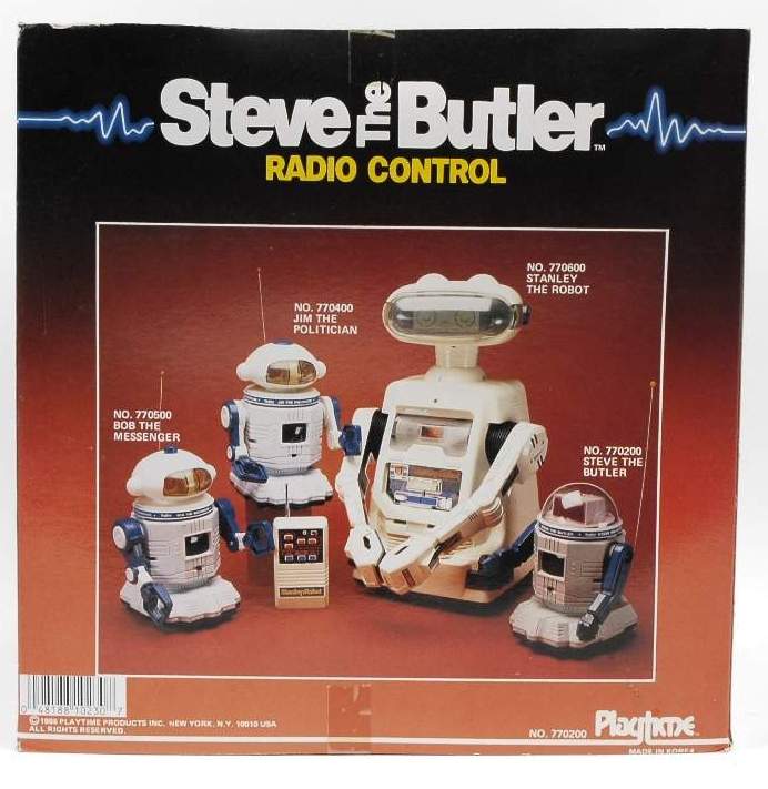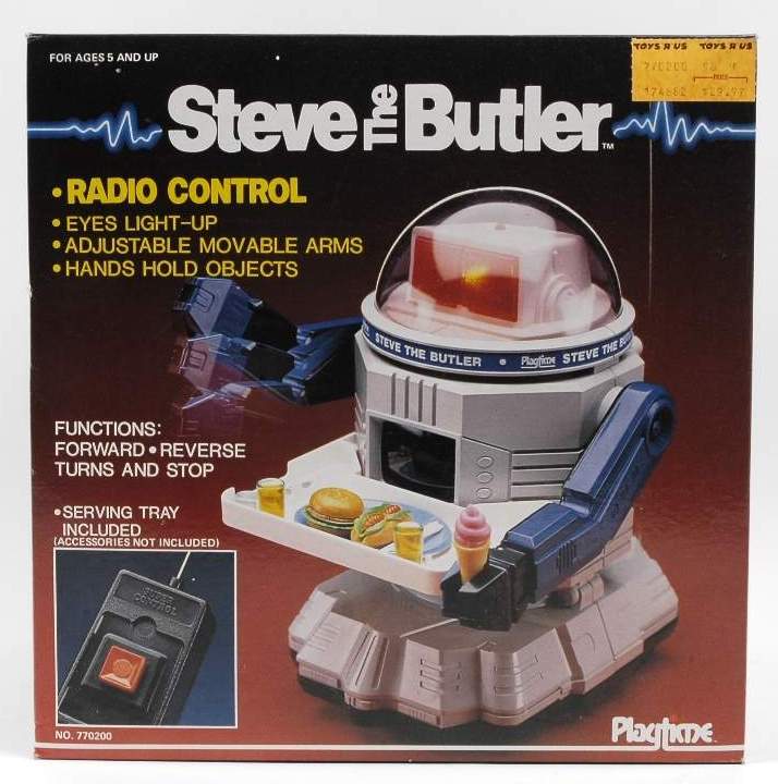 PlayBot 600 Remote Control Robot "Steve The Butler", made in Hong Kong in 1986 for Playtime. Part no. 710600. PlayBot 600 is a 9" (23 cm) tall plastic battery operated robot with remote control. During operation, Steve The Butler's hands hold objects as he moves around with a serving tray and lights up. Includes instructions
