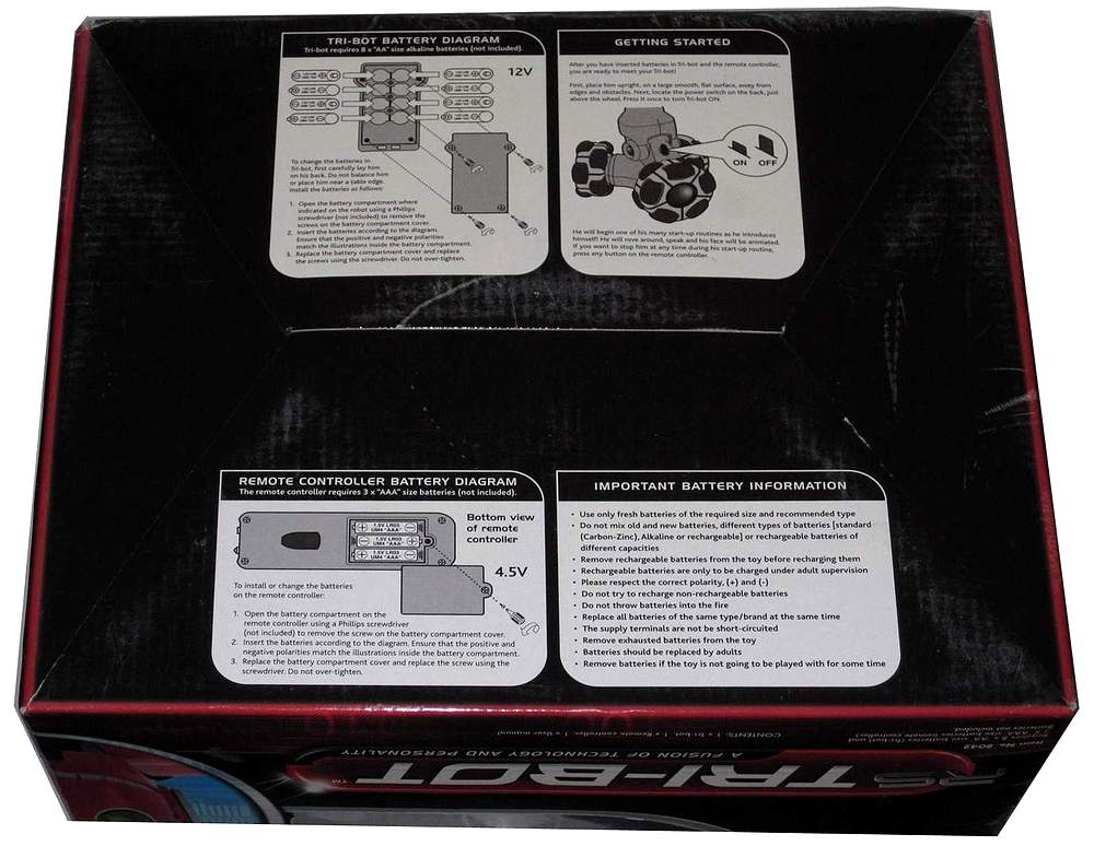 RS Tri-bot is incredibly expressive, from his pop-top head, to his animated eyebrows and light up eyes. Features a three wheeled base with turn on a dime omni-directional motion, for precise movement in any direction! RS Tri-bot comes equipped with a tilt-sensitive remote controller. Point the controller towards him, twist your wrist and he will follow! RS Tri-bot features a hilarious alarm mode; when the alarm sounds, RS Tri-bot begins to run around. You will have to catch him to turn it off! Test your skills with RS Tri-bots three onboard driving games -Pattern, Maze, and Minefield-. Details: Poseable arms and tilt waist, Demo function, Free roam -autonomous- mode, Program mode - store a sequence of up to 40 program steps, Guard mode, RS Tri-bot can tell you when hes fallen over! Homing function, Standby and sleep modes for battery conservation, 3 x motors, 3 x IR sensors, Built-in speaker, LED indicator. |