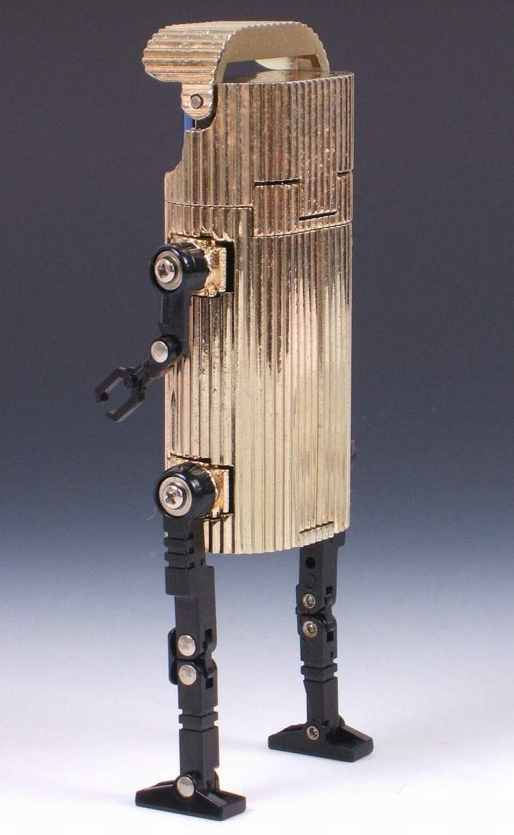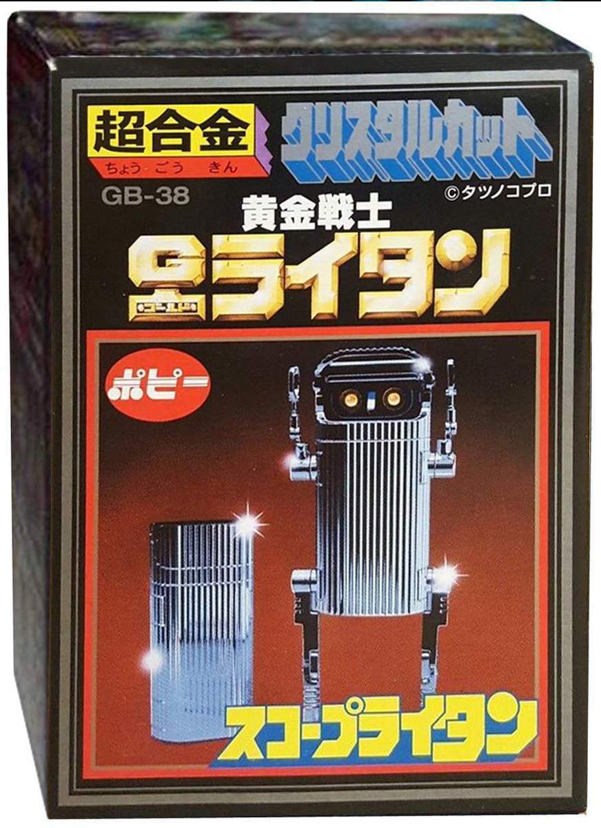Golden Warrior Scope Lightan Transformer Chogokin Robots GB-38 - This is an original first release "Scope Lightan" from the Japanese anime series Ogon Senshi Gorudo Raitan (Golden Warrior Gold Lightan). Scope feature works of course there's even a warning that says don't look into the sun. When not transformed into a robot he measures approx. 78 mm x 39 mm x 25 mm. The bottom is marked in Japanese: Scope Lightan, Tatsunoko Productions, Popy, Chogokin, GB-38, Japan and 1981.