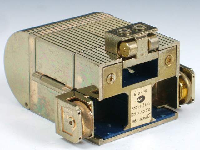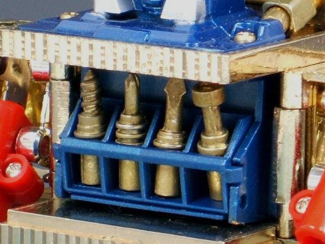 His transformation - A tricycle set of wheels flips out from the base of the lighter. Then the lid opens to reveal the robot head. Depress the large red button on the top and the body of the lighter pops open, revealing a chest-mounted tool kit, as well as the red plastic arms, which then need extending. These can either fire small plastic missiles, or be used to mount the tiny diecast tools from the toolkit. Mechanic Lightan has no legs, instead moving around on wheels, and the arms are only nominally limbs. |