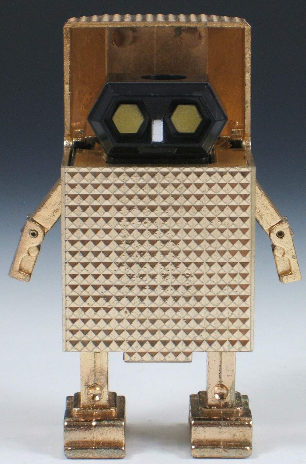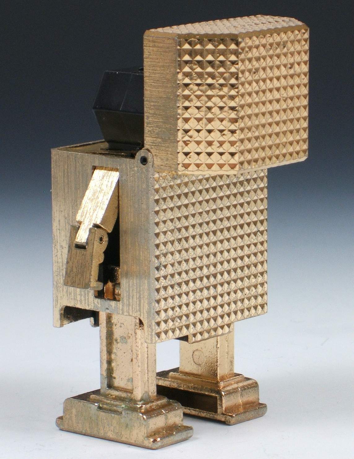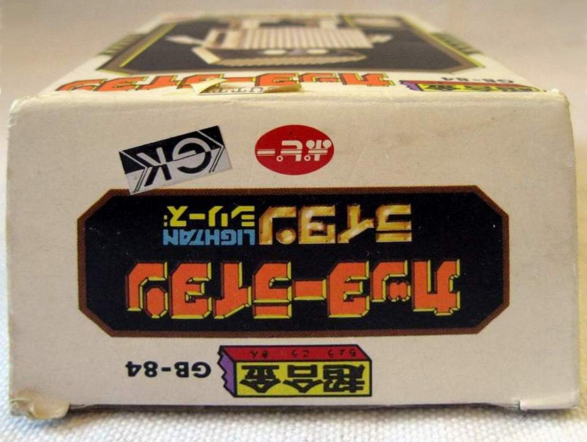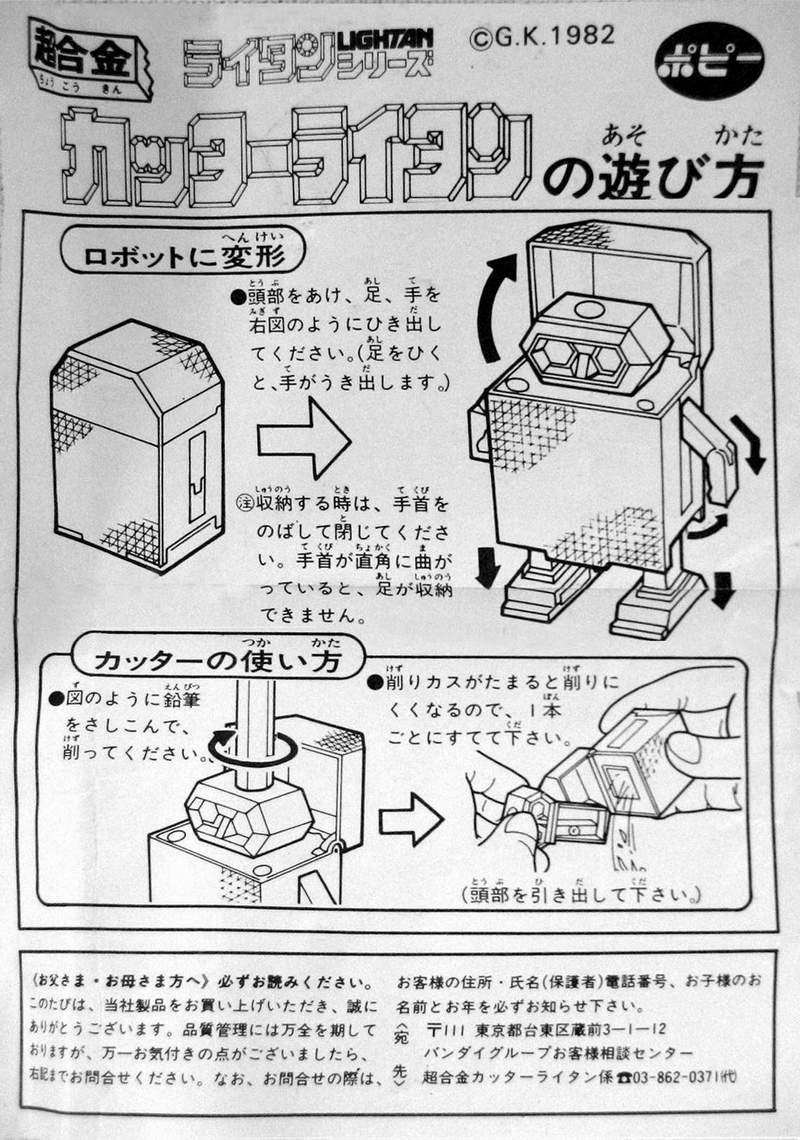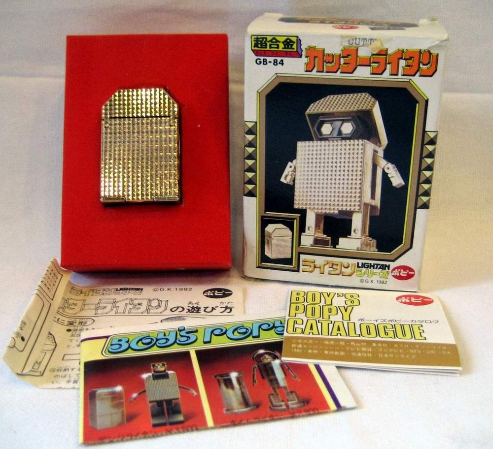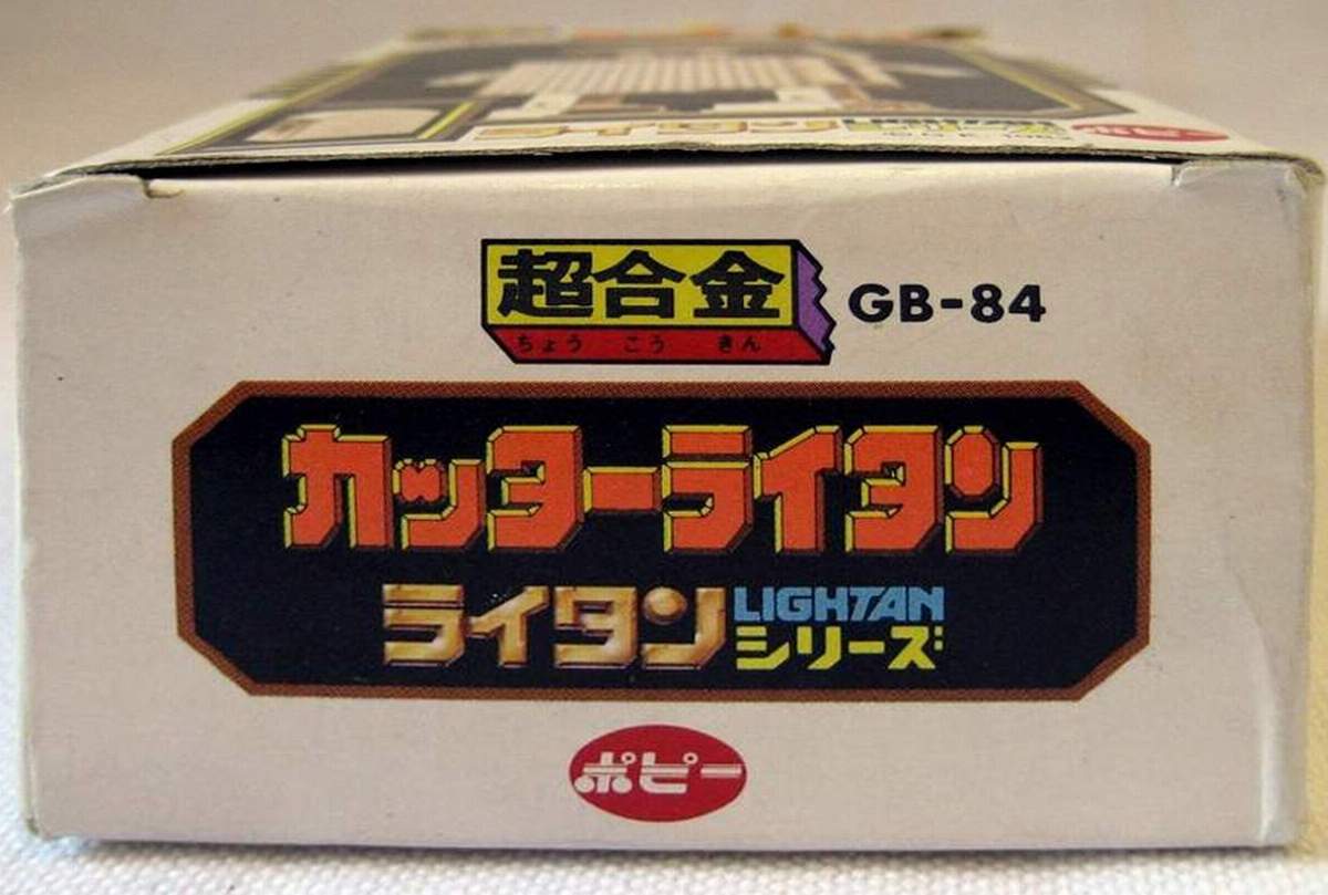 Golden Warrior Cutter Lightan Transformer Chogokin Robots GB-84 - This is an original 1982 release "Cutter Lightan" from the Japanese anime series Ogon Senshi Gorudo Raitan (Golden Warrior Gold Lightan). When not transformed into a robot he measures approx. 51 mm x 34 mm x 25 mm in diameter. He gets much bigger when transformed. He's heavy too, 93 grams. He's mostly metal, not plastic. On the bottom it's marked in Japanese and English: Lightan 8, Lightan Series, Cutter Lightan, Chogokin, GB-84, Popy, Japan, G.K and 1982 |
