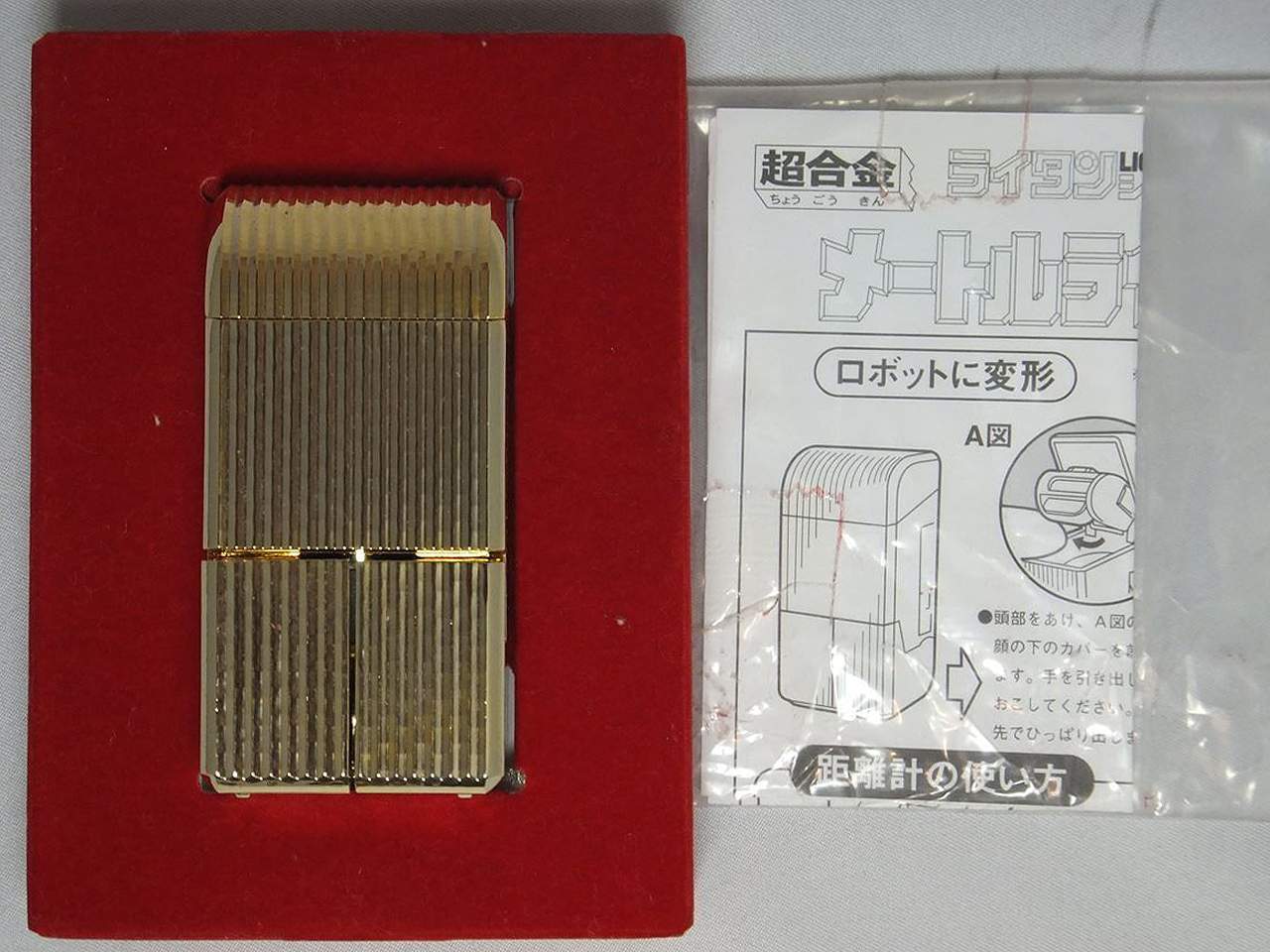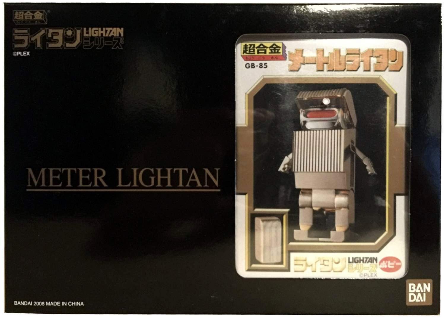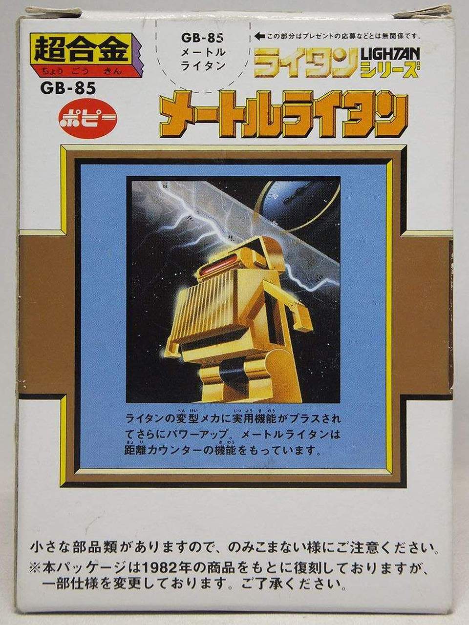 Golden Warrior Meter Lightan Transformer Chogokin Robots GB-85 - This is an release "Golden Lightan," the leader from the Japanese anime series Ogon Senshi Gorudo Raitan (Golden Warrior Gold Lightan). When not transformed into a robot he measures approx. 61 mm x 39 mm x 25 mm. Under his feet it reads GB-37, Popy, 1981, Japan, and in Japanese: Chogokin, Crystal Cut, Lightan and Tatsunoko Productions.
