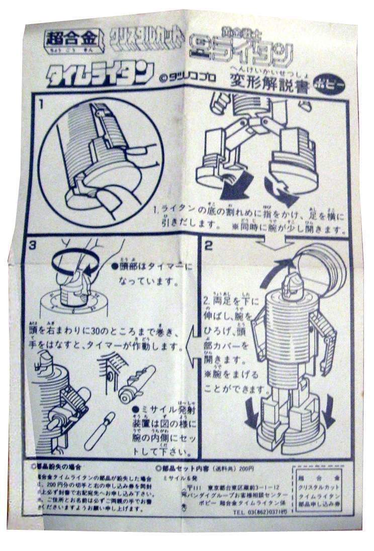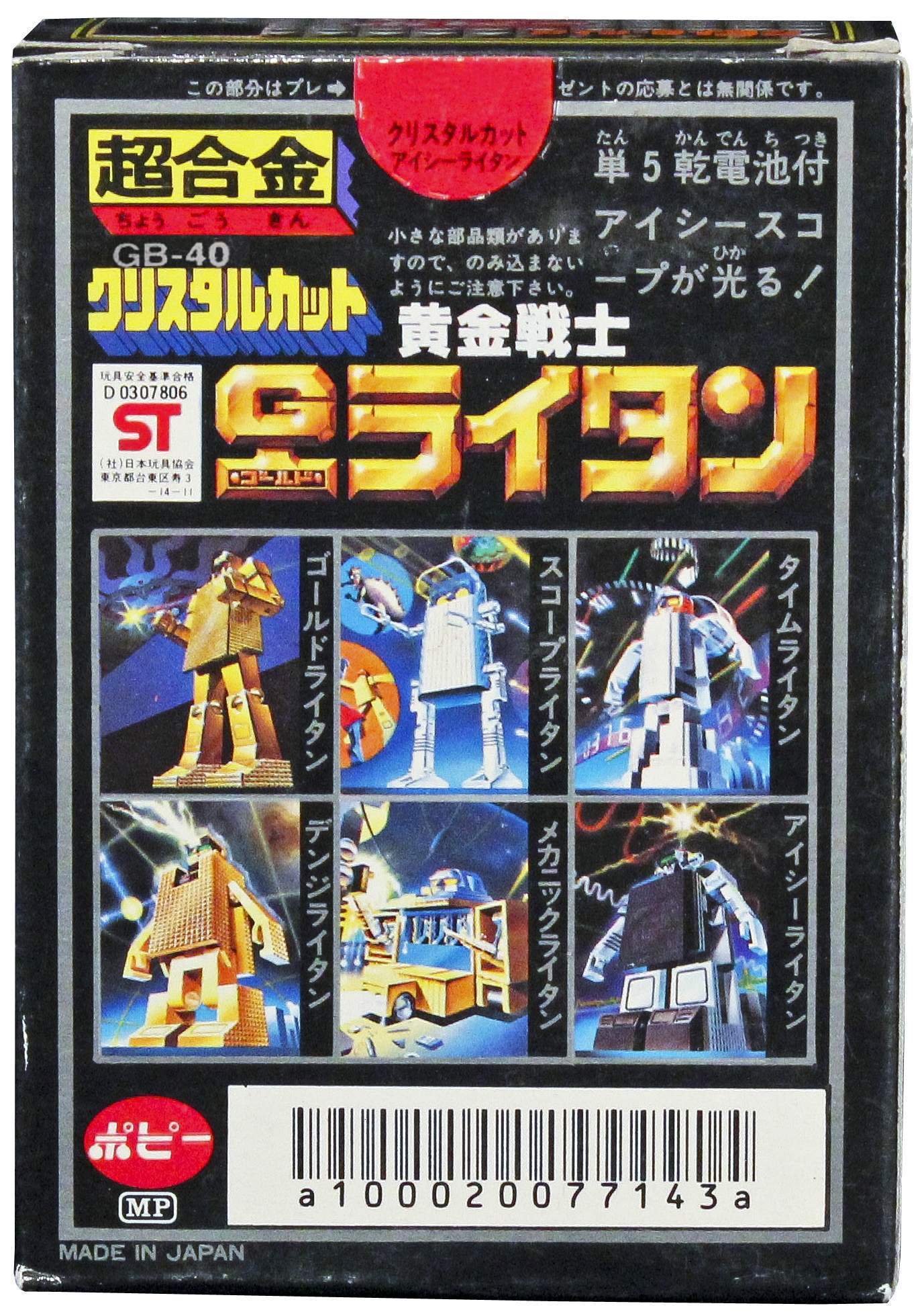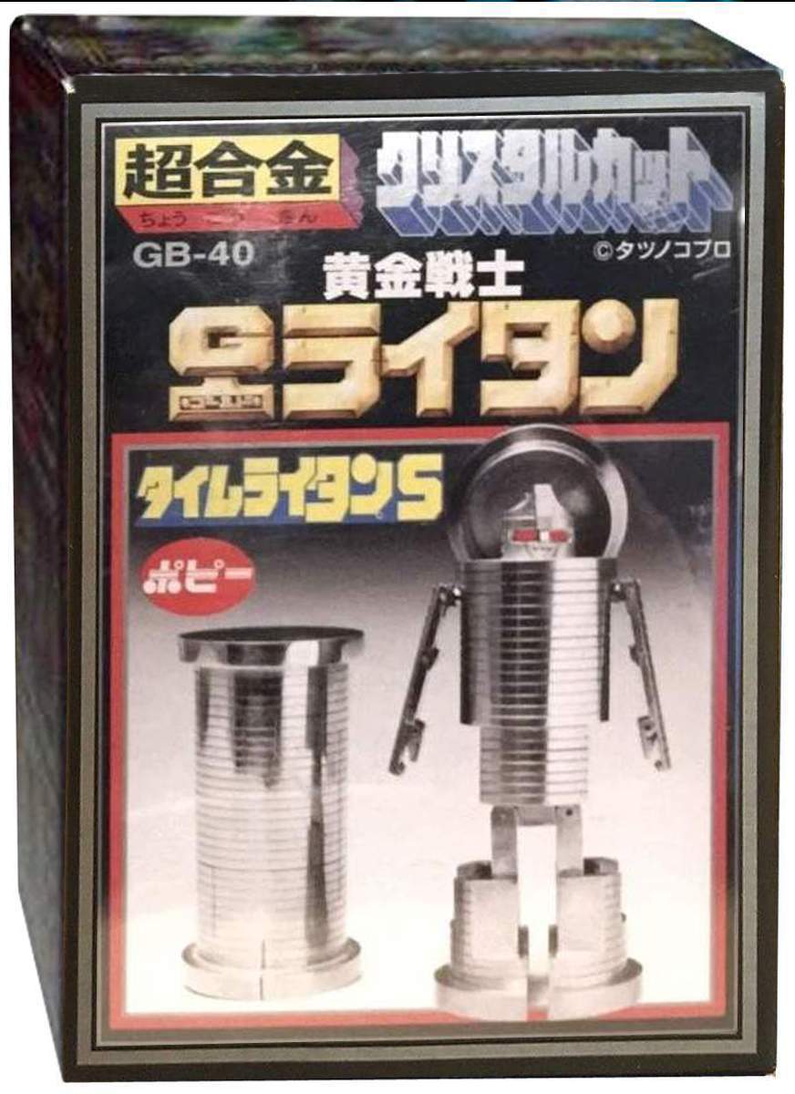 Golden Warrior Time Lightan Transformer Chogokin Robots GB-40 - This is an original first release "Time Lightan," from the Japanese anime series Ogon Senshi Gorudo Raitan (Golden Warrior Gold Lightan). When not transformed into a robot he measures approx. 73 mm tall x 36 mm in diameter. Between his legs reads GB-40, Popy, 1981, Japan, Time Lightan and Tatsunoko Productions.