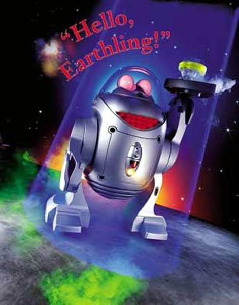 RoboCub is Endearing remote-controlled robot is full of spunky personality. Spouts dozens of random phrases. Rolls everywhere on wheeled "feet." Movable arms and spring-loaded "hands" can hold small toys and objects. Eyes and mouth light up with colorful LEDs in sync with its speech. RoboCub ® stands 10 1/2" tall and weighs 2 lbs. Powered by 6 AA batteries. |