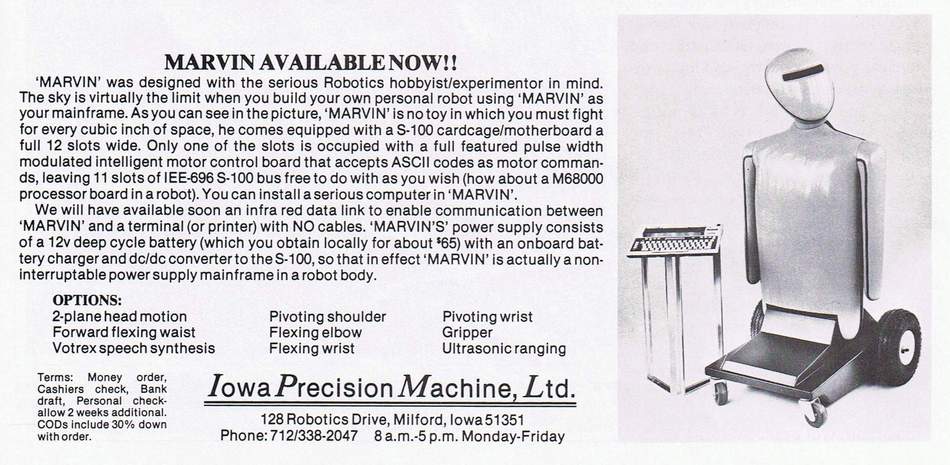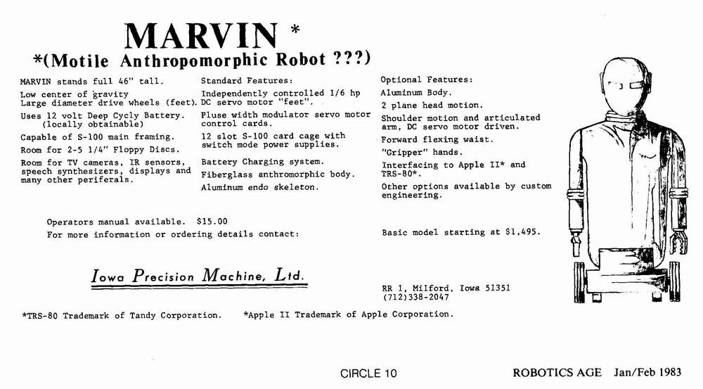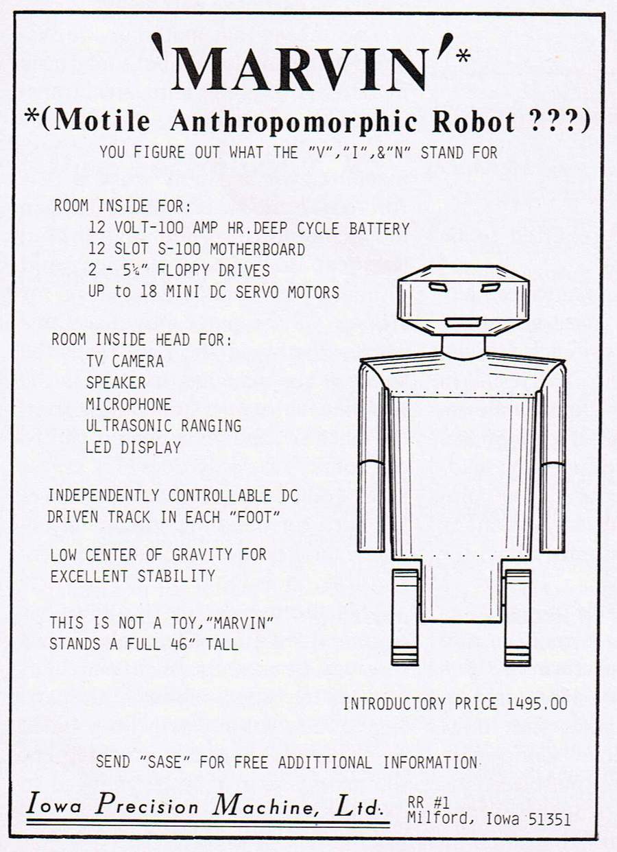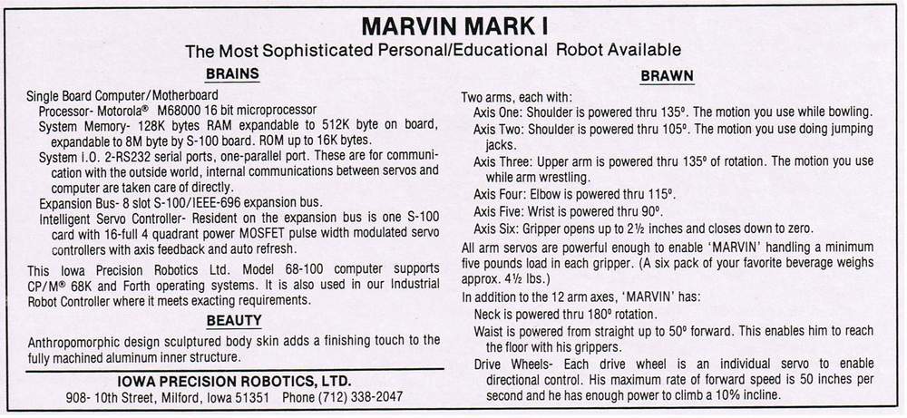 Marvin ® by Iowa Precision Robotics, Ltd. - 1985; - MARVIN MARK I "Mobile Anthropomorphic Robot VINtage high tech robot"