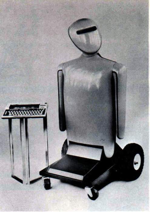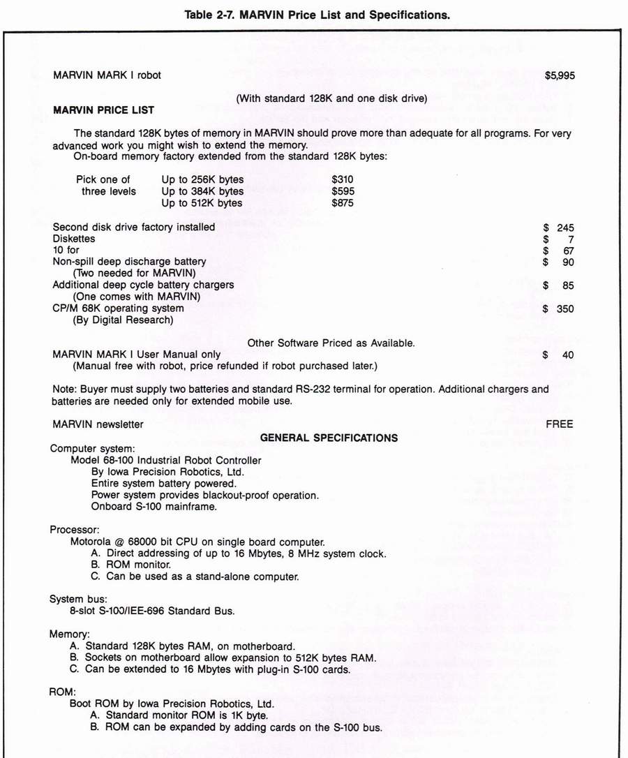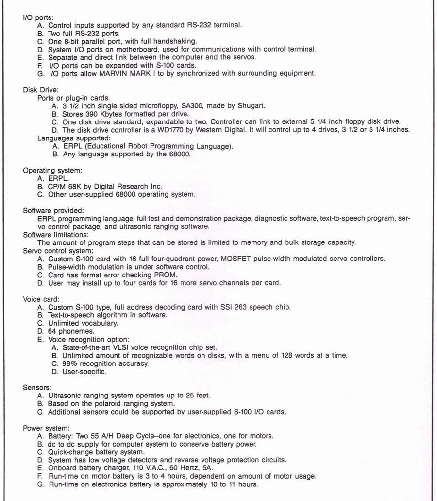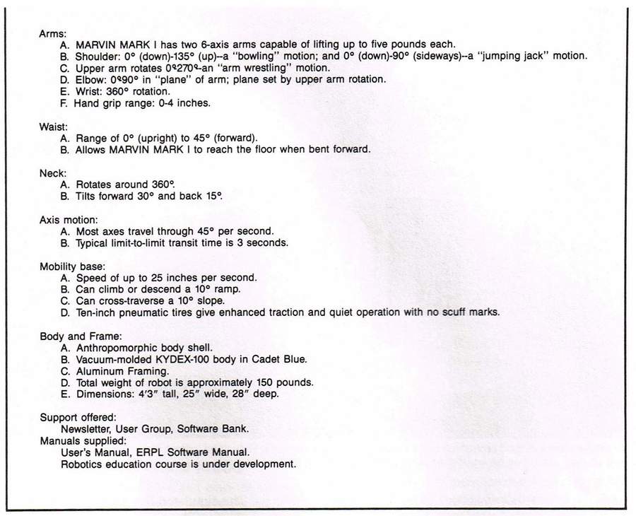 Marvin Mark I moves around the room, talks with a synthesized voice using his 500-word vocagulary, moves his head, has sonar rainging on board, and has two 6-axis arms that can be programmed to work simulaneously. Marvin a somewhat anthropomorphic personal robot that stands 50 inches tall and has two six-axis arms, an on-board Motorola 68000 processor and a standard disk drive. A total of 15 axes of movement can be operated simultaneously under computer control. Base price is $6,190.