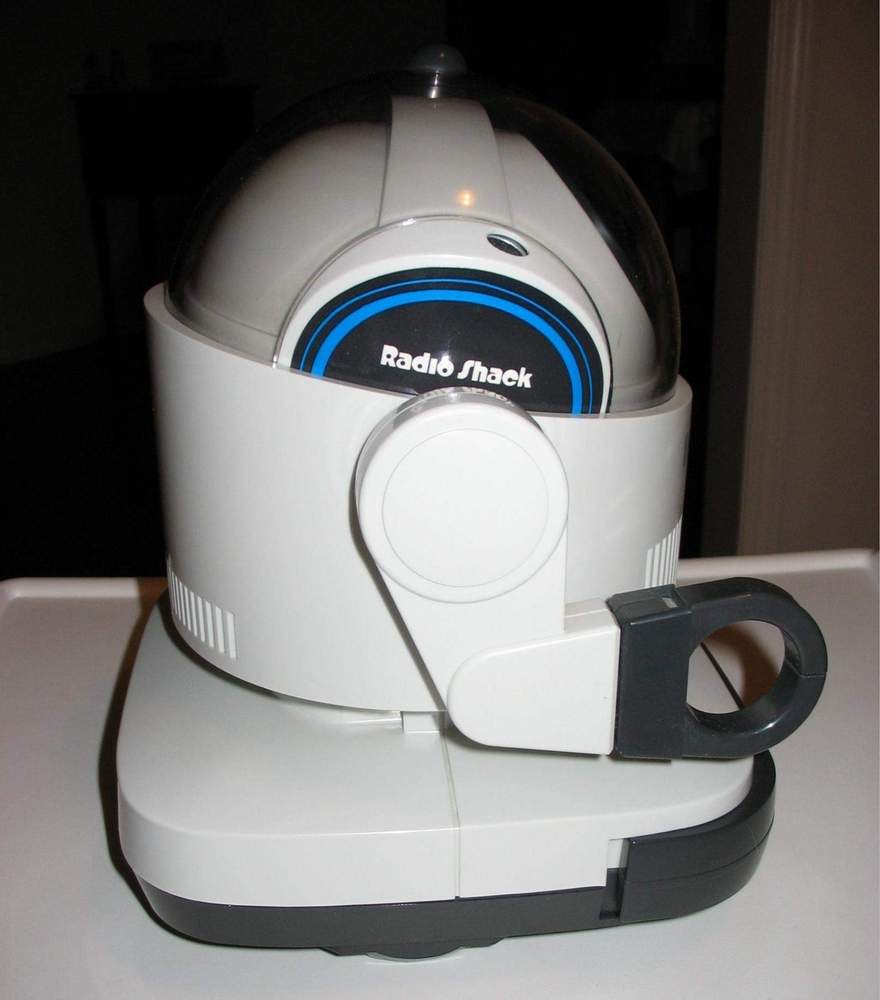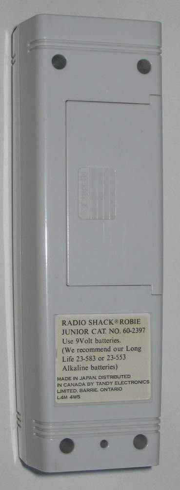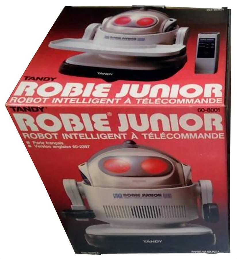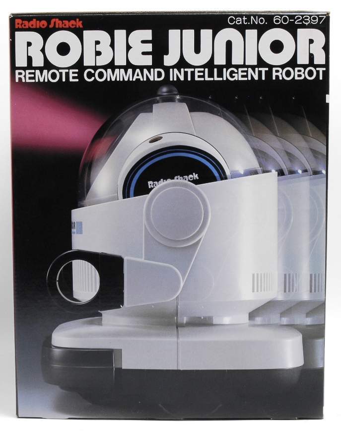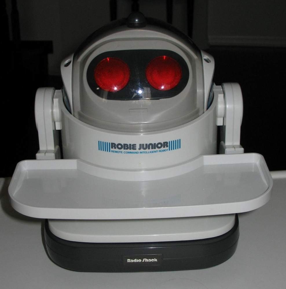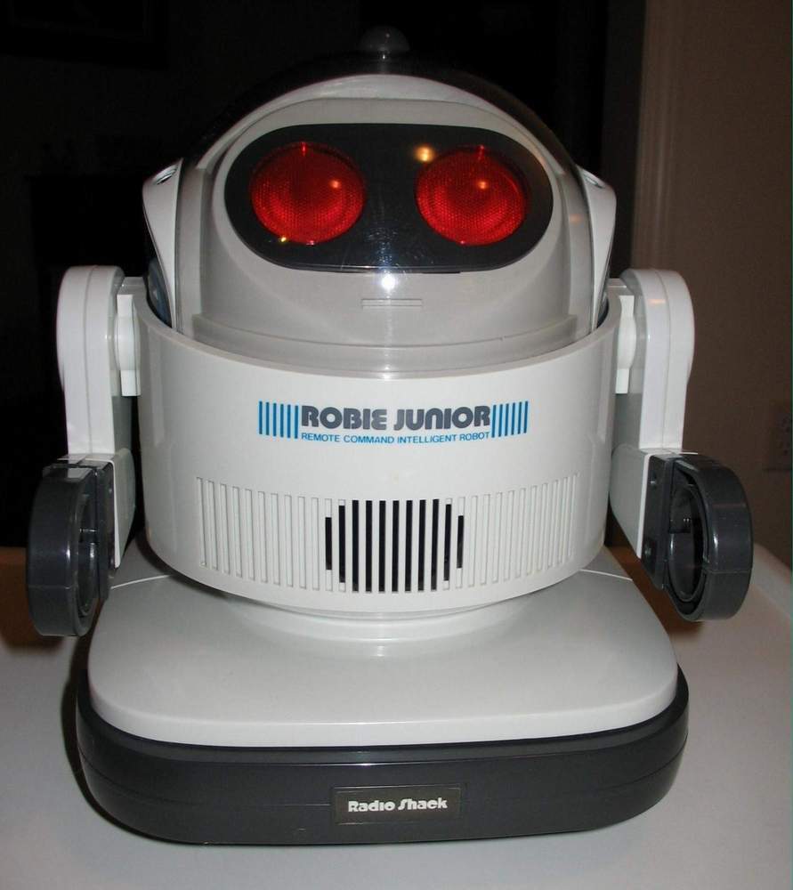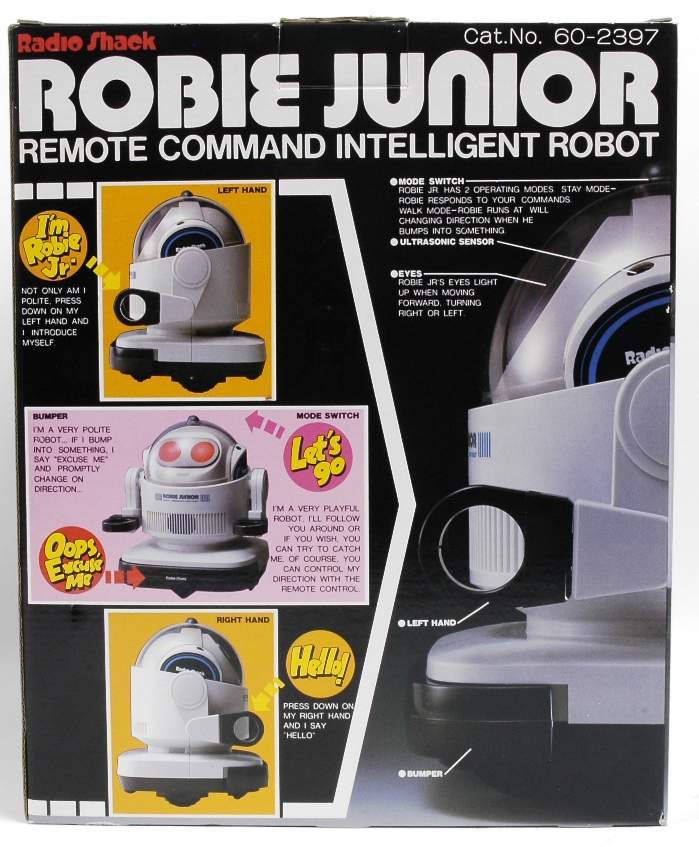 Robie Junior ® Radio Shack. - This Remote Command Intelligent Robot is great. His eyes shine as he moves. Both eyes shine when moving forward. the right eye shines when he turns right and the left one lights when he moves left. When he goes backwards, the eyes are off. He receives ultrasonic signals from the controller. Press down either arm to have him talk. If he runs into something he changes direction. Pushing his bumper also makes him speak.