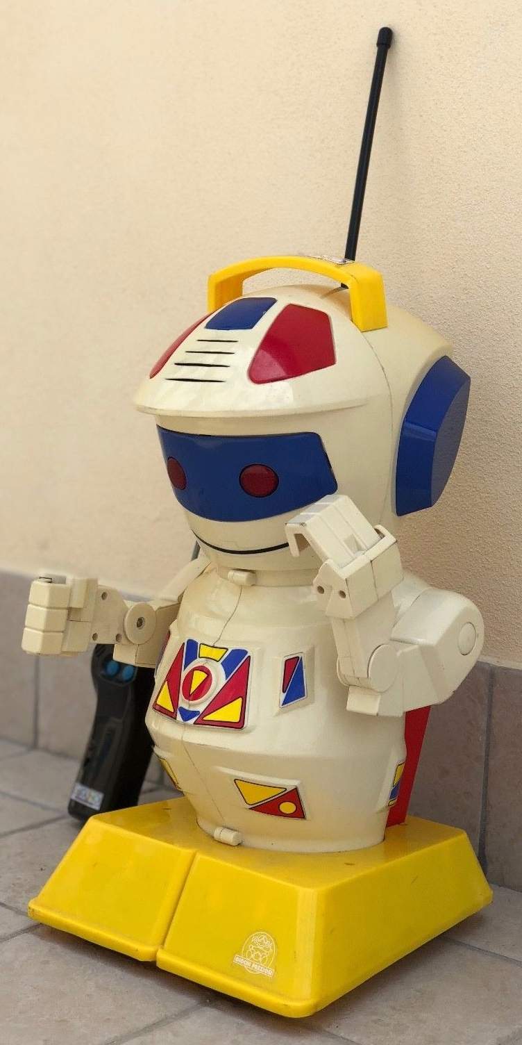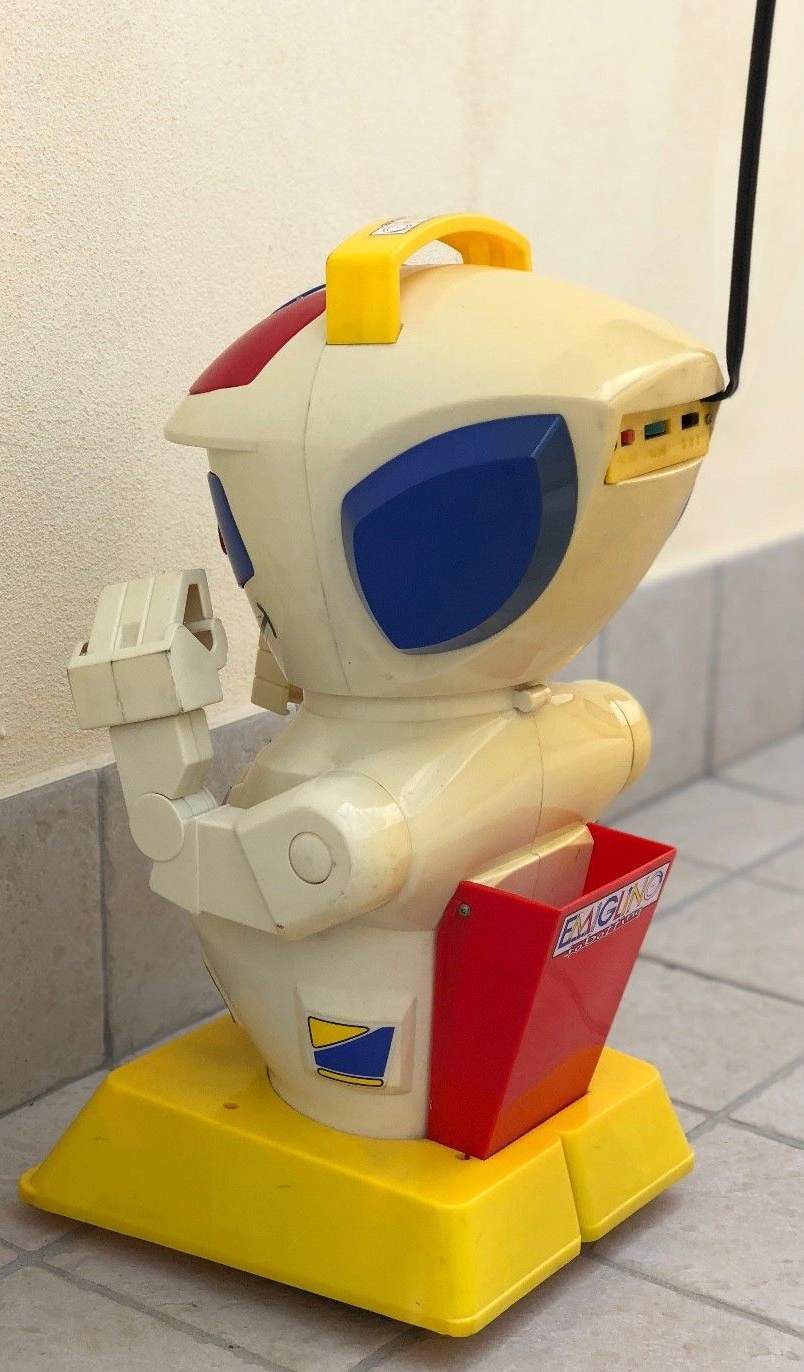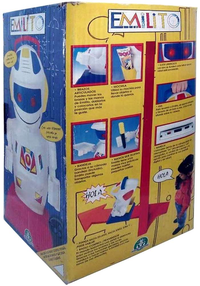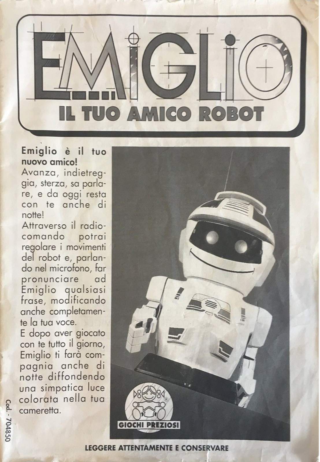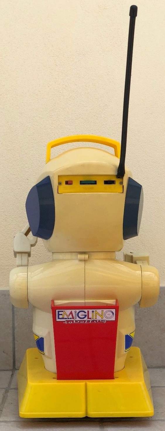 ROBOT RADIOCOMANDATO EMIGLIO GIOCHI PREZIOSI [ E.M.I.G.L.I.O ] [E] lectronic [M] echanical [I] ndustrial [G] enerated for [L] ogical [I] nfiltration and [O] bservationEmiglio Robot -Emiglio is Radio control Robot and has a Movable head, Night Lights, The eyes light up, backpack for carrying things, gripping hands and a tray. He is your walking talking robot with electronic sound and lights. GP Toys Inc. Suite 200, Lincolnshire Il, 60067 Tel 1-800-338-1850 ; GP (GIOCHI PREZIOSI) Toys Inc. |