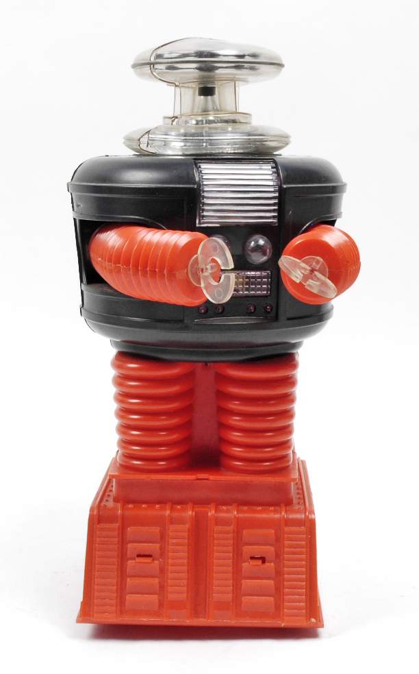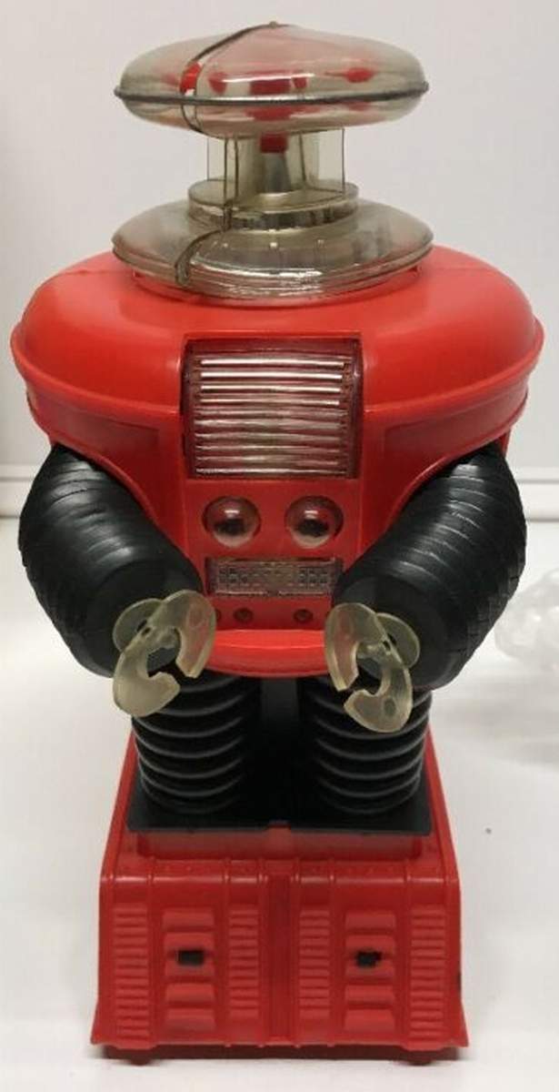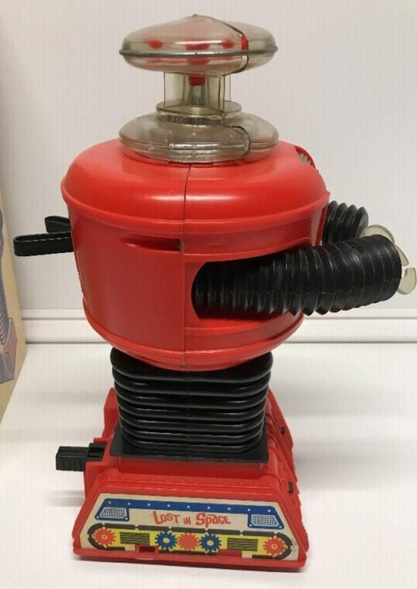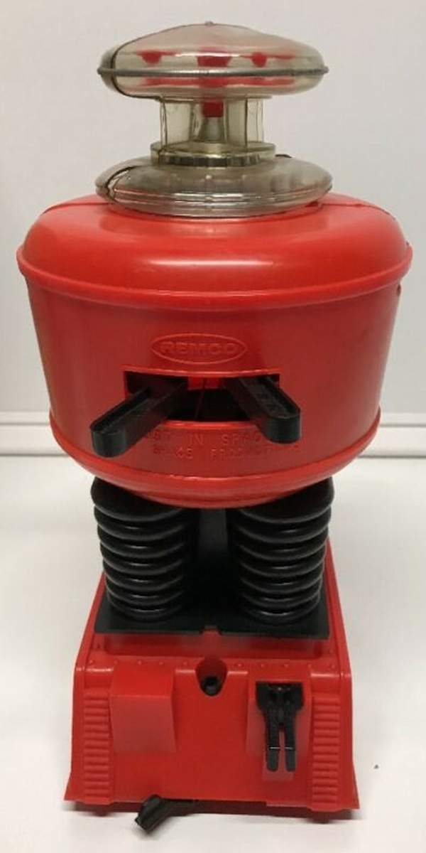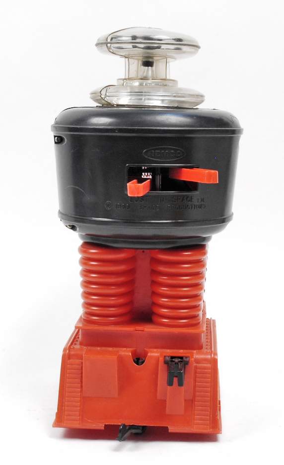 Remco Lost in Space Robot. ; Copyright 1966 Space Productions. - A motorized 6x9x12" tall plastic battery operated toy by Remco. Large plastic static robot based on the TV series. A large range of color combinations are known. This is the color variety where upper body and bottom of robot are in red. Legs and arms are blue. Through the Courtesy of : a l p h a d r o m e and The Robot Hut and "Uncle Oodie's" Collectibles