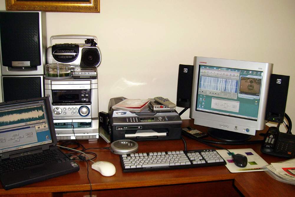 d3. With a Computer with (#d1) or (#d2) and/or (#d4, #d5, #d6) . (Software will be necessary) A. With the computer and software you can run to the external cassette (#d5) or the CD recorder's (#d6) (figure 4, 5) or through the original controller or the 49 MHz Two Way Radio directly to the robot, and/or to the internal cassette (#d4), or all of the above. What this gives you is the ability to create a cassette tape to the robot without the controller directly through cables and adapters (figure 7) from the computer. With the controller or the 49 MHz Two Way Radio this can bring you into the age of CD's that is readily available today and eliminate the need for the cassette. Audio cassettes are not readily available today, and not easy to hook up to a computer and connect to the internet to read and write.