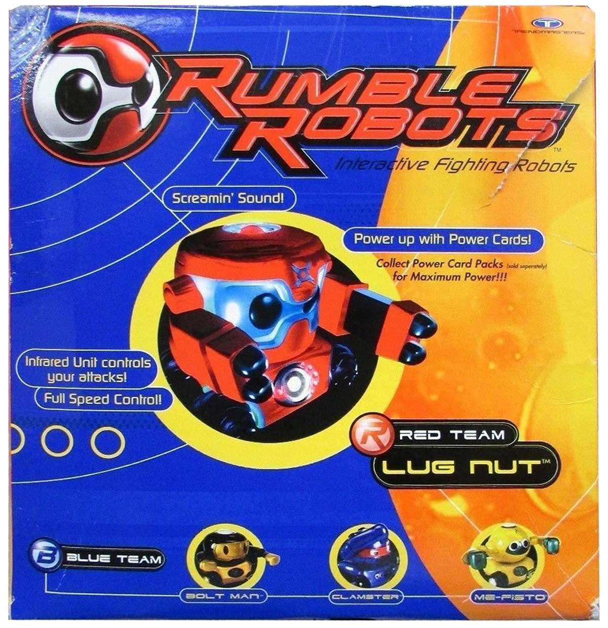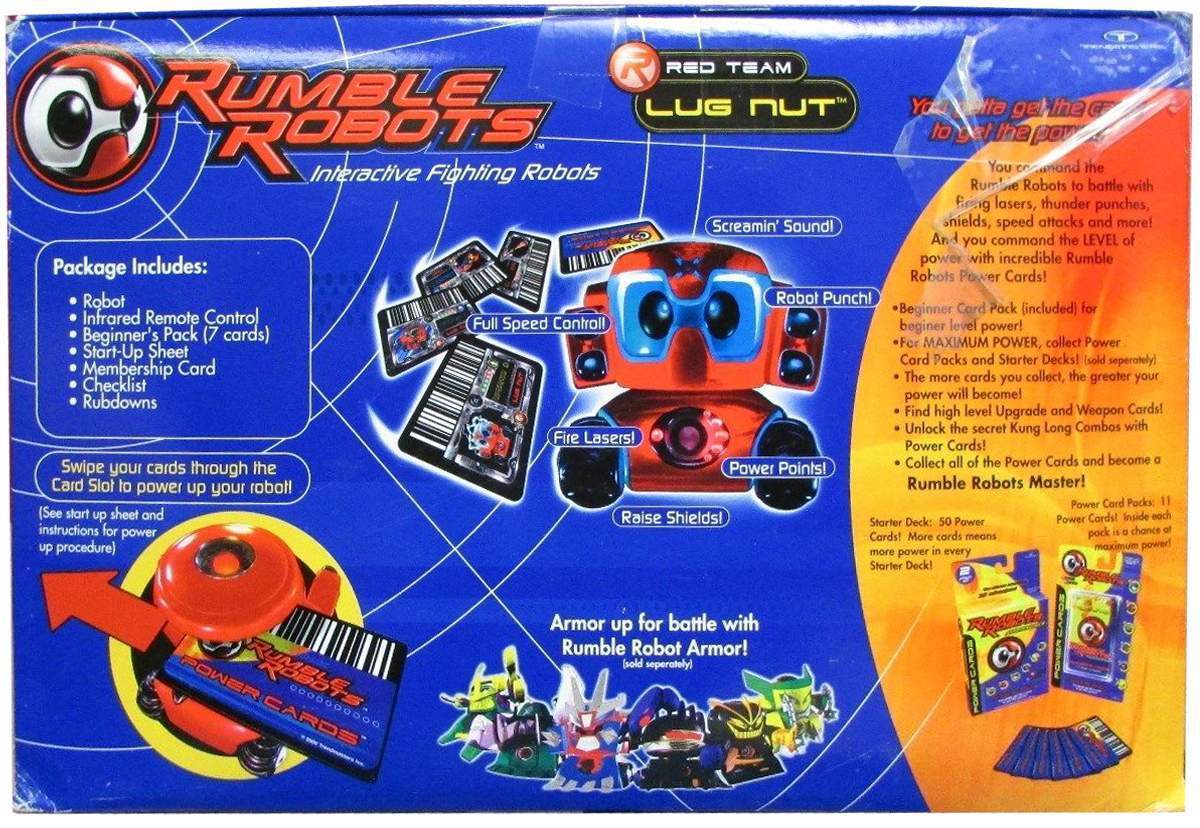 Lug Nut Interactive Fighting Robot Lug Nut is a Rumble Robot is a construction worker who has a need for speed and an attitude to match. This infrared controlled interactive fighting robot is ready for battle with his thunder punch and screamin' sound. Raise your shields, fire your lasers and be careful not to loose your power points. With full speed control, you control the action.
