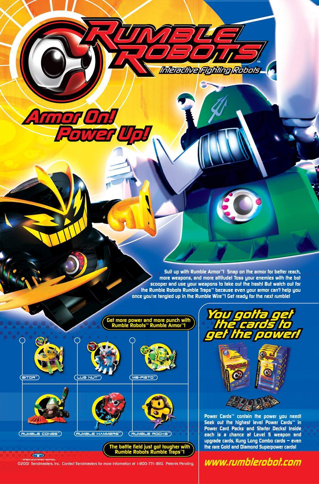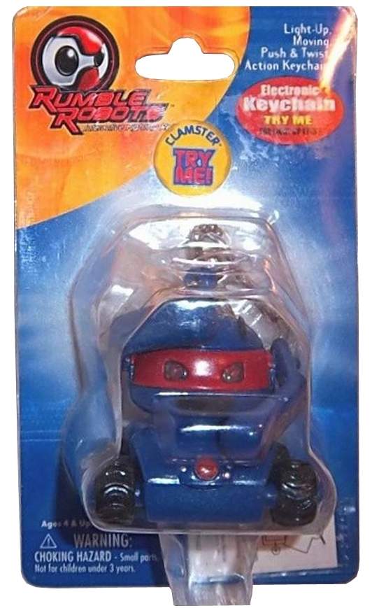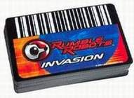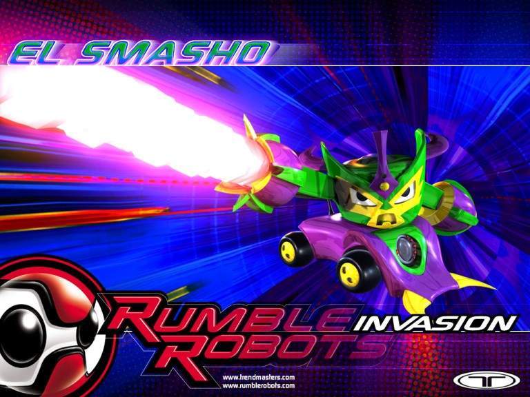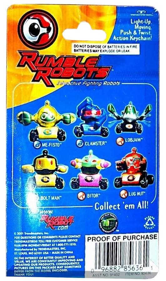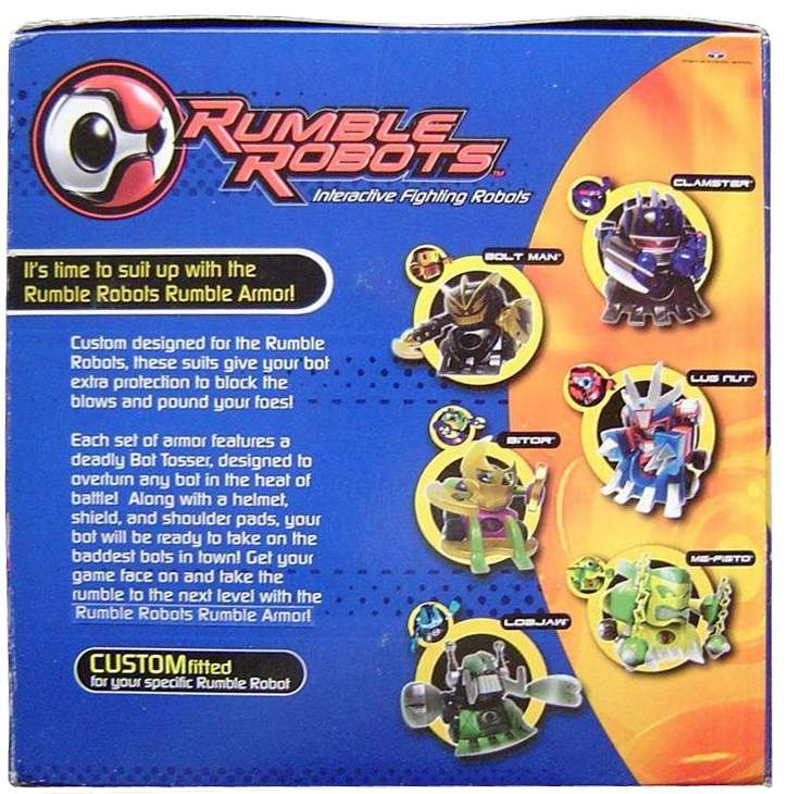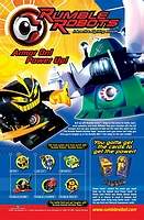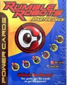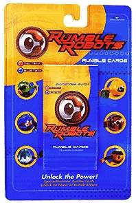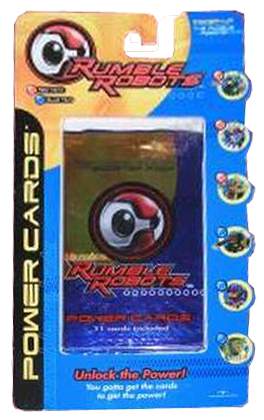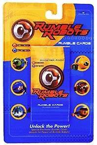 Rumble Robots is a collectible card game that combines card play with battling electronic robot counterparts. First, play the card game to win cards from your opponent, then swipe the won cards through your robot to give him more power. Robots battle in an attempt to kill each other's power supply, by either tipping them over, hitting their antenna-like terminate switch, or sapping power via laser attack. The winning bot gets to collect "treasure points"--registering their victories in memory.