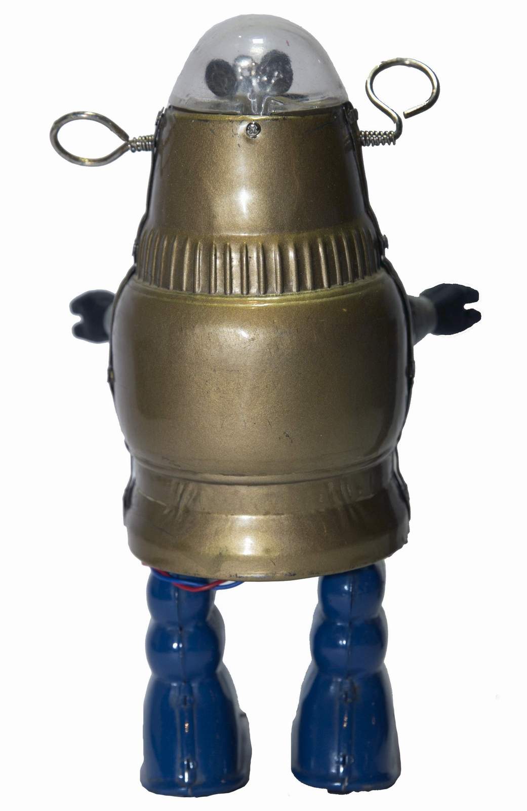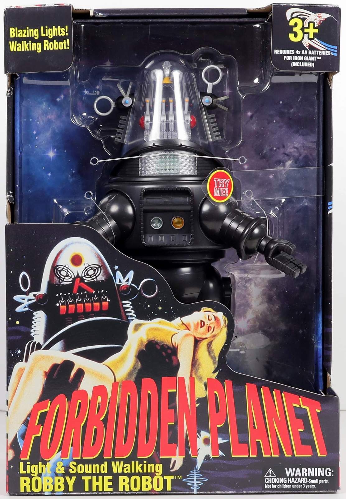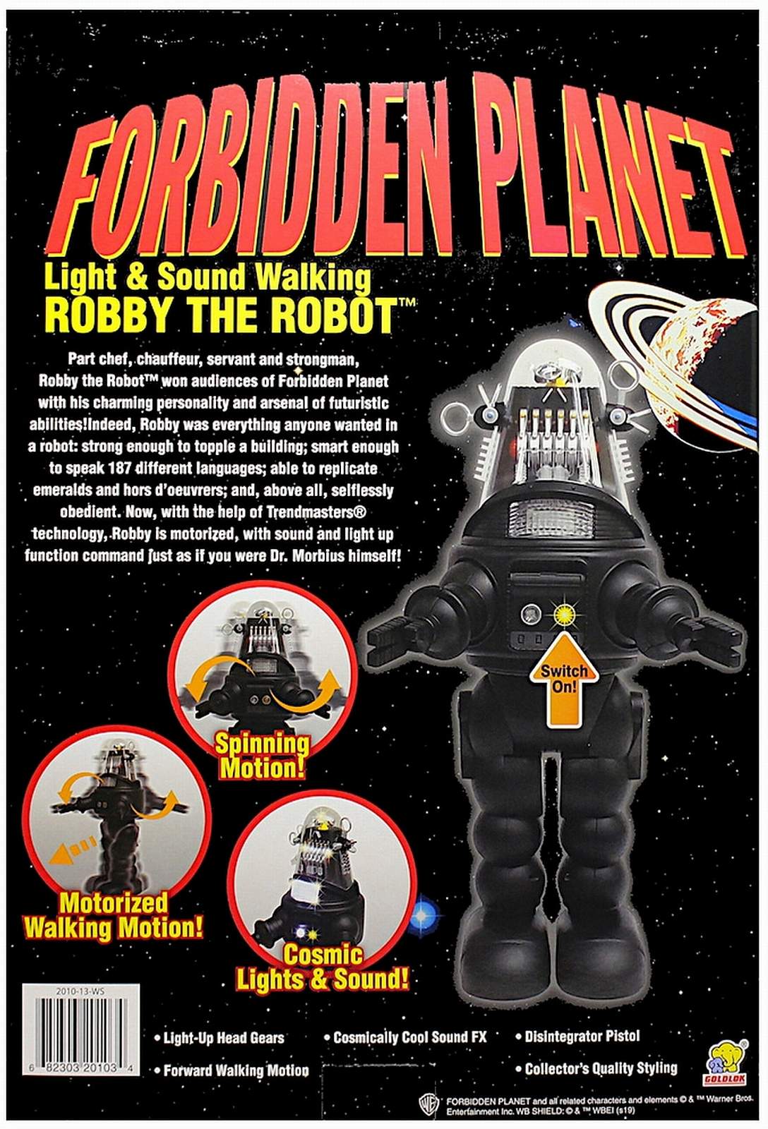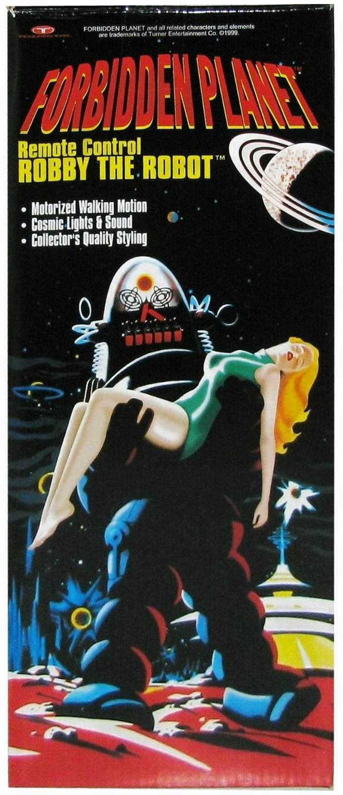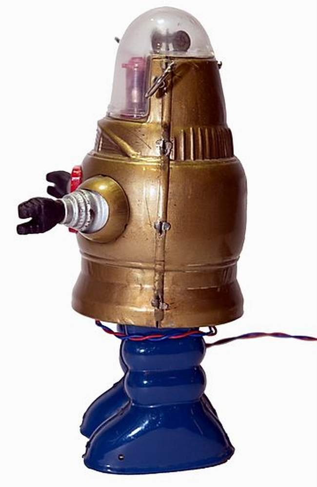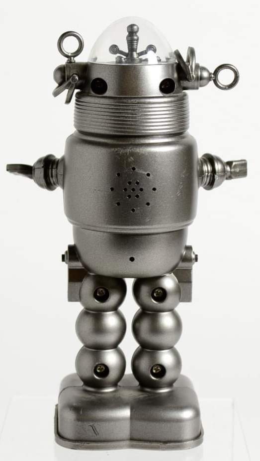| Robby The Robot ® Forbidden Planet - Popular, glass-domed robot that appeared in a number of films and TV series from the 1950s through the 1980s. Robby the Robot made his debut in the classic science fiction movie Forbidden Planet (1956) as a bulbous mechanical man built by Earth scientist Dr. Morbius using knowledge left by the Krel, a long-dead alien race. Robby is multilingual, and capable of lifting great weights, synthesizing anything from gems to bourbon, and carrying out any domestic chore. Many of the features of B-9, the robot used in Lost in Space, parallel those of Robby. These include a glass head with animated elements, rotating antenna ears, flashing light mouth, and a chest panel with more animated elements.