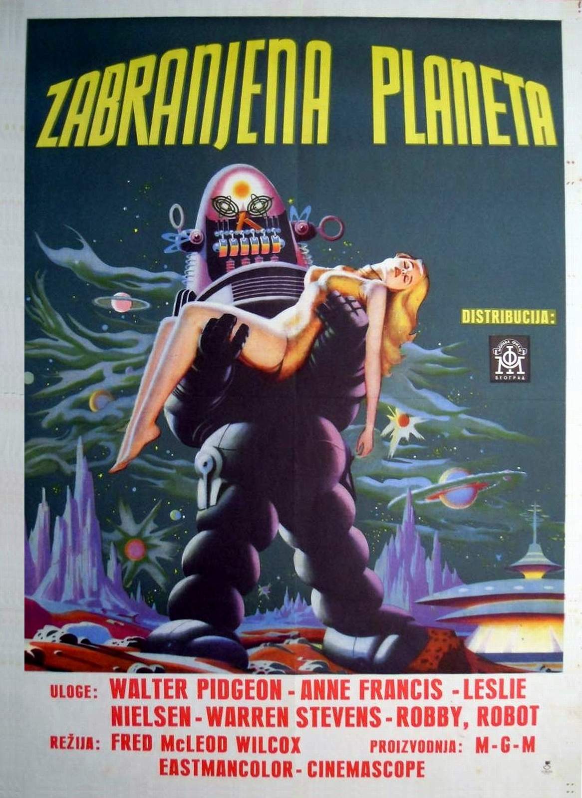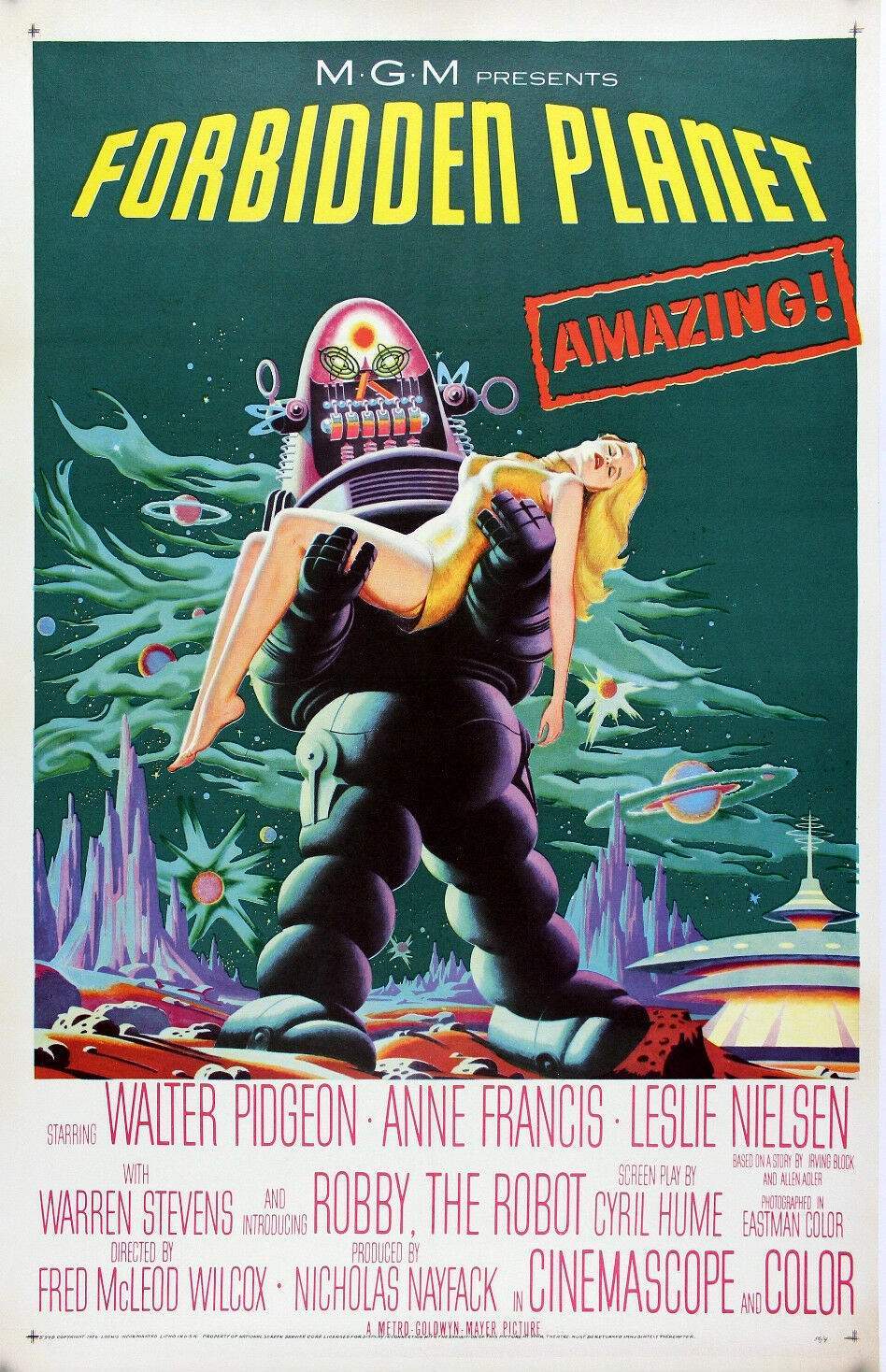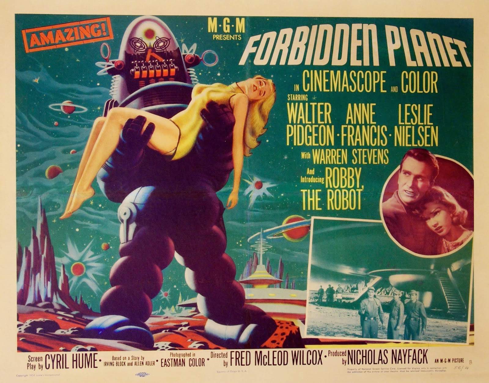 | Robby The Robot ® Forbidden Planet - Popular, glass-domed robot that appeared in a number of films and TV series from the 1950s through the 1980s. Robby the Robot made his debut in the classic science fiction movie Forbidden Planet (1956) as a bulbous mechanical man built by Earth scientist Dr. Morbius using knowledge left by the Krel, a long-dead alien race. Robby is multilingual, and capable of lifting great weights, synthesizing anything from gems to bourbon, and carrying out any domestic chore. Many of the features of B-9, the robot used in Lost in Space, parallel those of Robby. These include a glass head with animated elements, rotating antenna ears, flashing light mouth, and a chest panel with more animated elements.