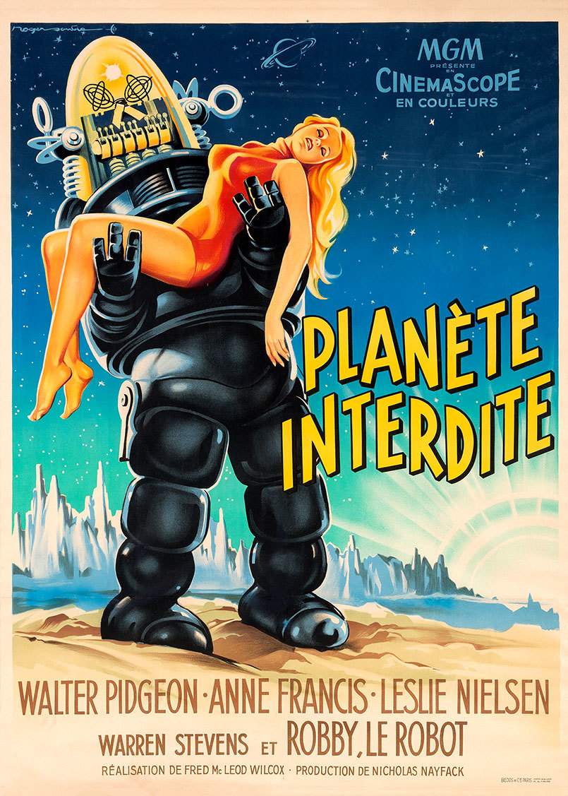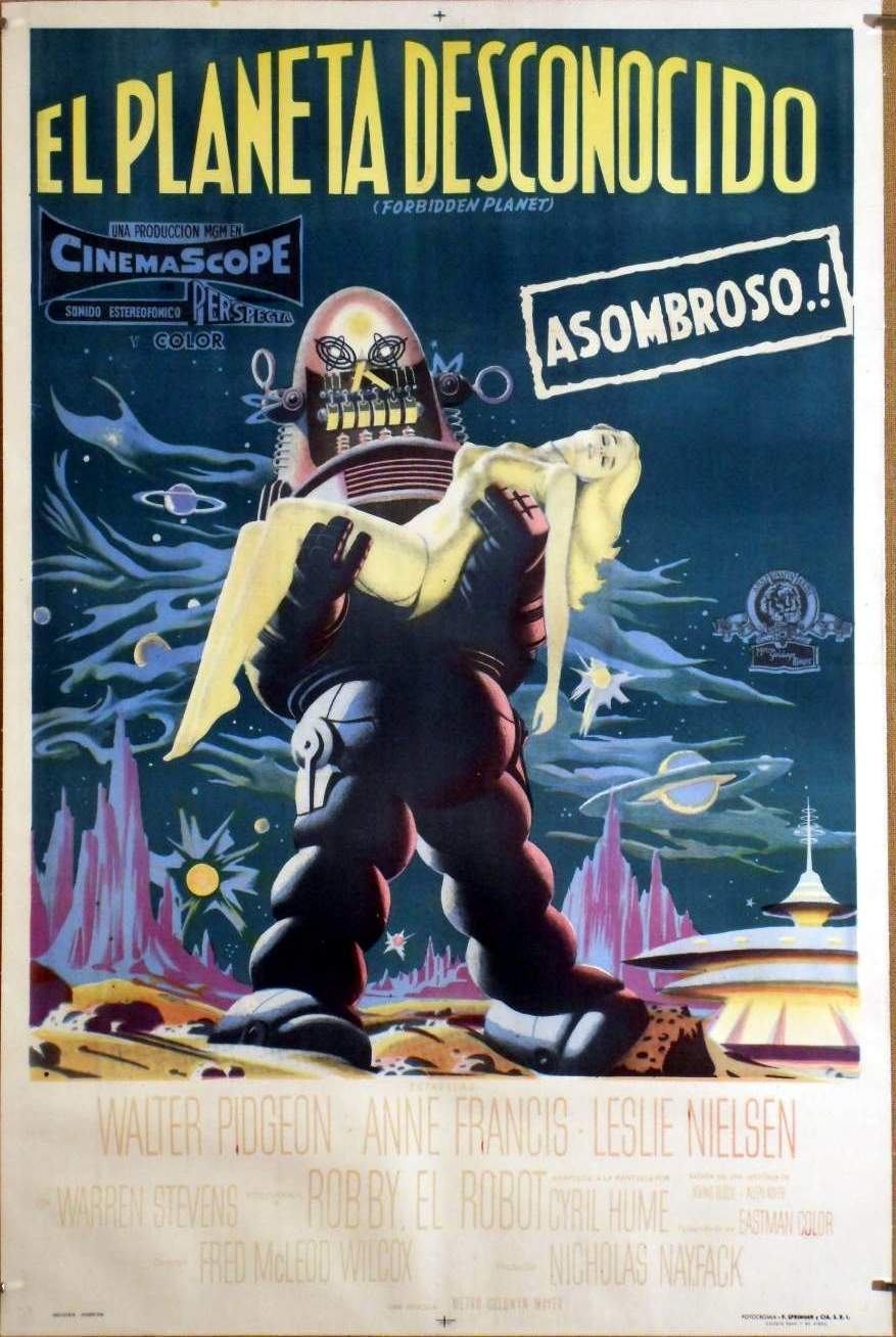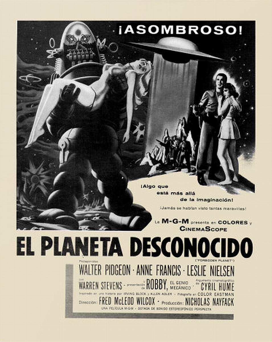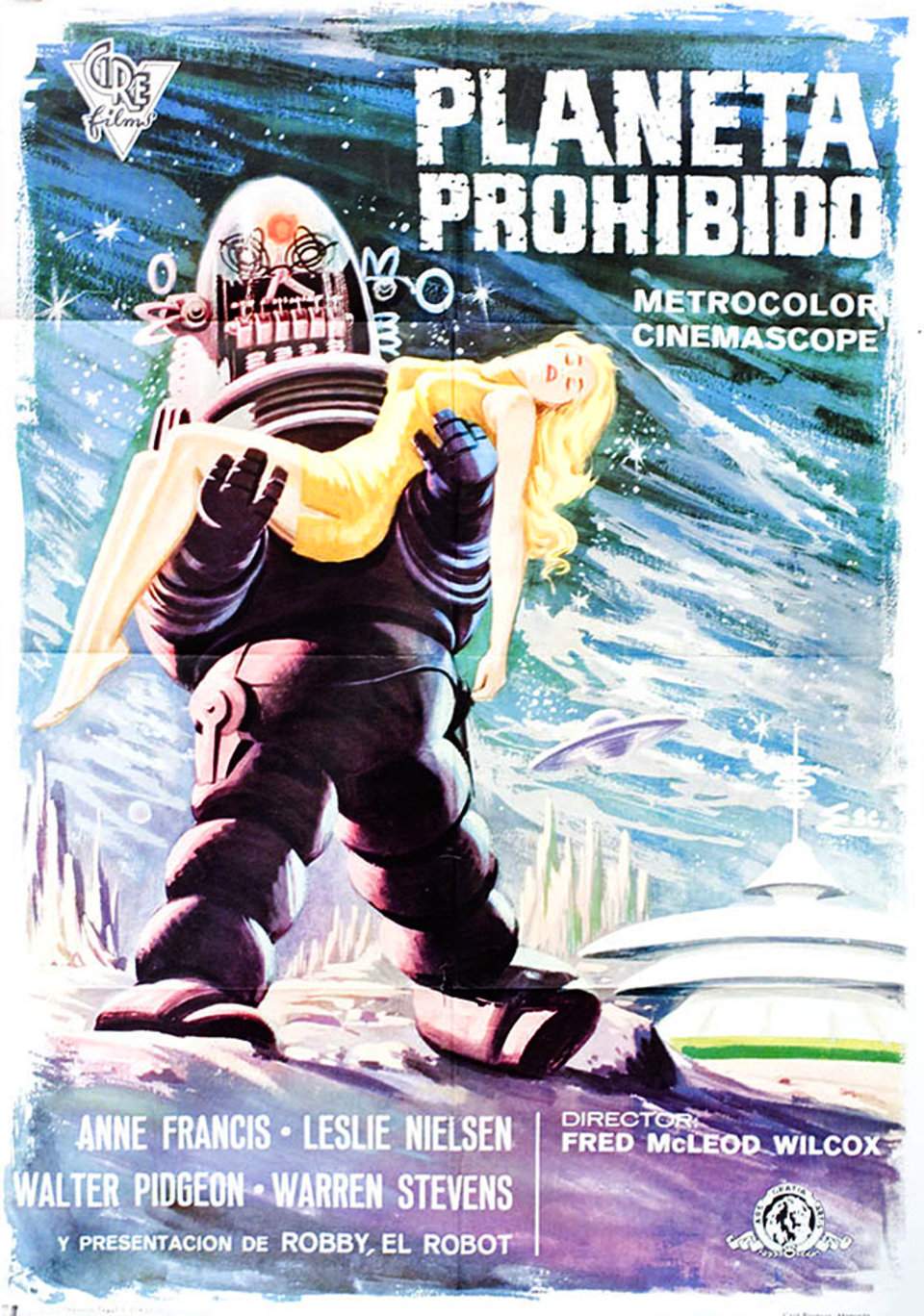 | Robby The Robot ® Forbidden Planet - Popular, glass-domed robot that appeared in a number of films and TV series from the 1950s through the 1980s. Robby the Robot made his debut in the classic science fiction movie Forbidden Planet (1956) as a bulbous mechanical man built by Earth scientist Dr. Morbius using knowledge left by the Krel, a long-dead alien race. Robby is multilingual, and capable of lifting great weights, synthesizing anything from gems to bourbon, and carrying out any domestic chore. Many of the features of B-9, the robot used in Lost in Space, parallel those of Robby. These include a glass head with animated elements, rotating antenna ears, flashing light mouth, and a chest panel with more animated elements.