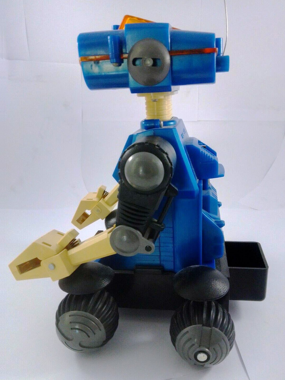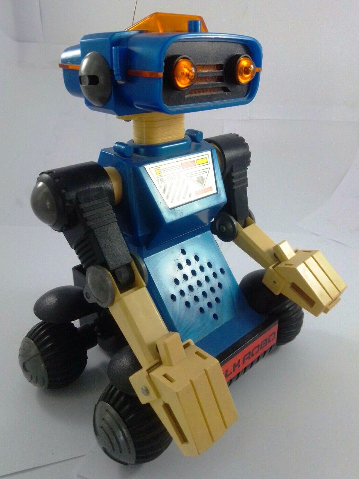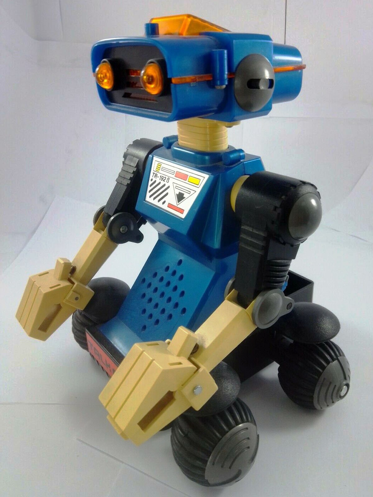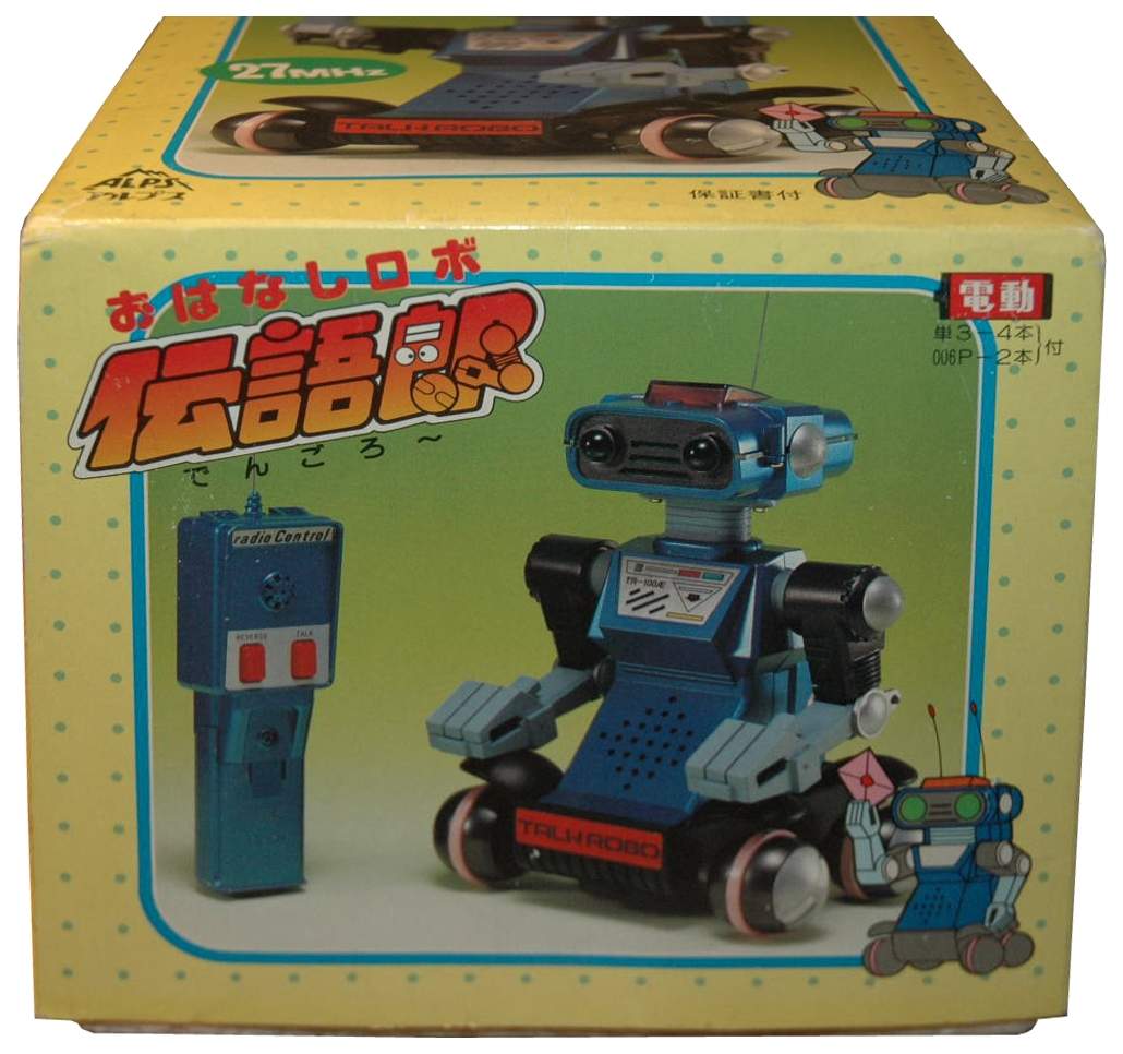 TalkRobo TR-192B - a plastic, battery operated, radio control robot manufactured by Alps in Japan in 1980s. TALKROBO robot is 9" tall (23cm), with a mostly blue body. He has black wheels, base, and upper arms, with white claw hands. The robot moves in circles, both forward and in reverse. When you talk into the remote control unit, your own voice transmits through a speaker inside the robot! TalkRobo operates on 27 MHz frequency. Requires 4 "AA" and 2 9-Volt batteries. . . . TalkRobo by Alps Japan