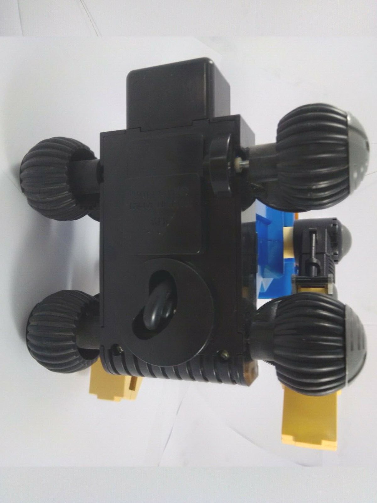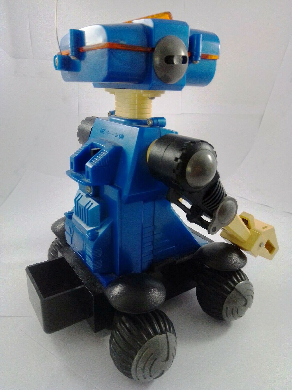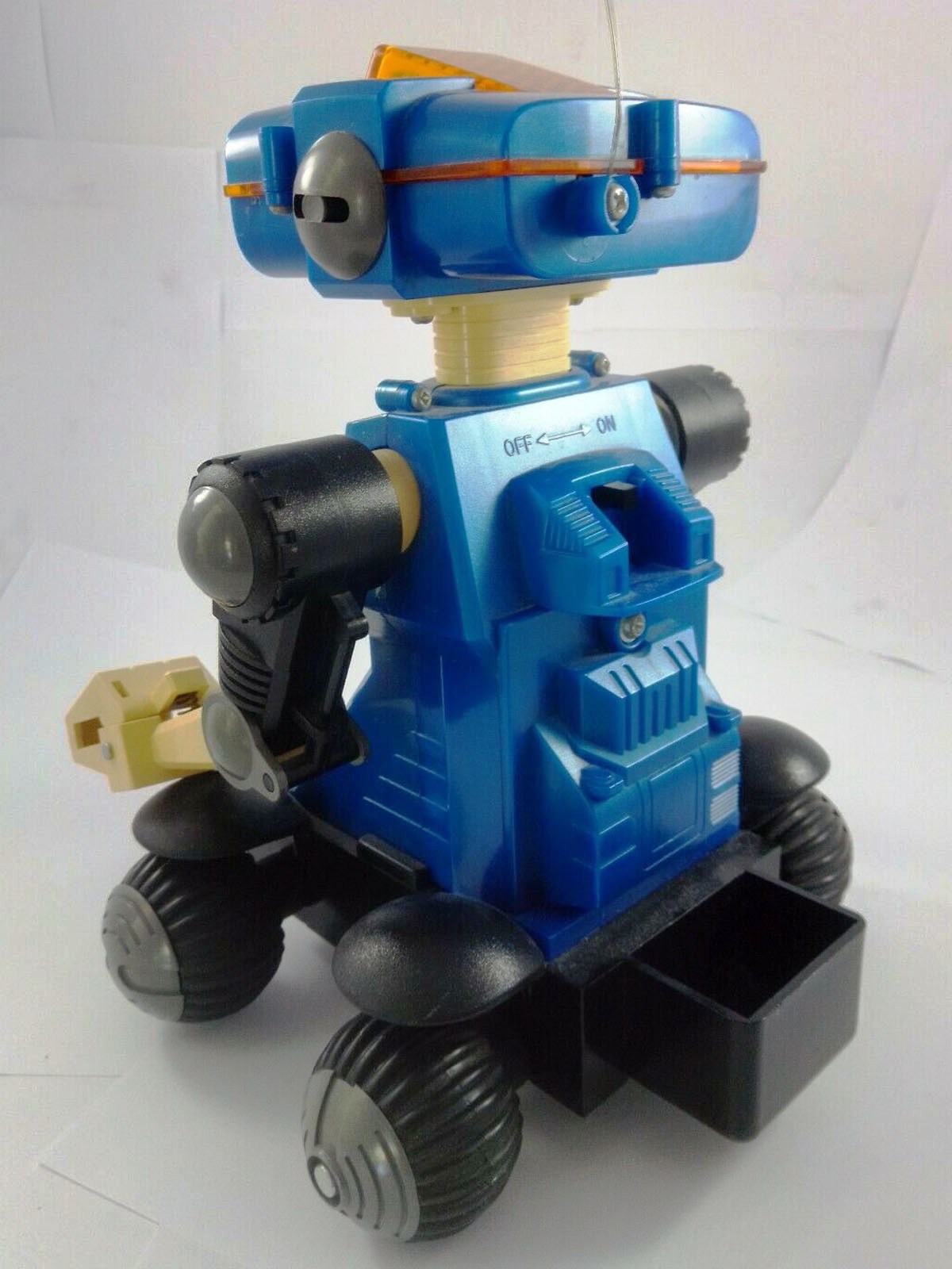 TalkRobo TR-192B - a plastic, battery operated, radio control robot manufactured by Alps in Japan in 1980s. TALKROBO robot is 9" tall (23cm), with a mostly blue body. He has black wheels, base, and upper arms, with white claw hands. The robot moves in circles, both forward and in reverse. When you talk into the remote control unit, your own voice transmits through a speaker inside the robot! TalkRobo operates on 27 MHz frequency. Requires 4 "AA" and 2 9-Volt batteries. . . . TalkRobo by Alps Japan