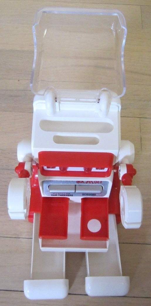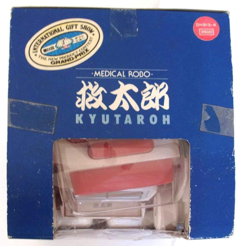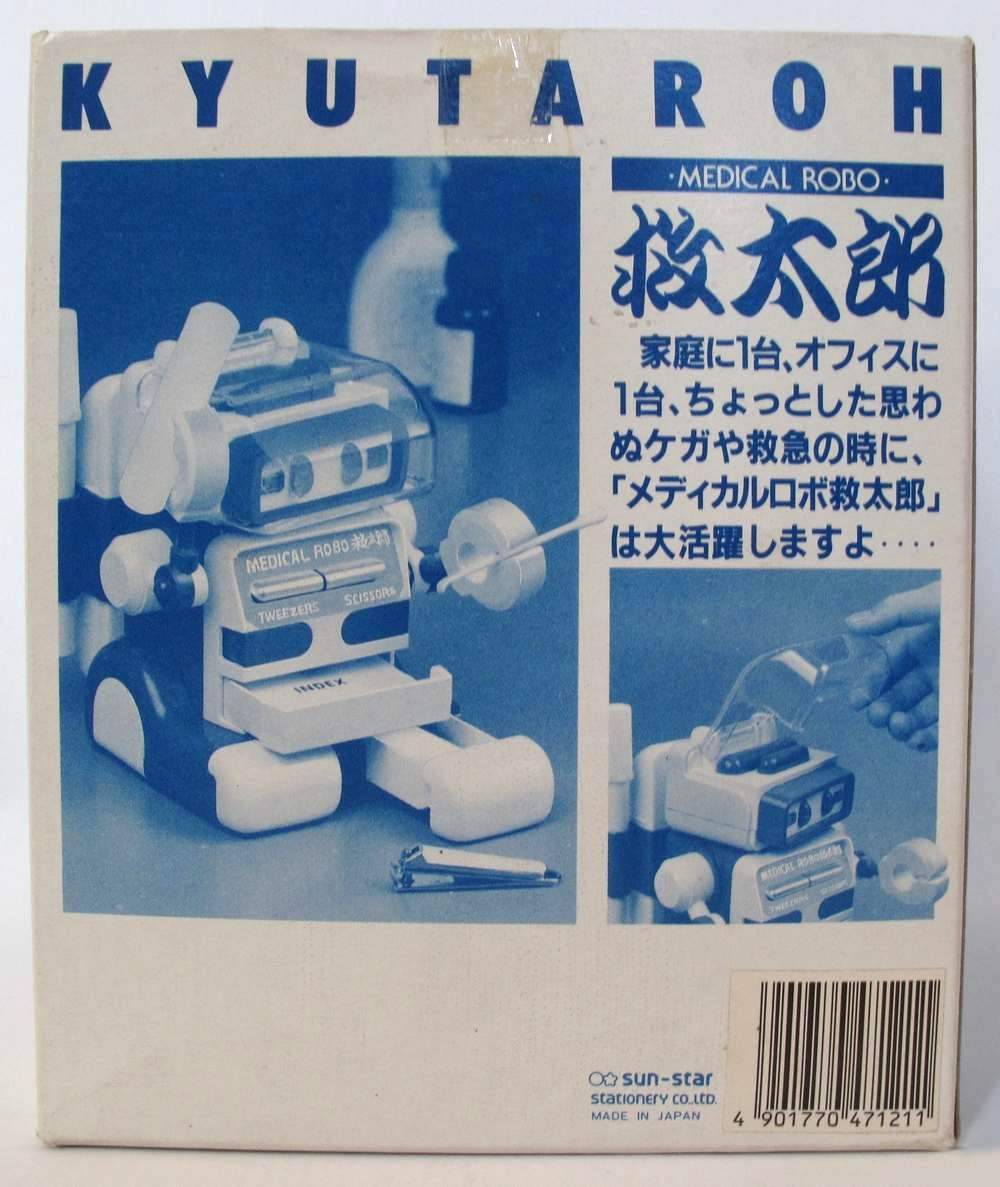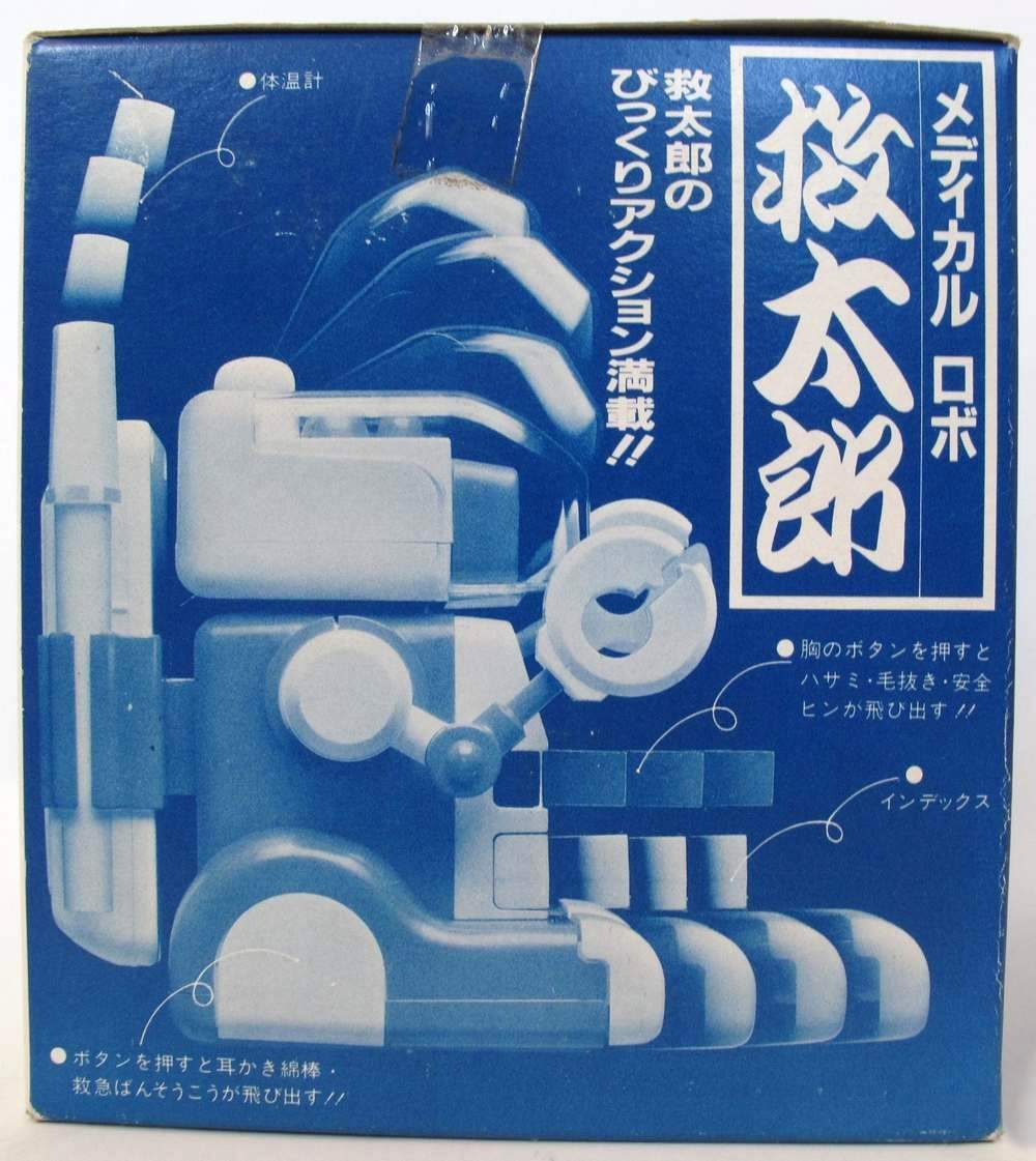 | This is a Medical Robo "Taro" made by a Japanese manufacturer in the 1980's. He comes with a detachable backpack, thermometer, clippers and various drawers and compartments. The Complete List; Head = Nail clippers, Head = Pill case, Right chest = The scissors, Left chest = Tweezers & safety pin, Abdominal = Index (phone book), Right hand-left hand = I pinch thermometer, ( "medical device" ), Back = Thermometer, Back = Portable first-aid kit, Right foot = First-aid adhesive tape, Left foot = Earpick swab. |