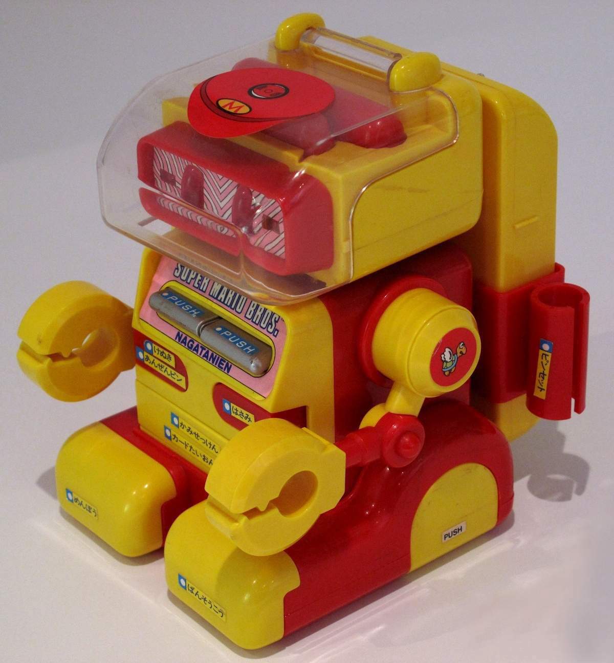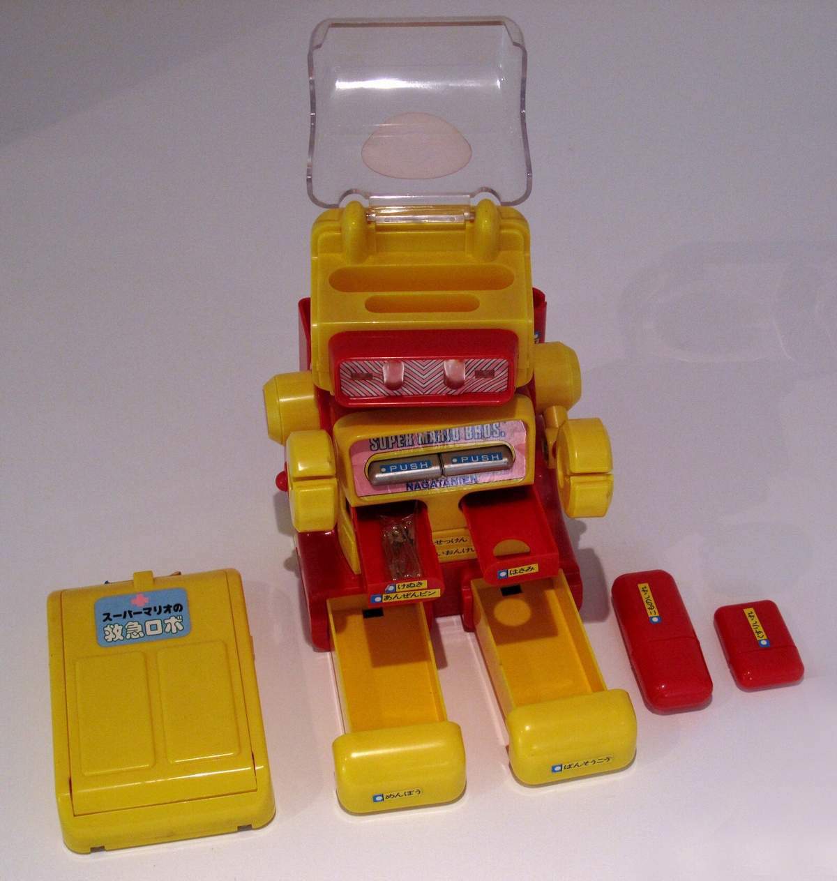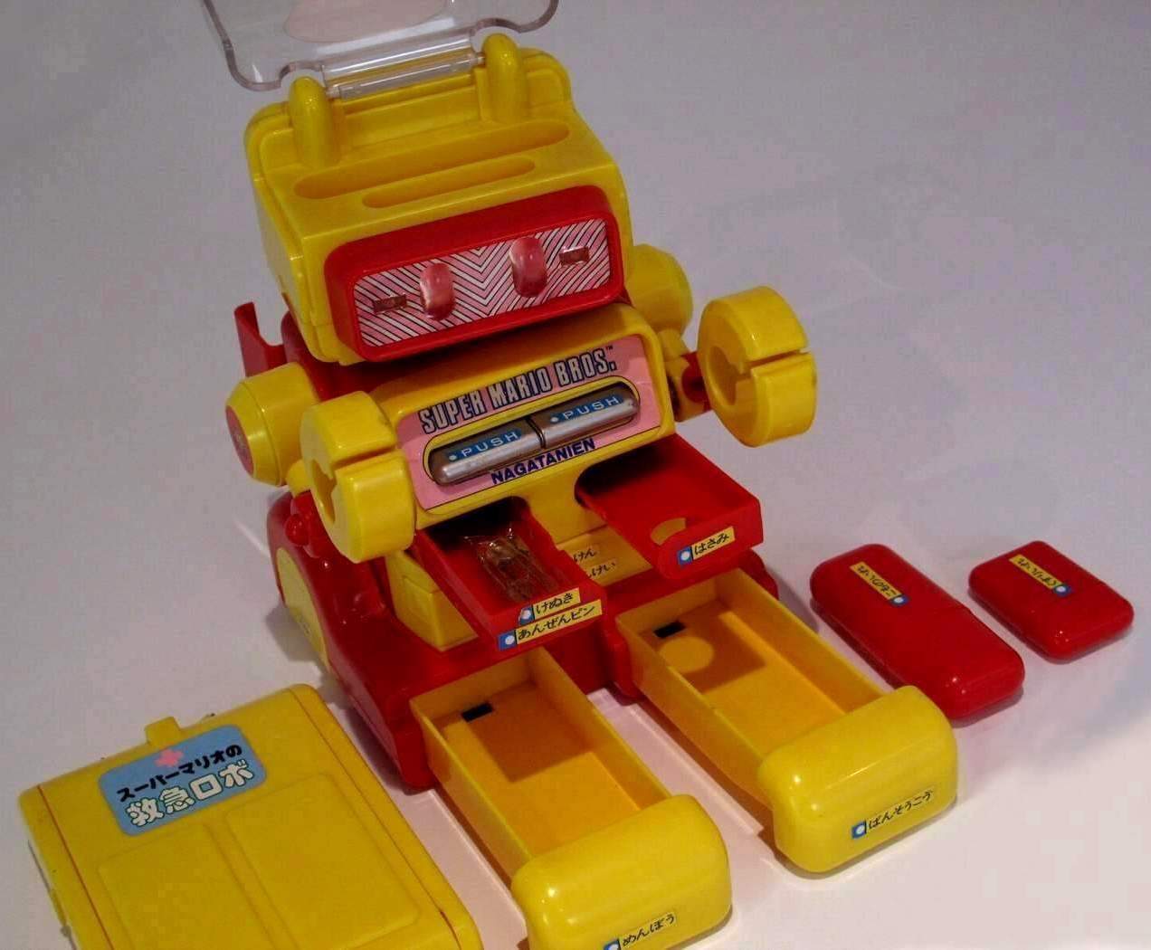 | This is a Medical Robo "Taro" made by a Japanese manufacturer in the 1980's. He comes with a detachable backpack, thermometer, clippers and various drawers and compartments. The Complete List; Head = Nail clippers, Head = Pill case, Right chest = The scissors, Left chest = Tweezers & safety pin, Abdominal = Index (phone book), Right hand-left hand = I pinch thermometer, ( "medical device" ), Back = Thermometer, Back = Portable first-aid kit, Right foot = First-aid adhesive tape, Left foot = Earpick swab. |