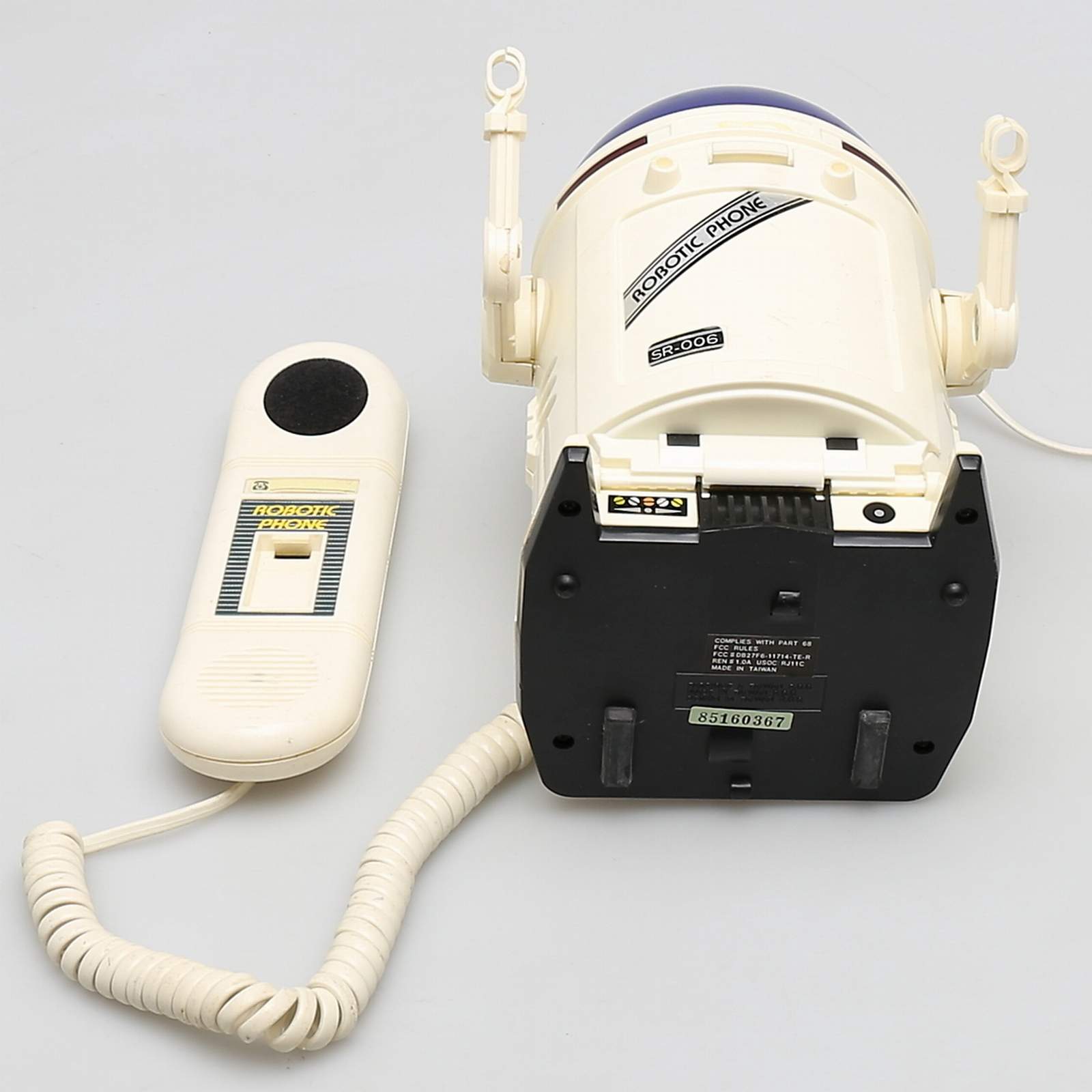 | ROBOTIC PHONE Robot Telephone Spica 1985 Taiwan, a battery operated telephone made in Taiwan in 1985 for Spica USA. Part no. SR-006. A 9in tall -23 cm- plastic domed robot telephone with detached hanset. Black, Red, Silver, White: Attractive, sleek looking design. ; Touch: Sensor dialer, Reset: Cancel and dial again, Redial: Last number redial, Hand set: Attractive design for children, Durable plastic construction, Pulse dialing, Built in buzzer, FCC approved |