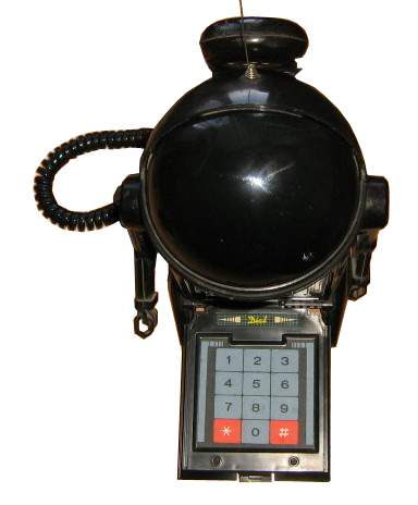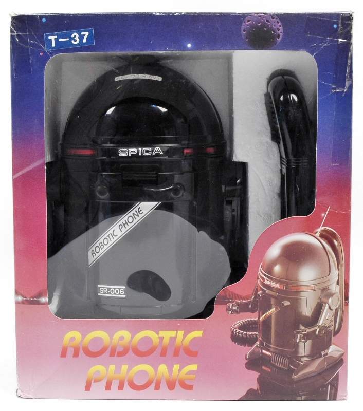 ROBOTIC PHONE Robot Telephone Spica 1985 Taiwan, a battery operated telephone made in Taiwan in 1985 for Spica USA. Part no. SR-006. A 9in tall -23 cm- plastic domed robot telephone with detached hanset.