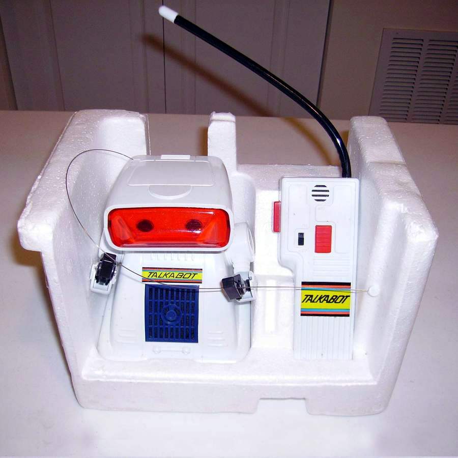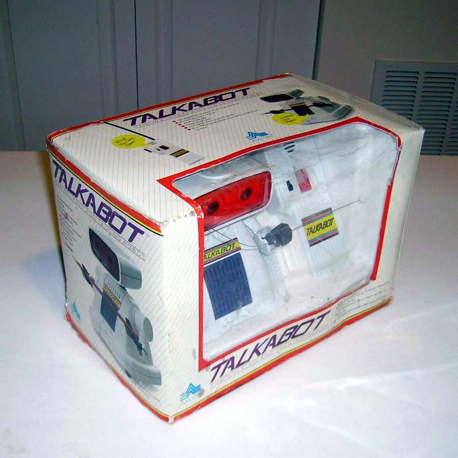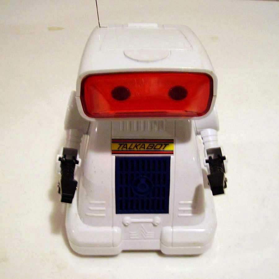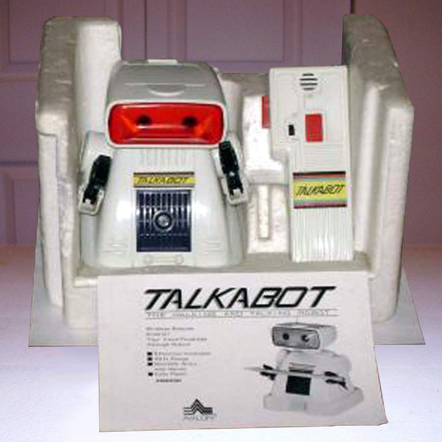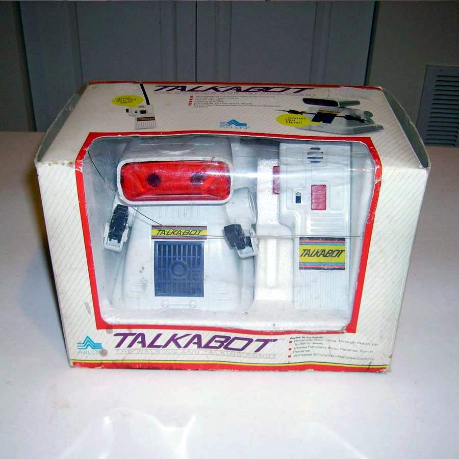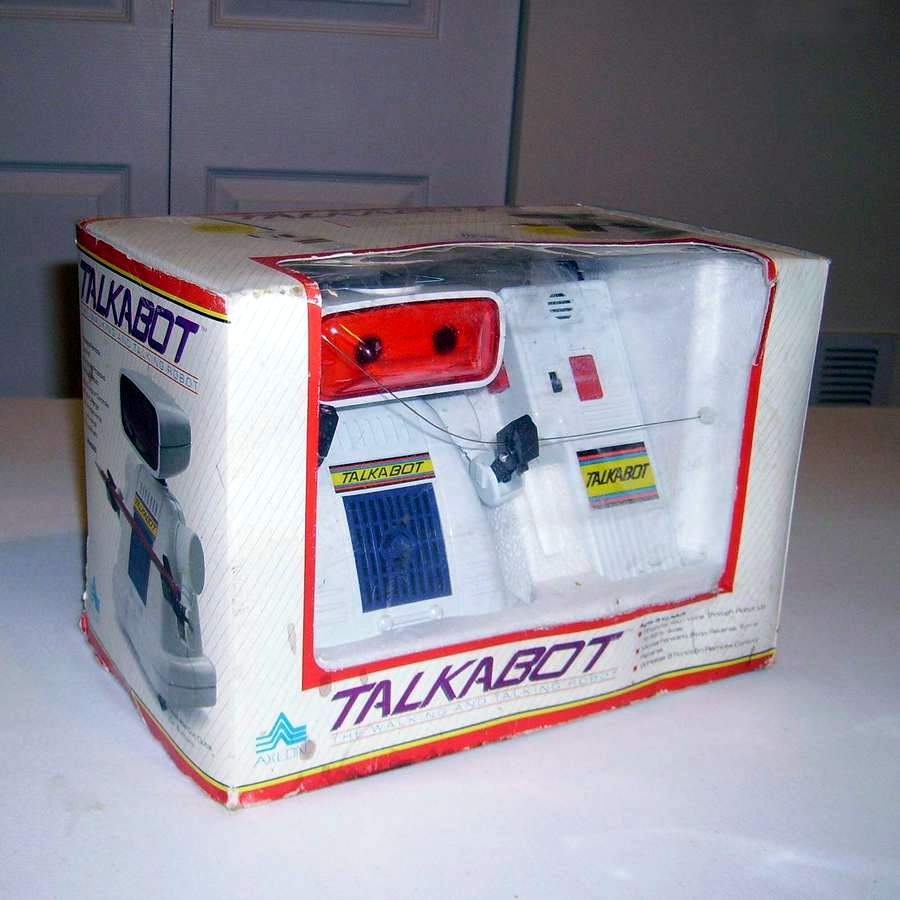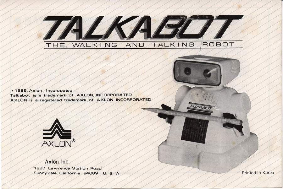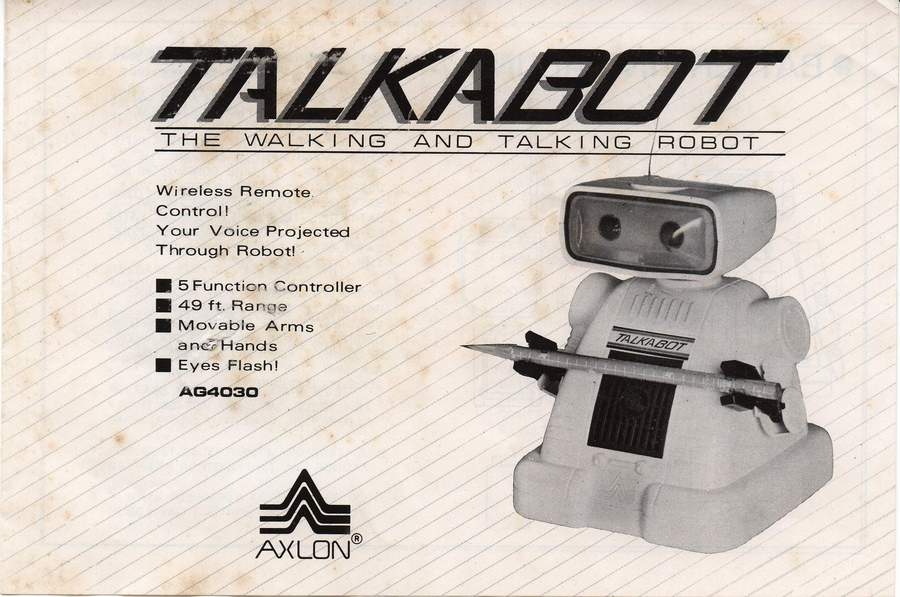 | Talkabot Remote Control Walking and Talking Robot - AG4030 by Axlon ® 1985 - Talkabot The Walking and Talking Robot, a "Remote Control Robot" battery operated space toy is 6" tall (15 cm), mostly white, with a red tinted shield on his face, and a speaker in his chest. Wireless 5 wireless function remote control, Controller has built in microphone, 49 ft. range, Eyes flash as it moves, Movable arms and hands, Moves forward, stop, reverse, turn in reverse, Fun cut-out obstacles on bottom of box! Requires 2 9-volt batteries and 4 AA batteries. Made in Korea 1985 for Axlon.