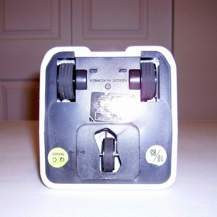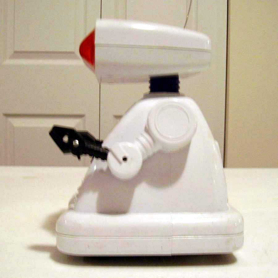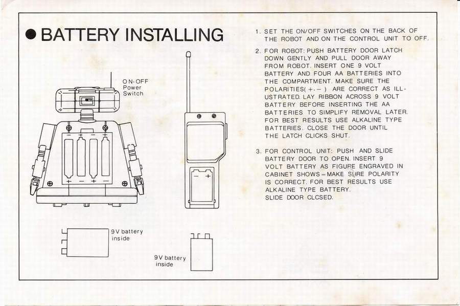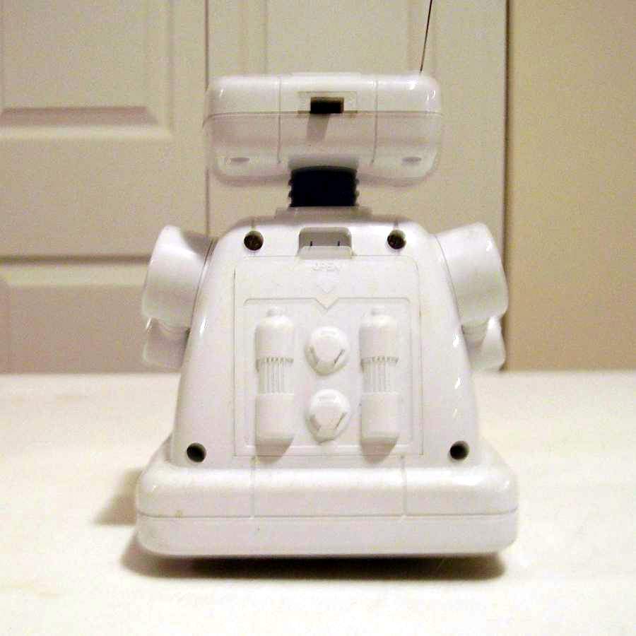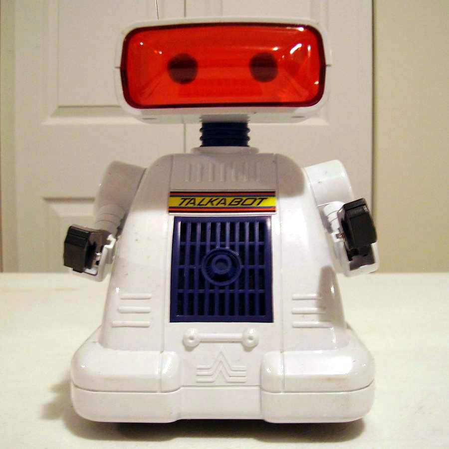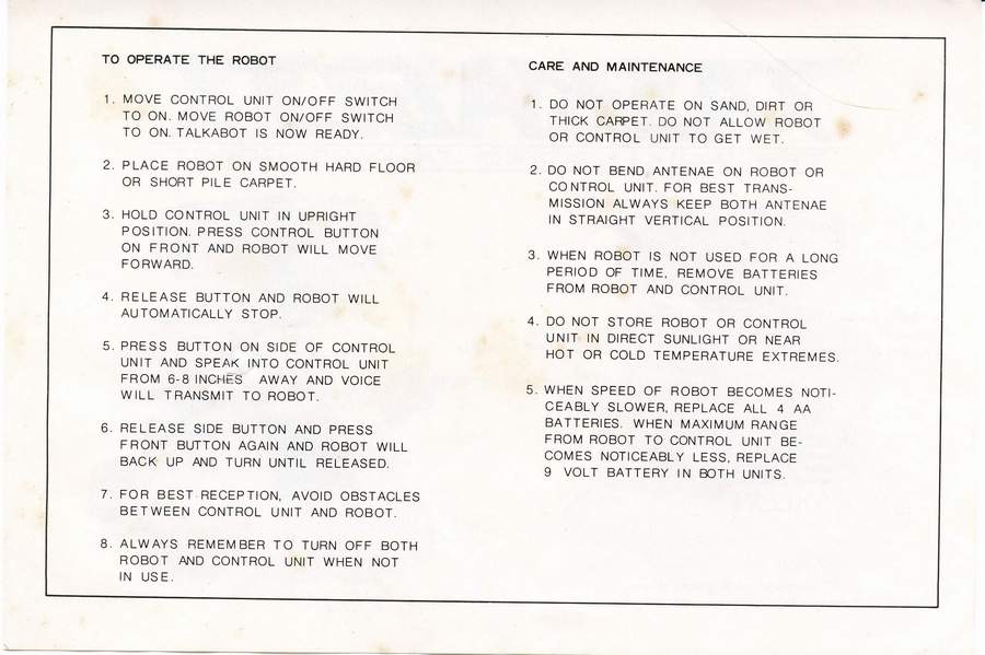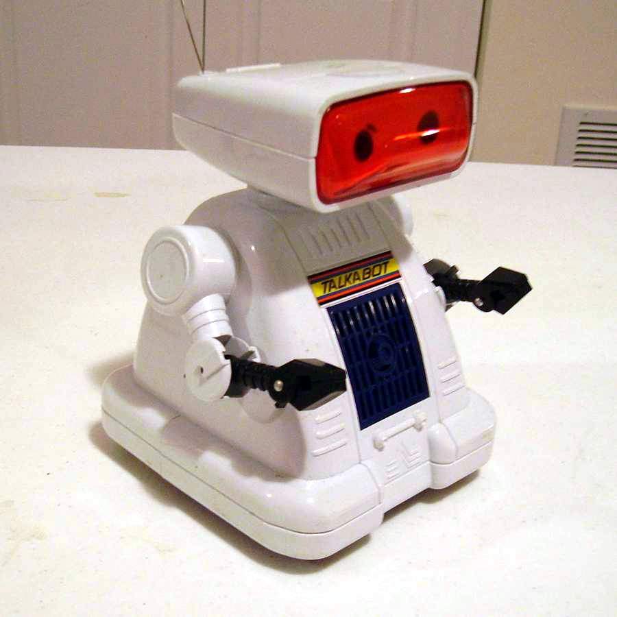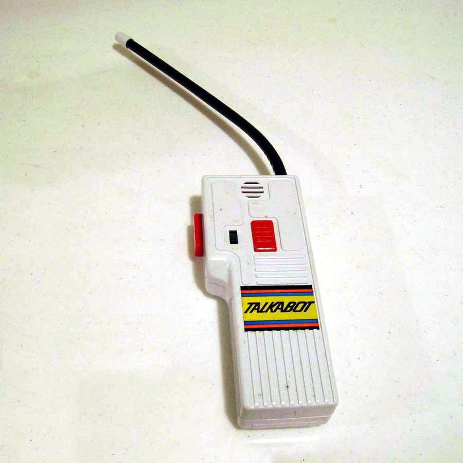 | Talkabot Remote Control Walking and Talking Robot - AG4030 by Axlon ® 1985 - Talkabot The Walking and Talking Robot, a "Remote Control Robot" battery operated space toy is 6" tall (15 cm), mostly white, with a red tinted shield on his face, and a speaker in his chest. Wireless 5 wireless function remote control, Controller has built in microphone, 49 ft. range, Eyes flash as it moves, Movable arms and hands, Moves forward, stop, reverse, turn in reverse, Fun cut-out obstacles on bottom of box! Requires 2 9-volt batteries and 4 AA batteries. Made in Korea 1985 for Axlon.