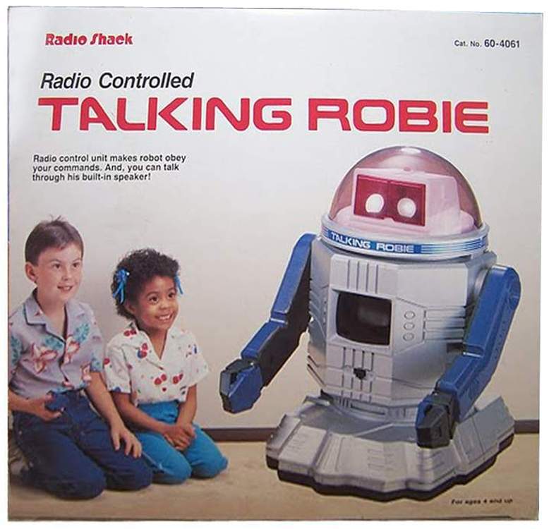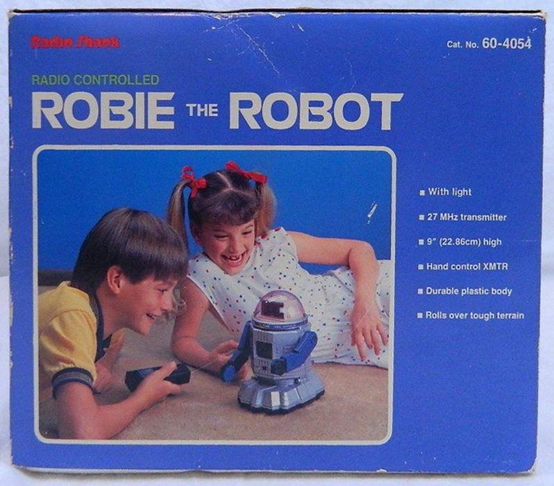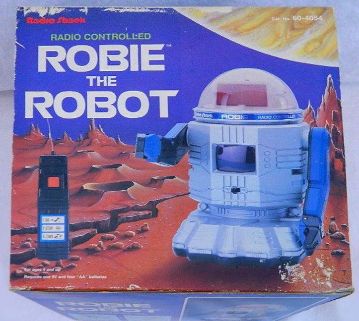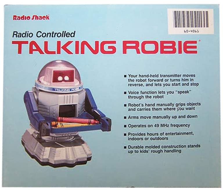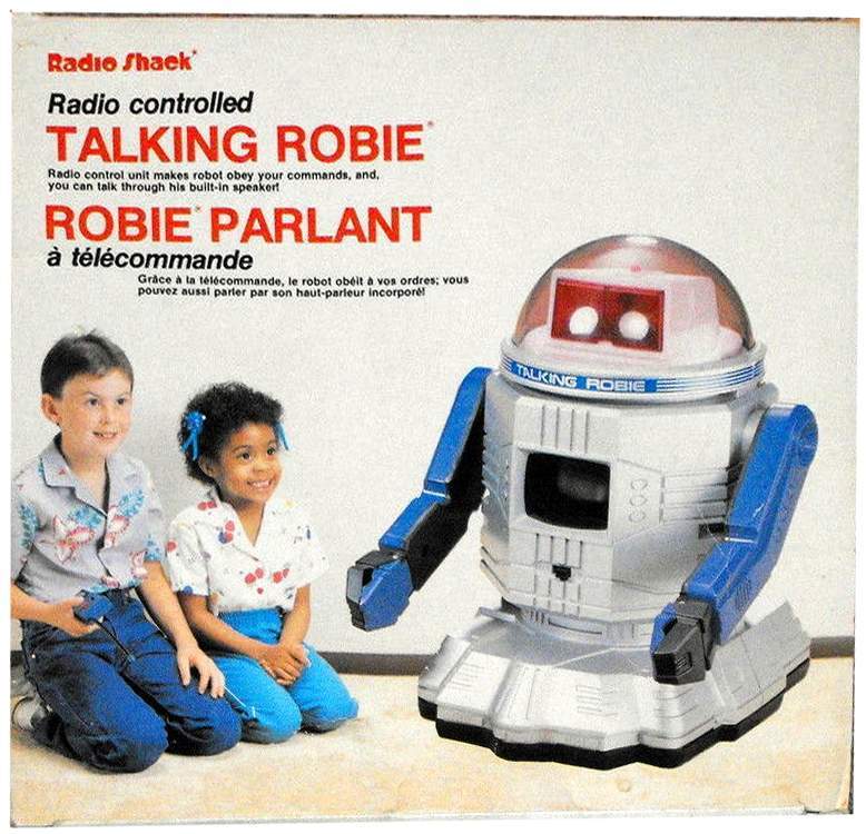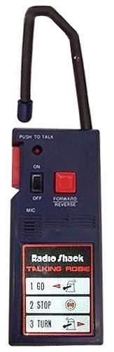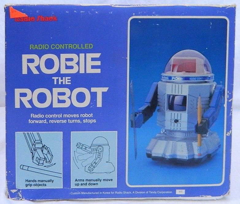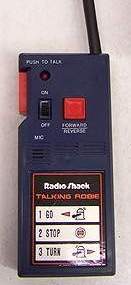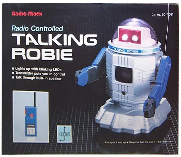 Talking Robie ® and Robocom ® - Voice Recognition Robot from 1984, Talking Robie ® made by Radio Shack ® - You are now in total control of your very own robot. And you can make it say anything you want! Your talking Robie responds to your radio control signals and goes where you wish. Then by pressing the voice transmit button on your hand-held control unit, while you speak into the built-in mic, Robie will broadcast your robot's voice through its speaker, Robie's eyes will light for special effects. And its arms can be positioned so its grasping hands hold objects, too.