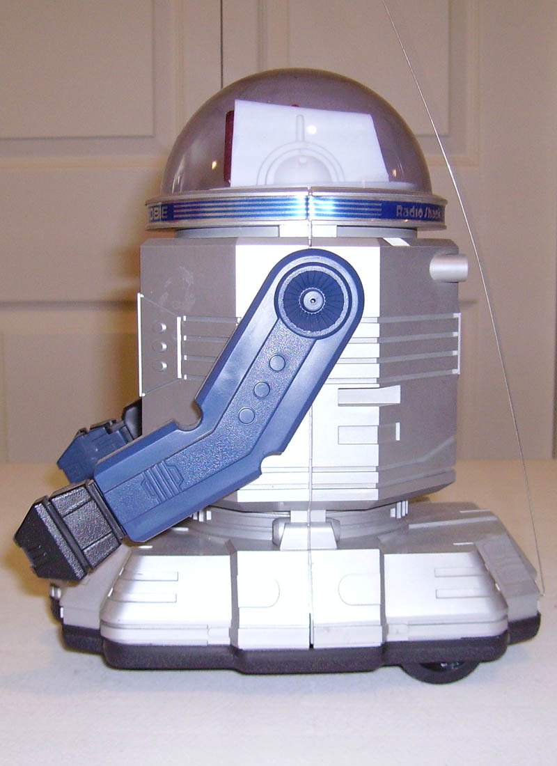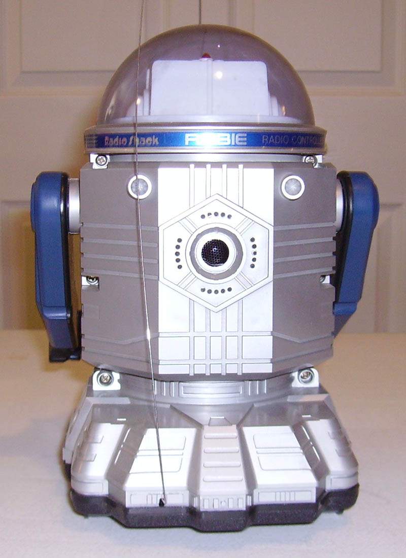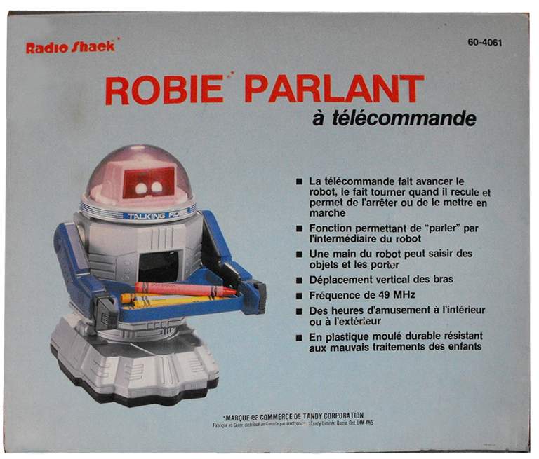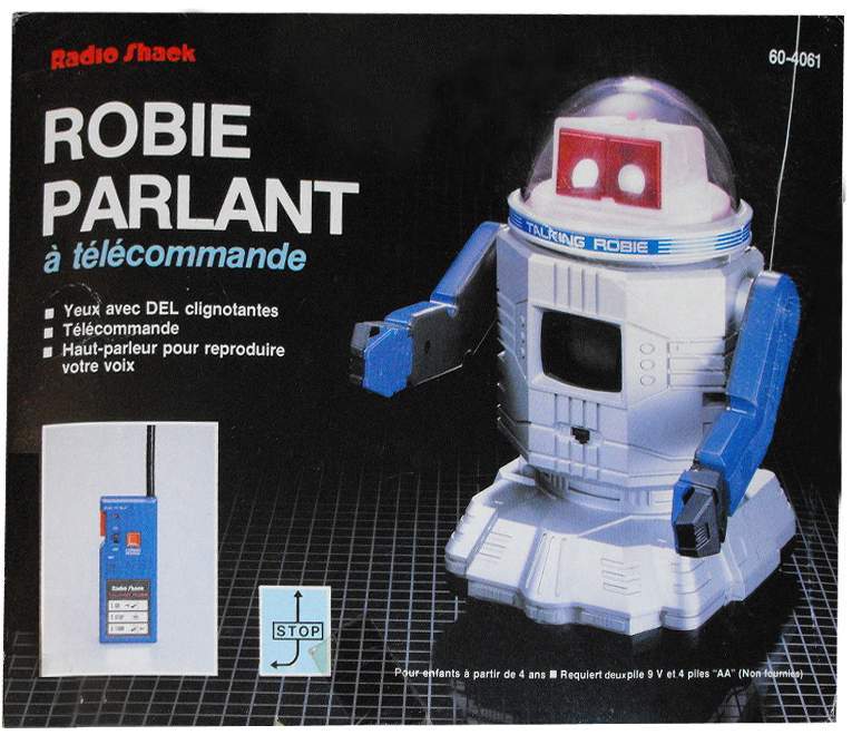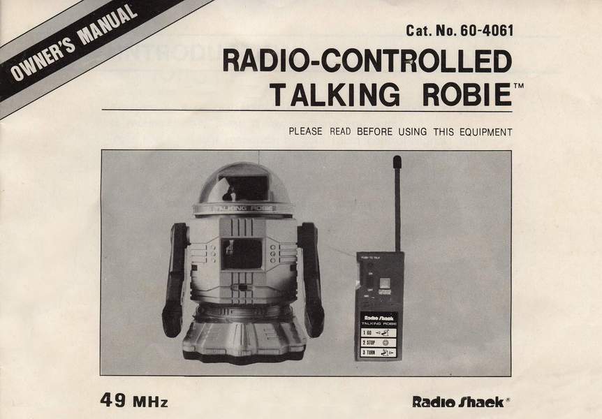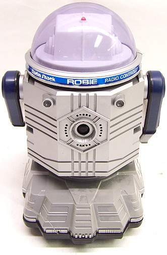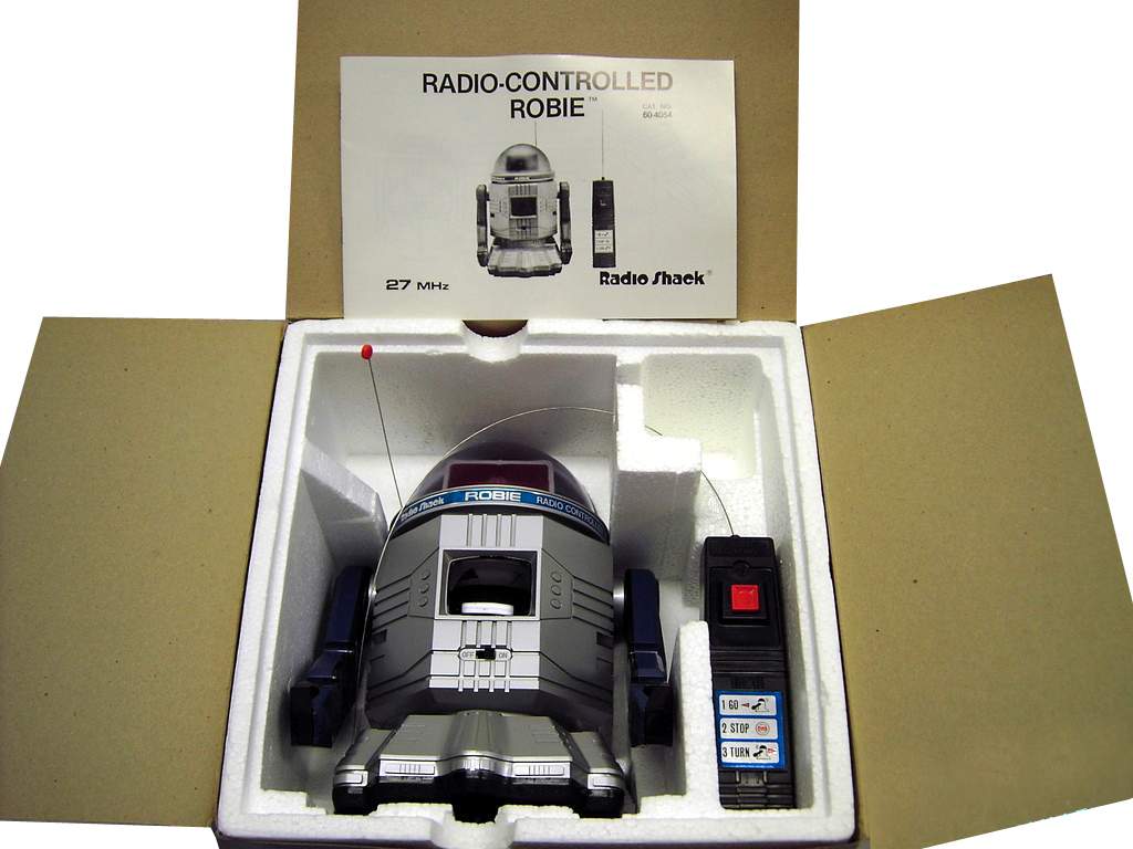 Talking Robie ® and Robocom ® - Voice Recognition Robot from 1984, Talking Robie ® made by Radio Shack ® - You are now in total control of your very own robot. And you can make it say anything you want! Your talking Robie responds to your radio control signals and goes where you wish. Then by pressing the voice transmit button on your hand-held control unit, while you speak into the built-in mic, Robie will broadcast your robot's voice through its speaker, Robie's eyes will light for special effects. And its arms can be positioned so its grasping hands hold objects, too.