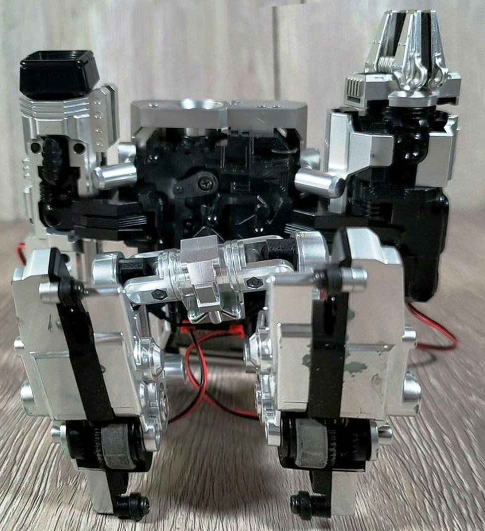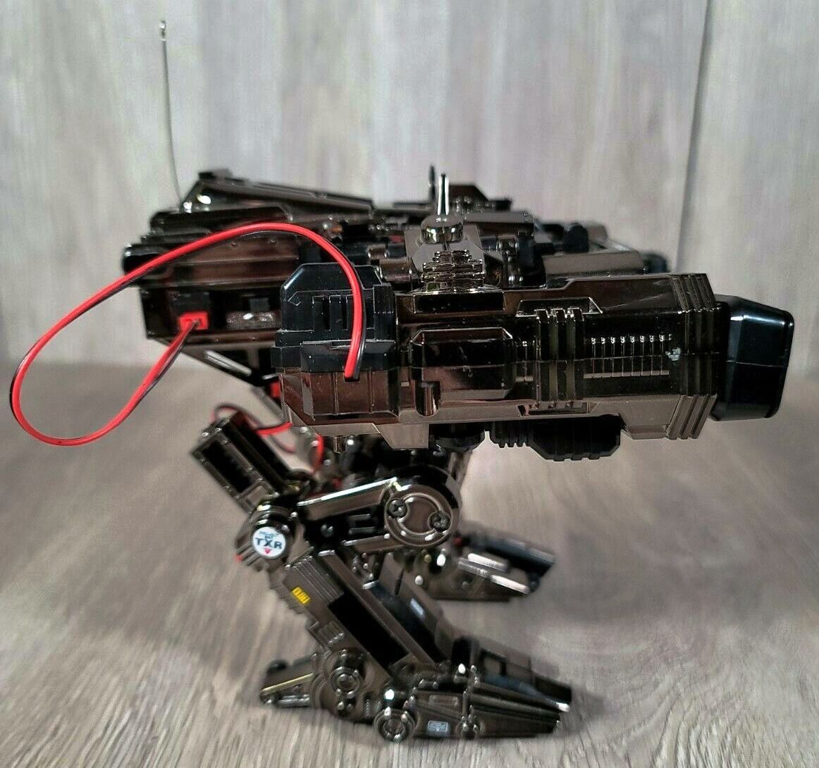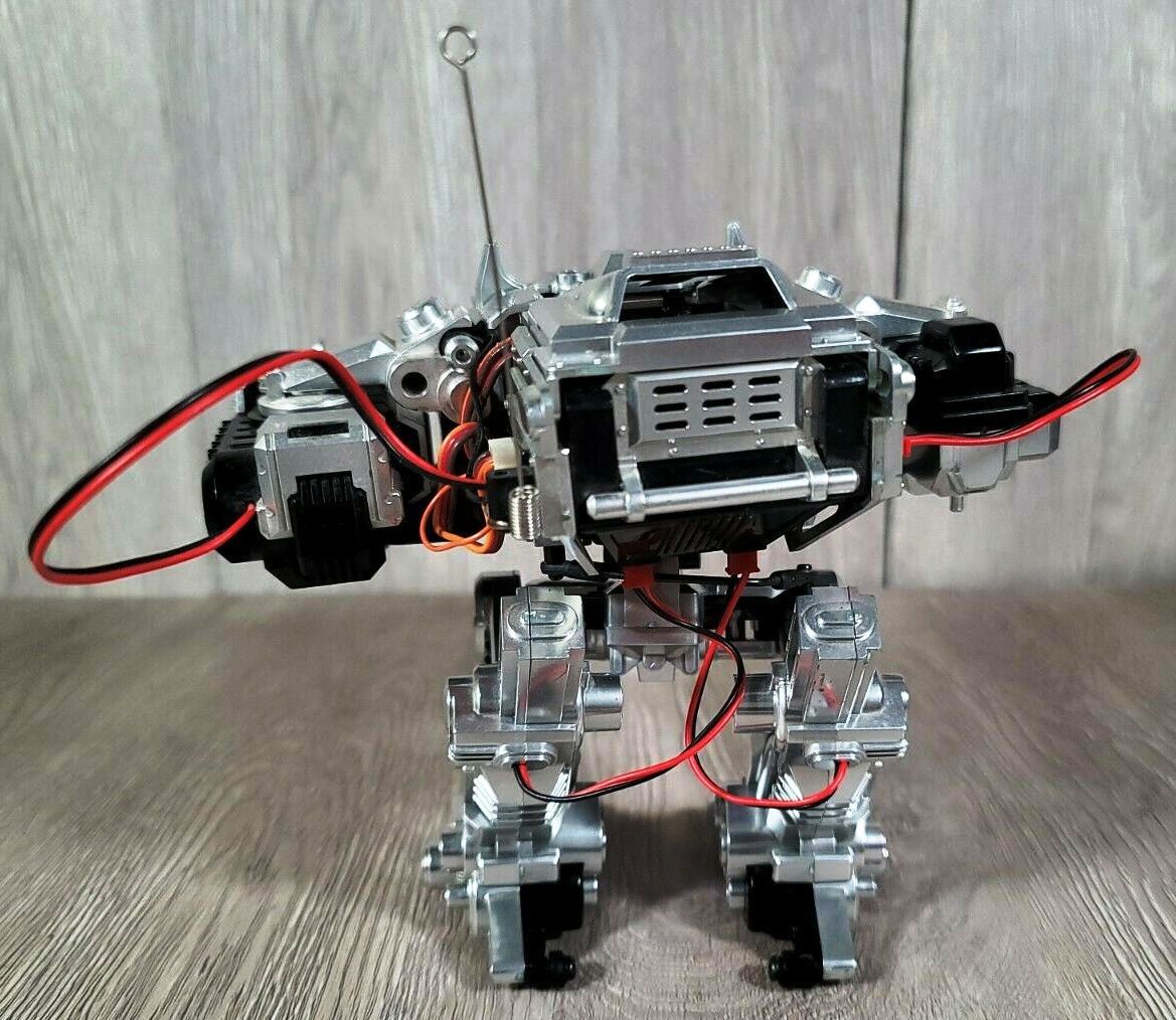 | The TXR-002 by Tomy ® Was originally designed more than twenty years ago. The TXR-002 was a four channel, R/C controlled robot that was sold in Japan and the UK. It has a JR digital proportional multifunction radio, inside micro servos, controler, dual leg motors, transmitter and a receiver. Both arms are fully controlable, right arm has gripper claw, left arm has flood light and a air powered BB gun arm that shoots plastic BB's. It moves forwards, backwards, left and right and the upper body turns left, right, up and down. TXR-002 by Tomy, Made in Japan