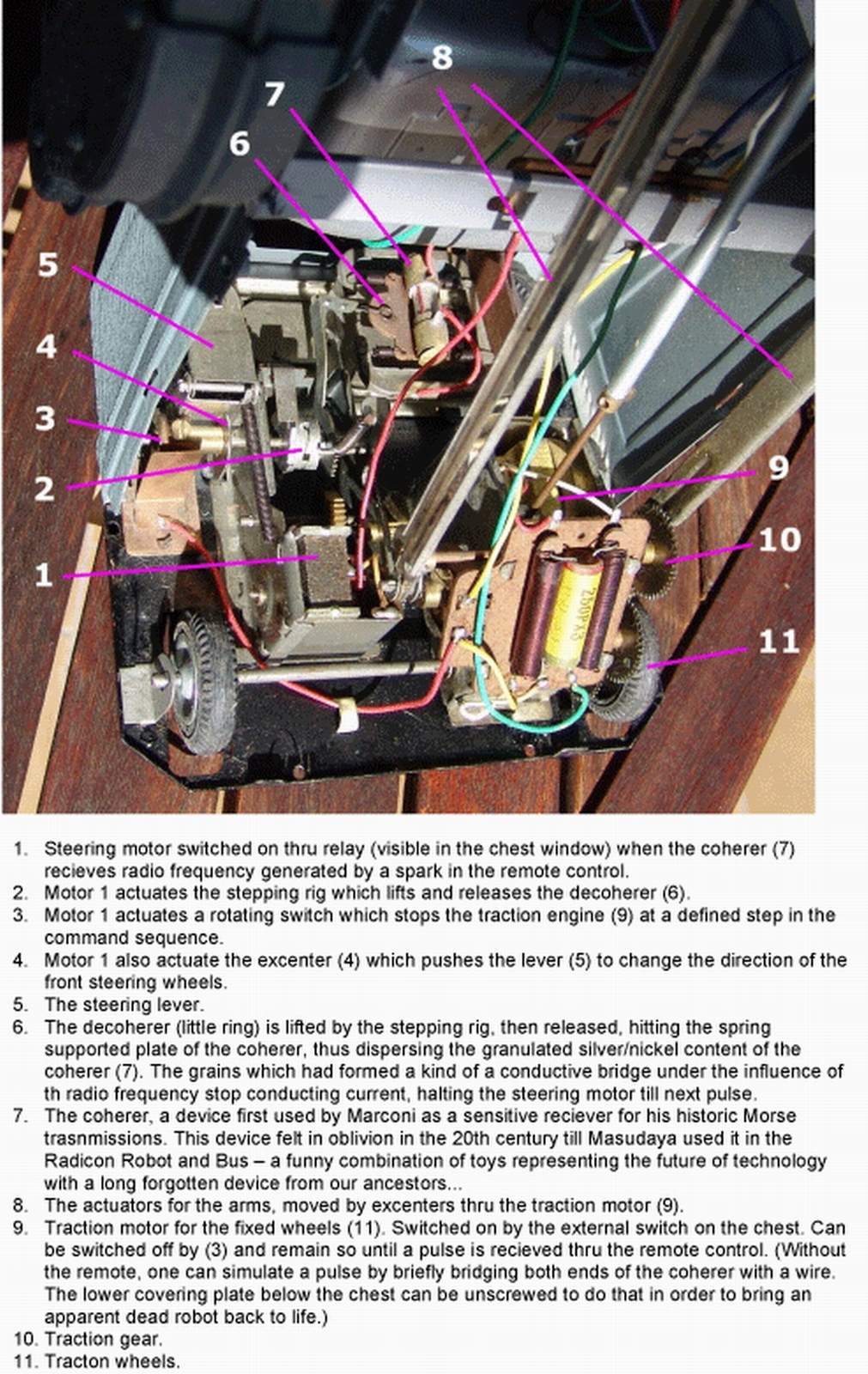 This 1957 build robot is controlled by a remote that takes 3 big battaries, the robot itself takes also 3 big battaries. The robot can be started with a single push on the red button of the remote and it makes the robot go in several sequenses: forward, left, right, stop with swinging arms, "clicking" contact in the chestplate, light and of course his ear spins. On the left of his "ear" goes a big antenna to receive the commands given by the remote. The remote itself has also a pretty big antenna to sent out the commands. The technique used in this robot for remote control is very old and therefore complicated and is based on the basics of sending and receiving.